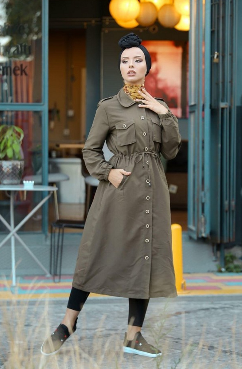 Trench-coat de ville et Robe boutonnee mi-longue pour femme - Couleur kaki