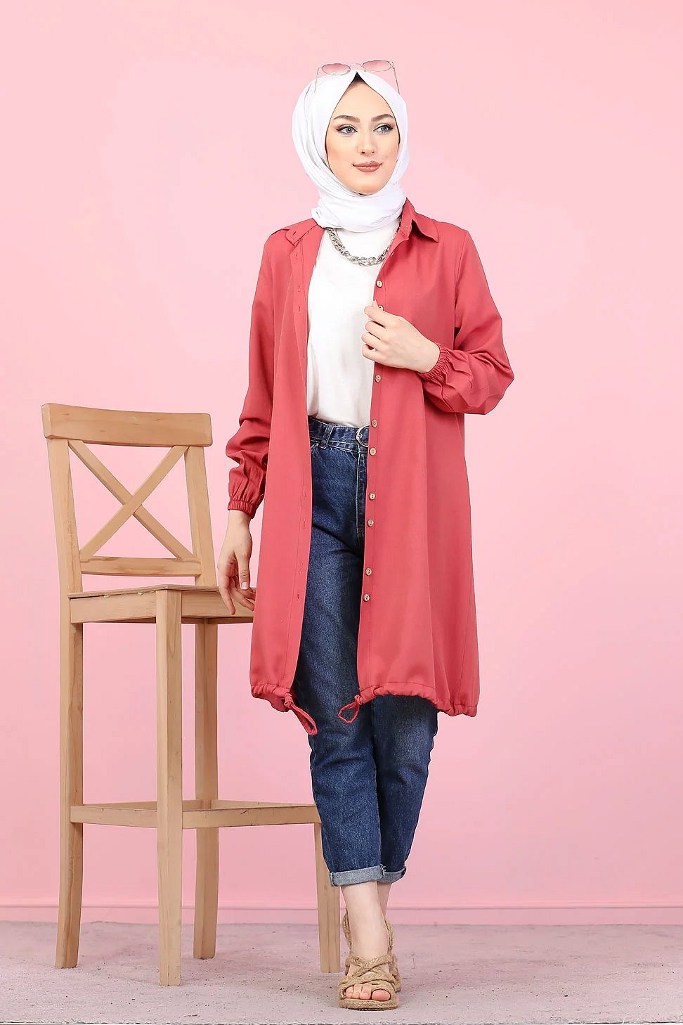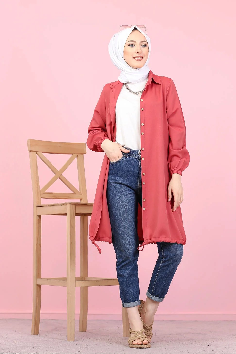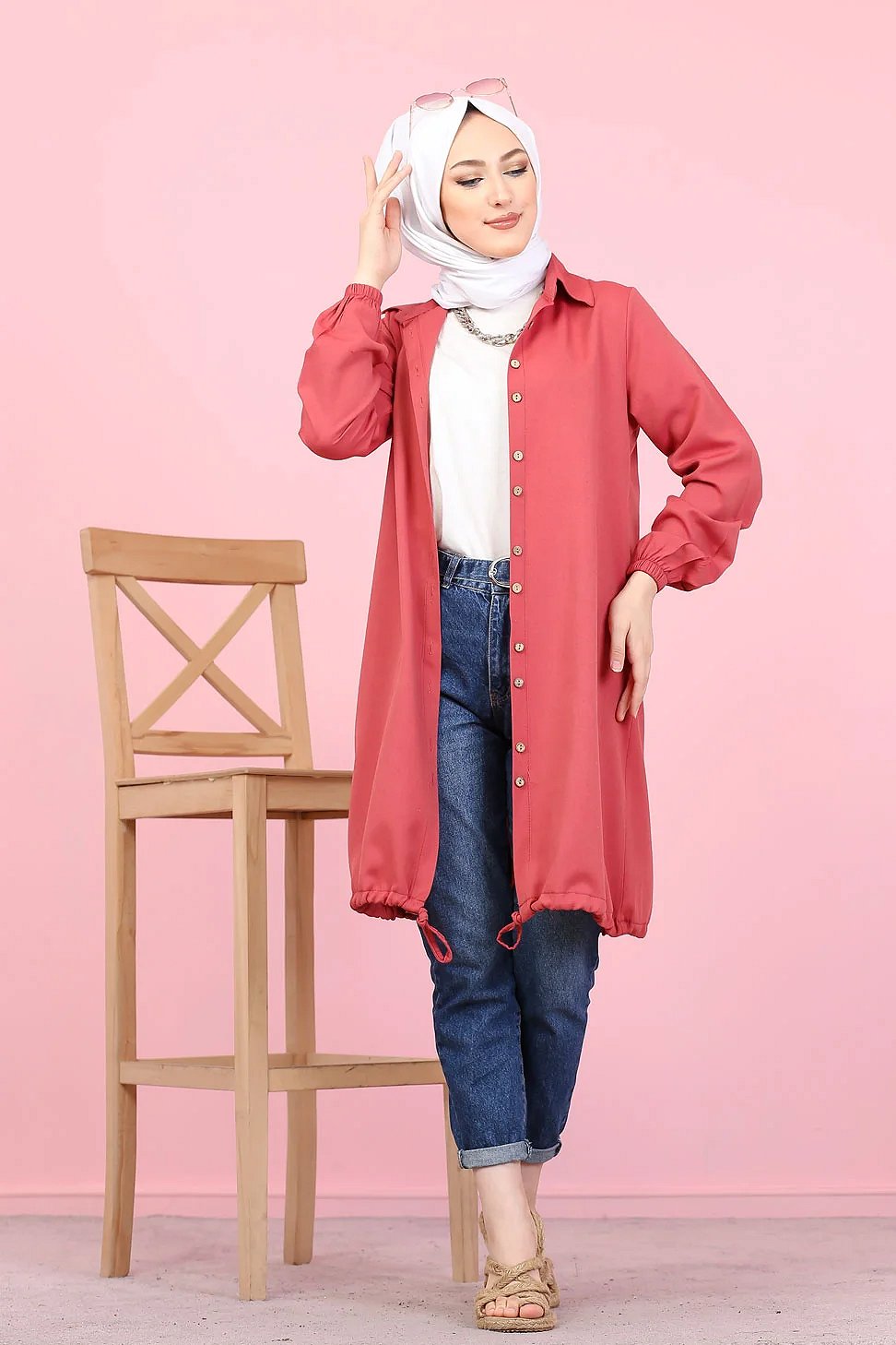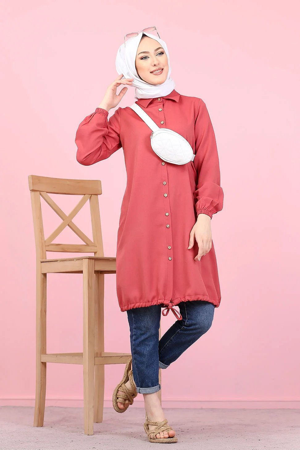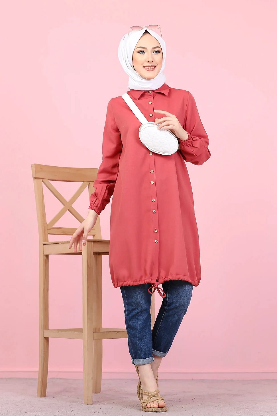 Tunique-Chemise casual ample boutonnée (Vetement décontracté femme voilée) - Couleur Rose foncé Vetement & Accessoire