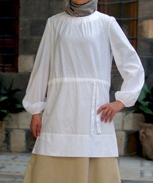 Elegance and modesty define this classic tunic. Carefully placed pleats, a perfectly measured drawstring and elasticized cuffs display the thoughtfulness of its tailoring. The material on this tunic is lightweight but slightly sheer, so we do recommend wearing an undershirt with it. Please see our Modal Undershirt or Long Modal Undershirt.