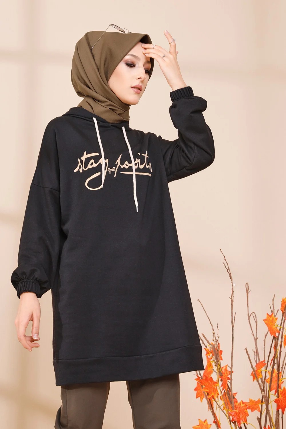 Tunique avec capuche imprimé "Like a cute baby" (Tenue Moderne Hijab) - Couleur bleu marine - REF. 37724 (26.00 €) - En Promotion à 19.90 €