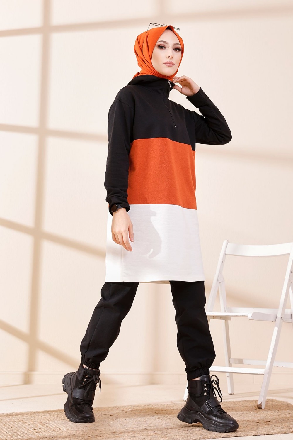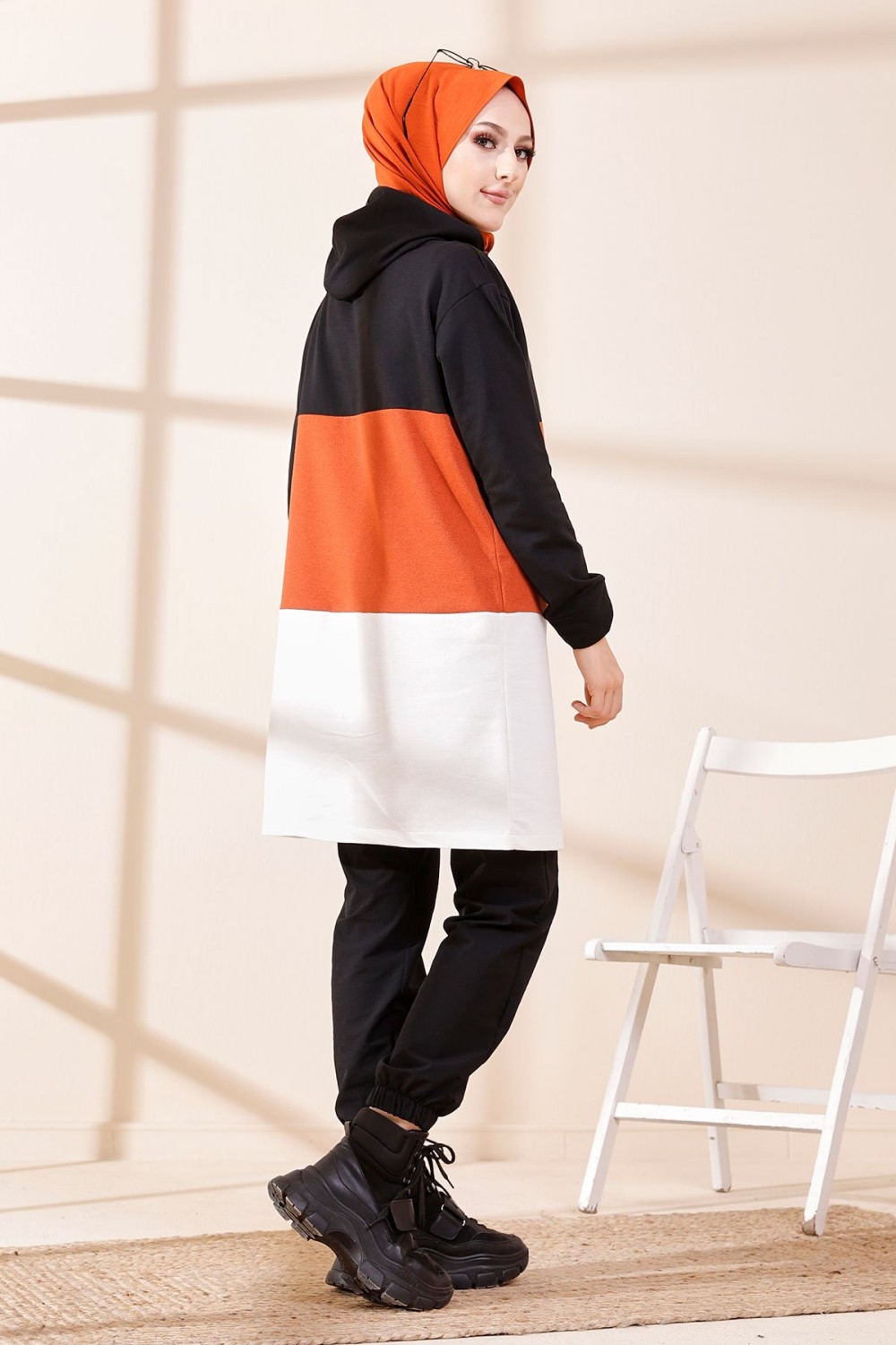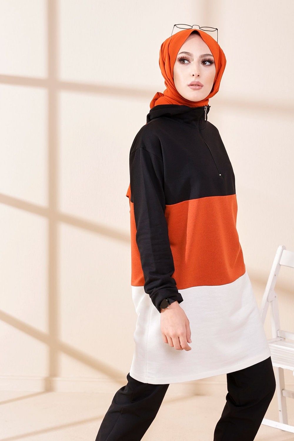Tunique à capuche tricolore (Vêtement décontracté moderne pour femme voilée) - Couleur noir, blanc et rouille Vetement & Accessoire