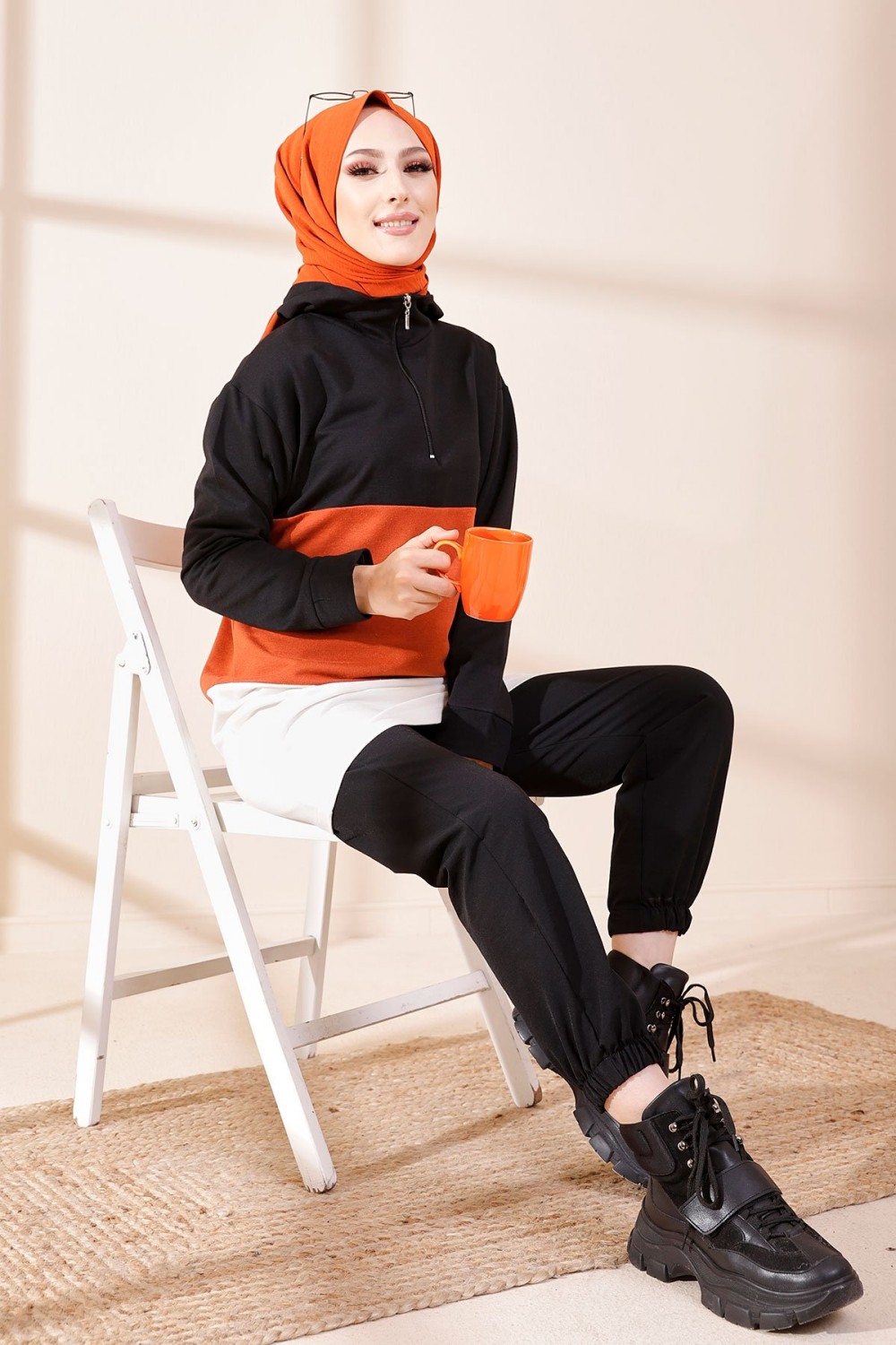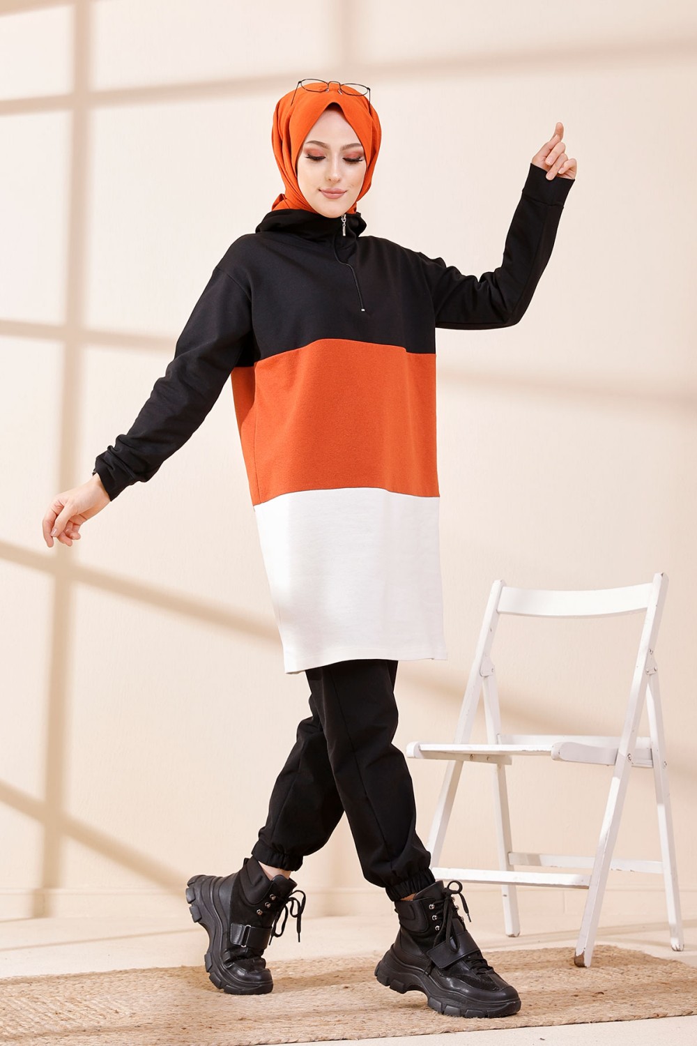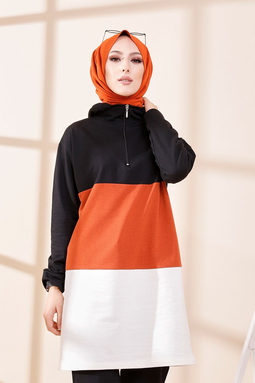 Tunique à capuche tricolore (Vêtement décontracté moderne pour femme voilée) - Couleur noir, blanc et rouille Vetement & Accessoire