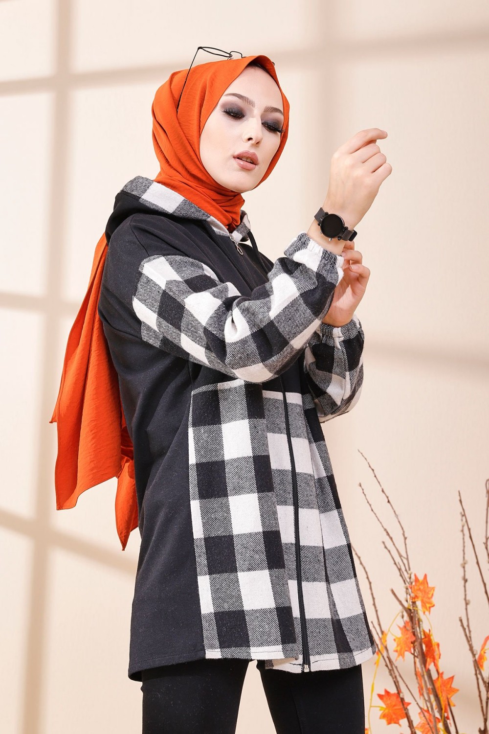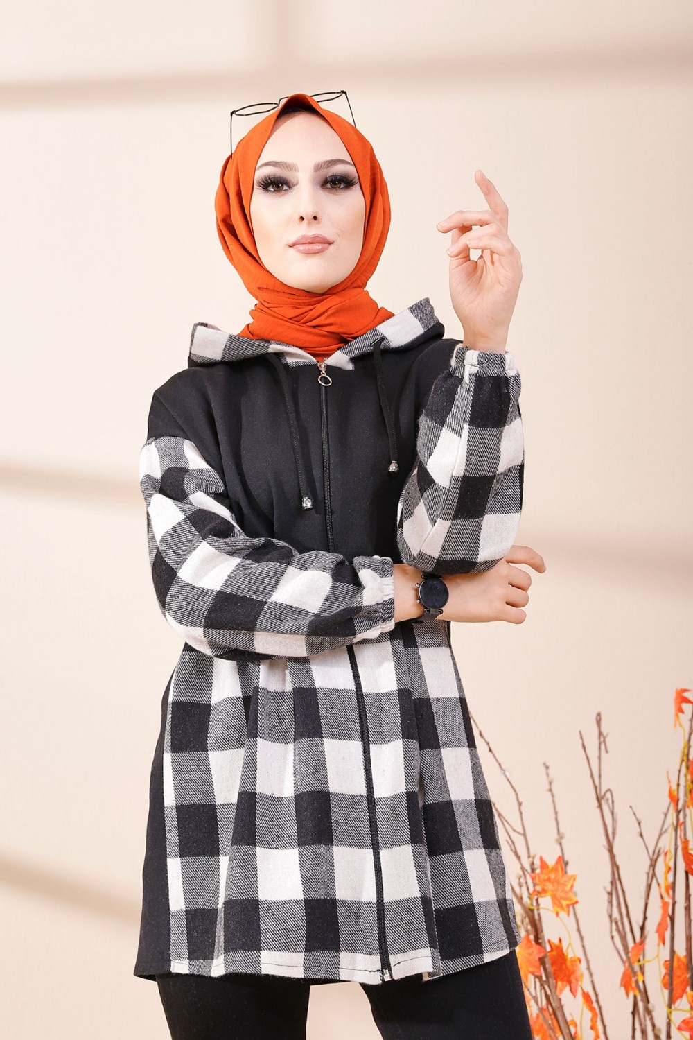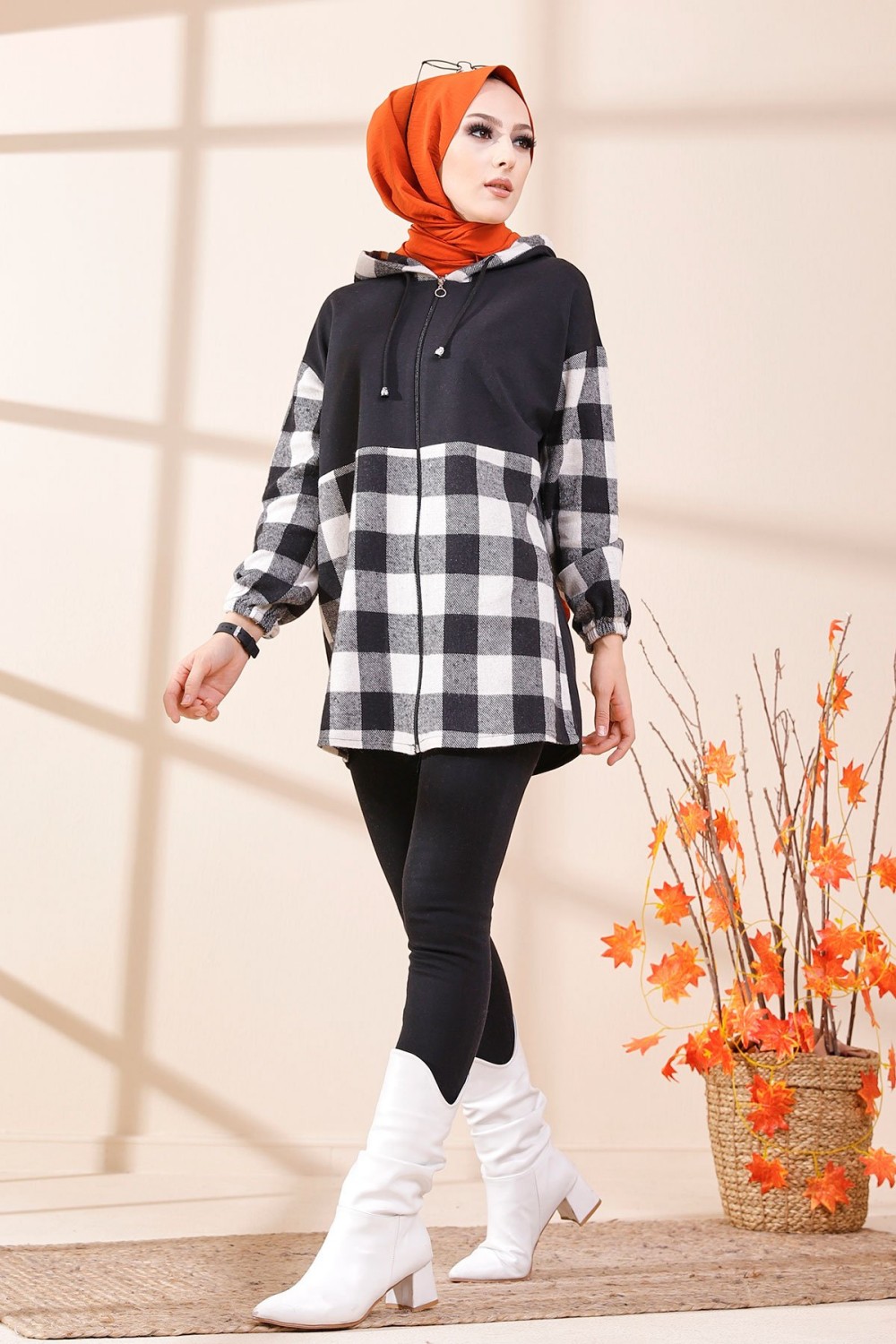 Chemise longue pour femme (Mode musulmane pas cher) - Tunique à carreaux écru et noir - REF. 33967 (19.90 €)