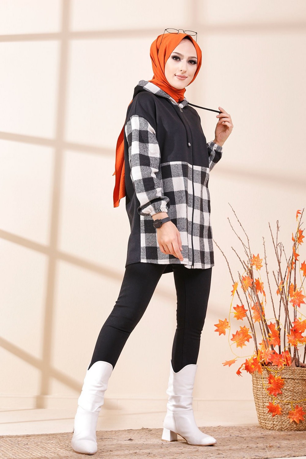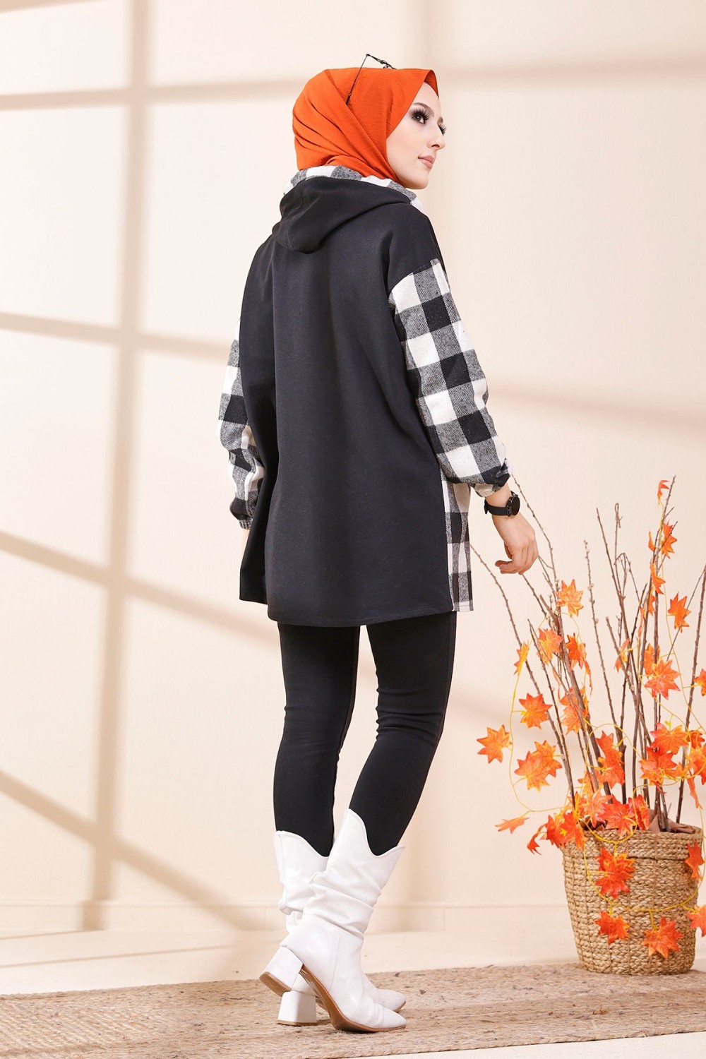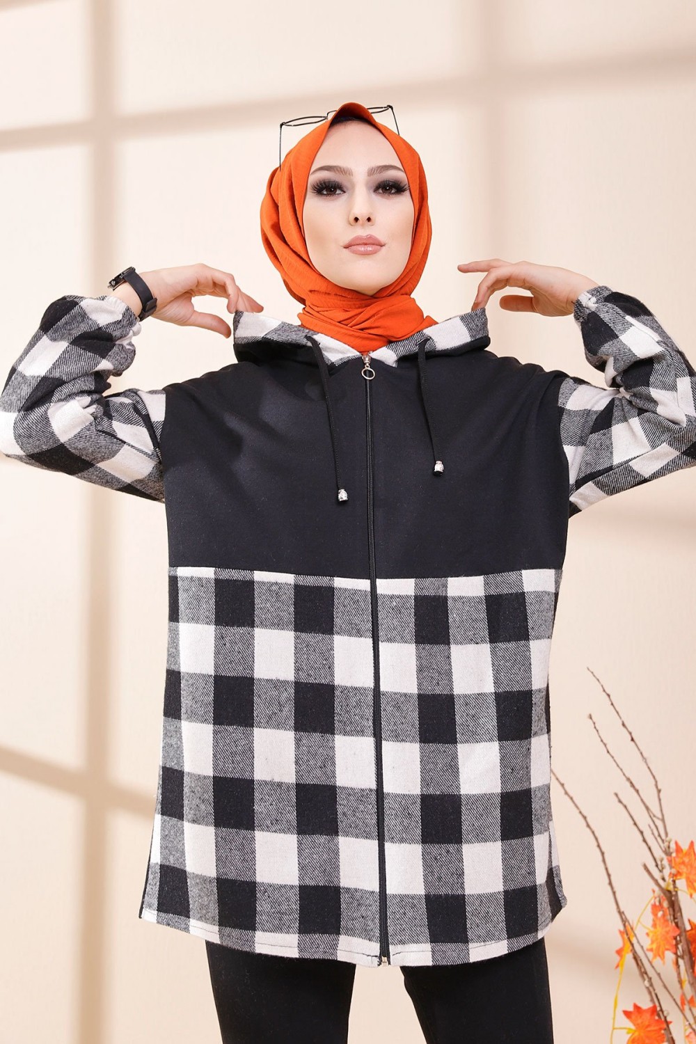 Chemise longue pour femme (Mode musulmane pas cher) - Tunique à carreaux écru et noir - REF. 33967 (19.90 €)