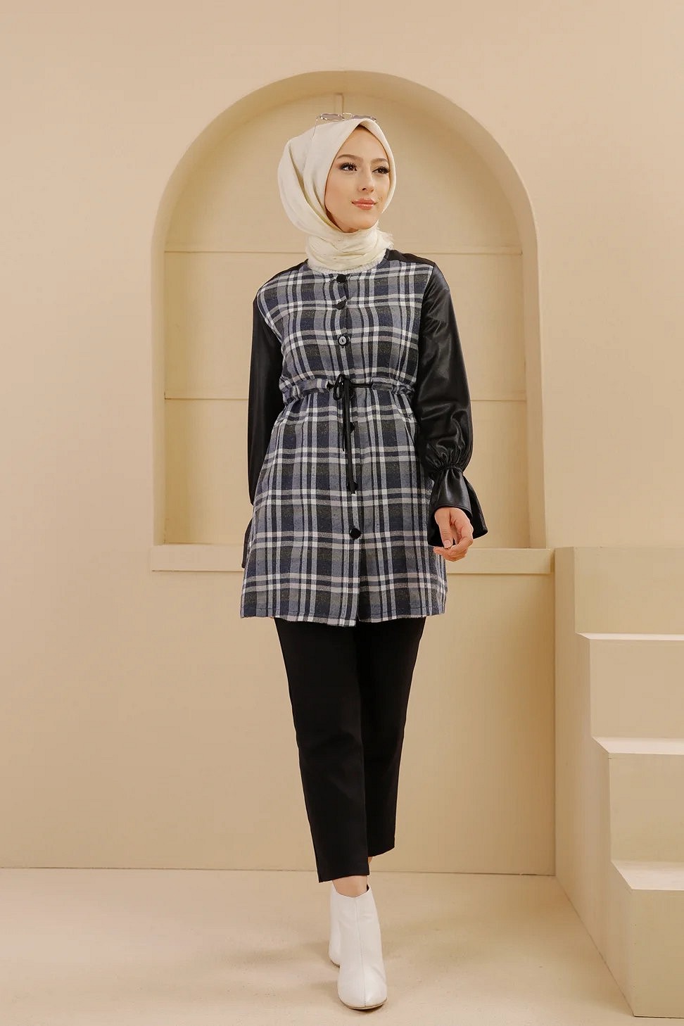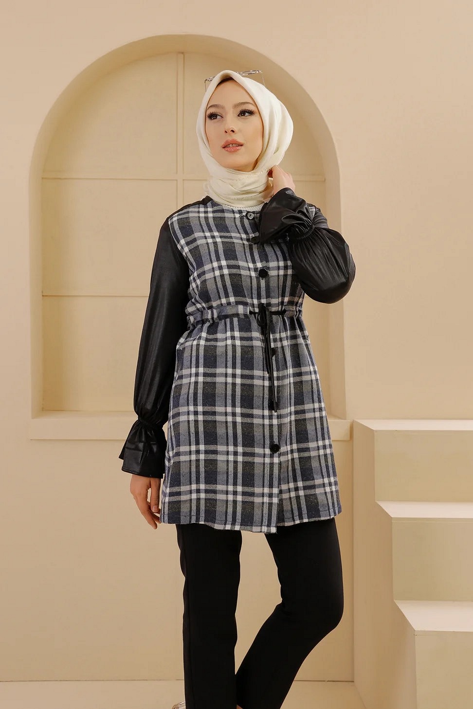 Tunique à carreaux et skaï pour femme (Vêtement Hijab - Collection) - Couleur bleu écru Vetement & Accessoire