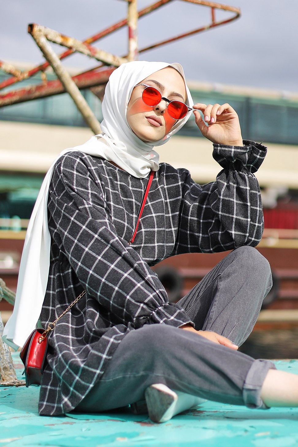 Tunique a carreaux pour femme - Couleur anthracite et ecru