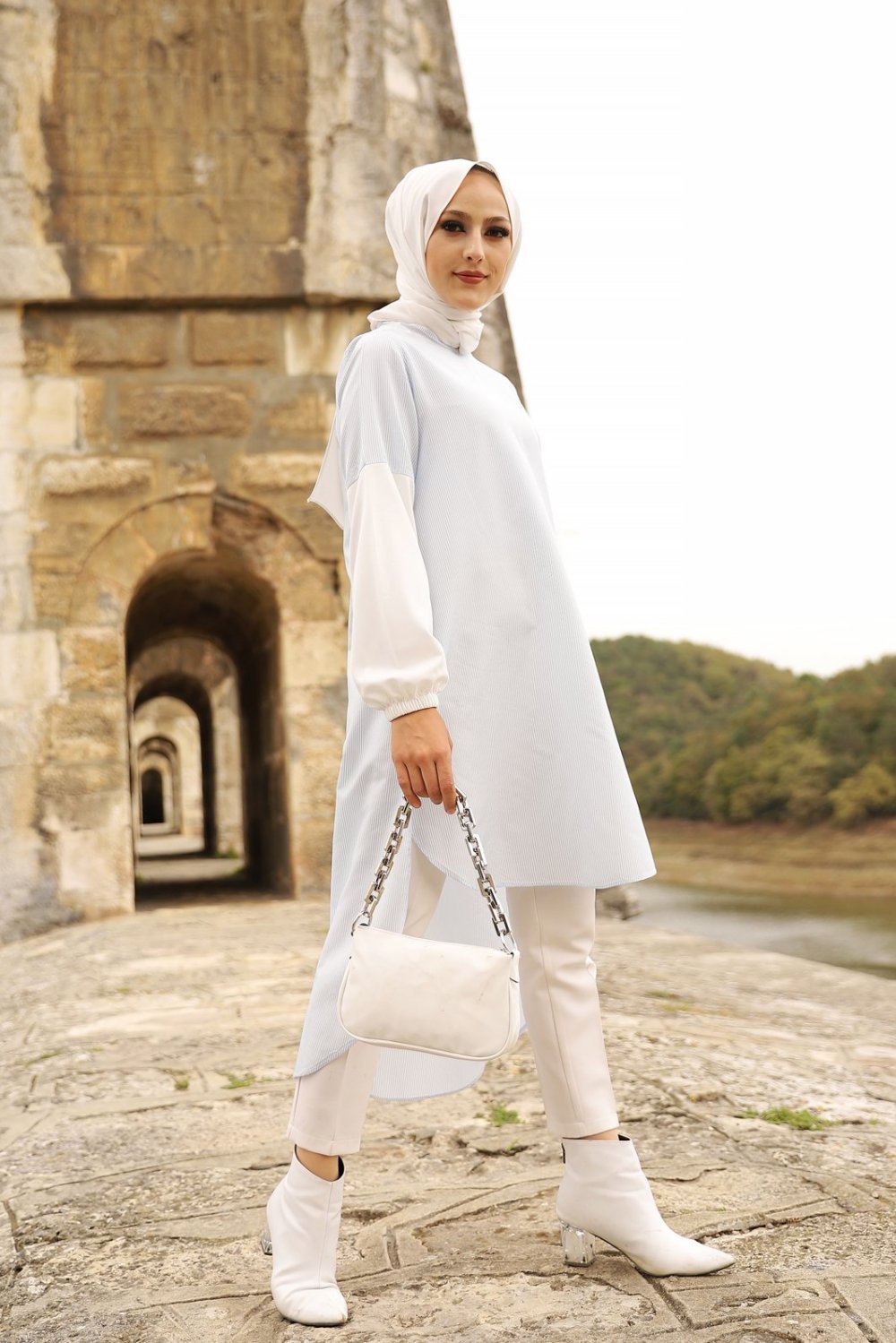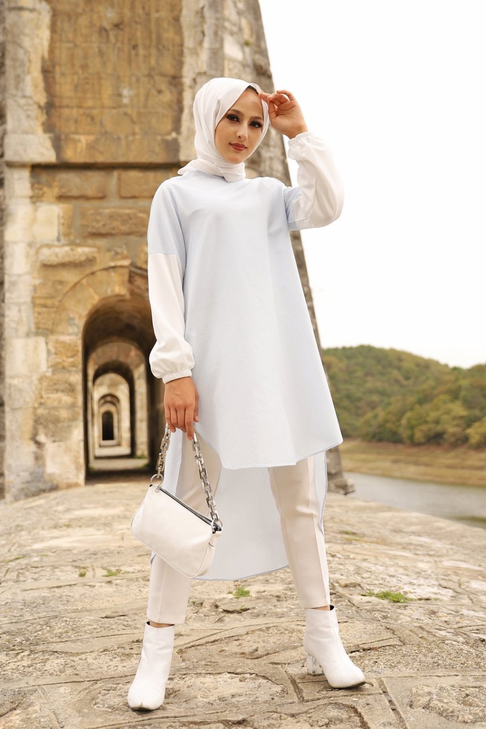 Tunique à rayures pour femme (Vêtement Hijab) - Couleur bleu clair Vetement & Accessoire