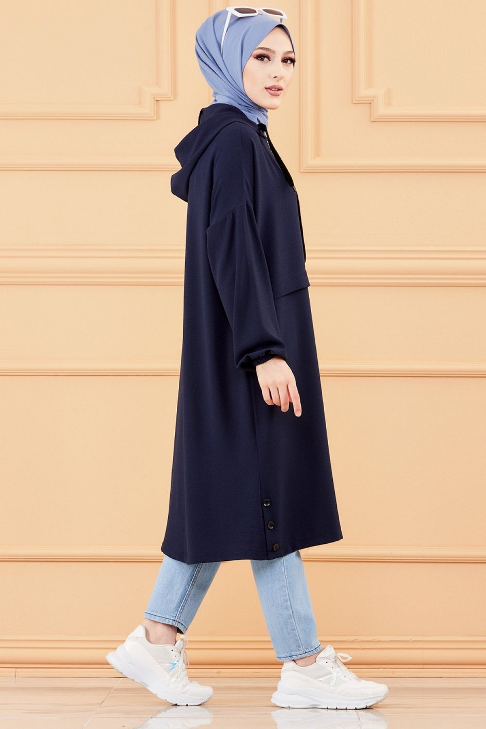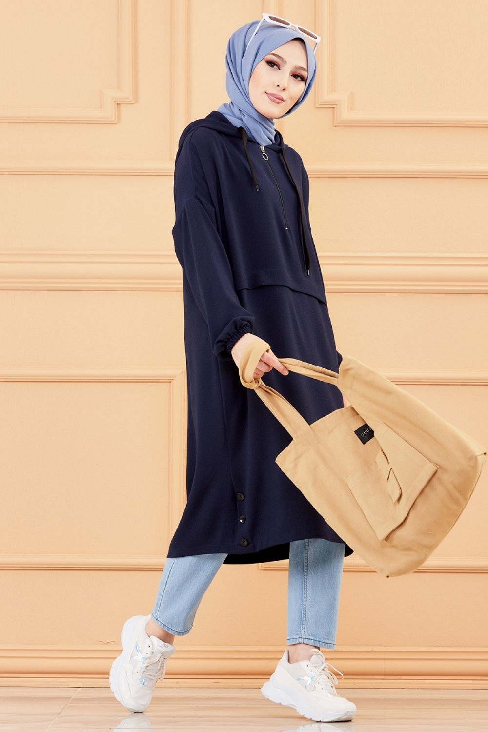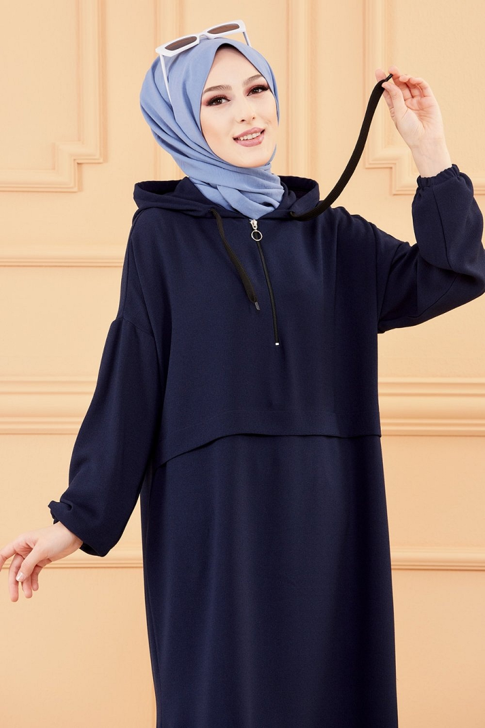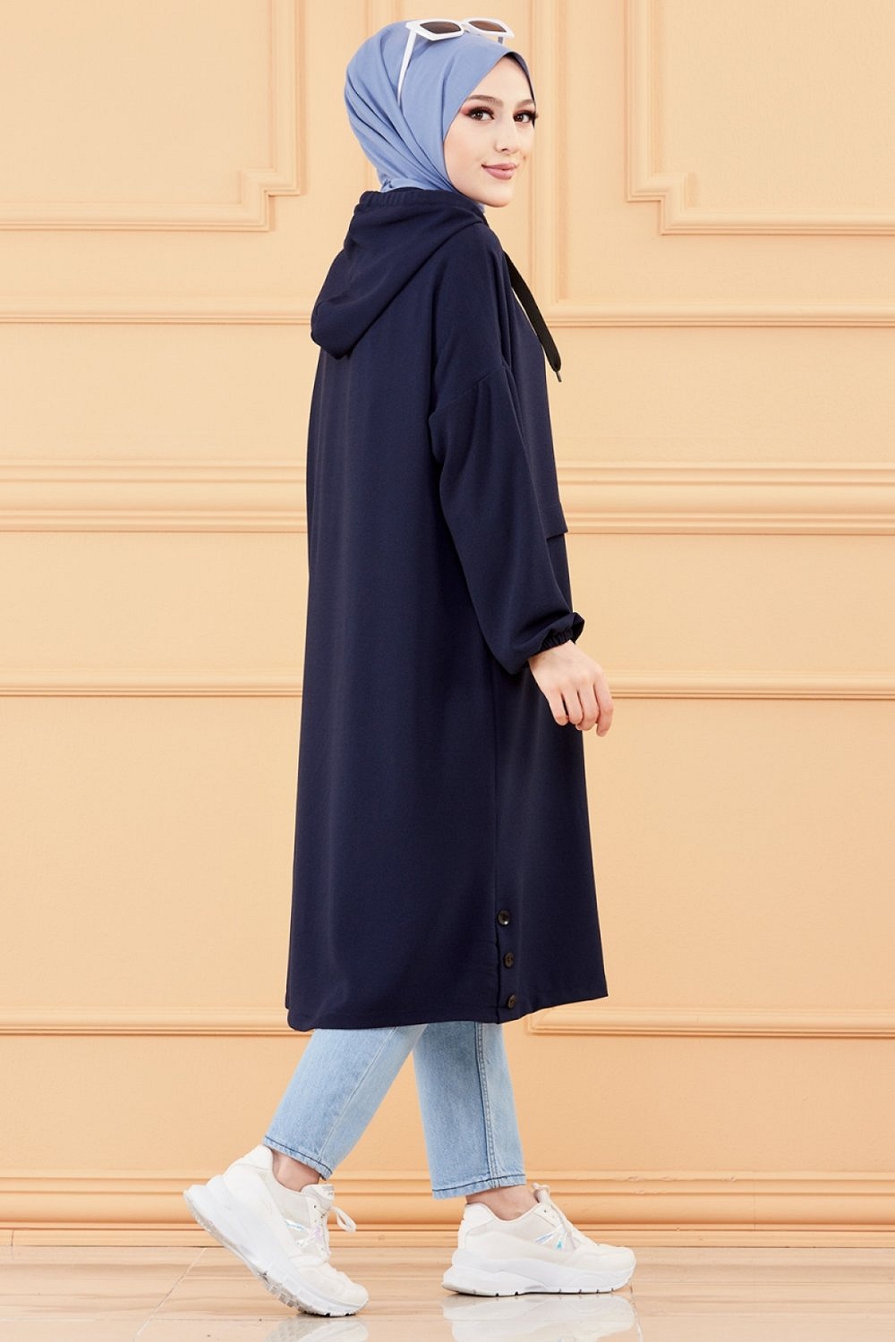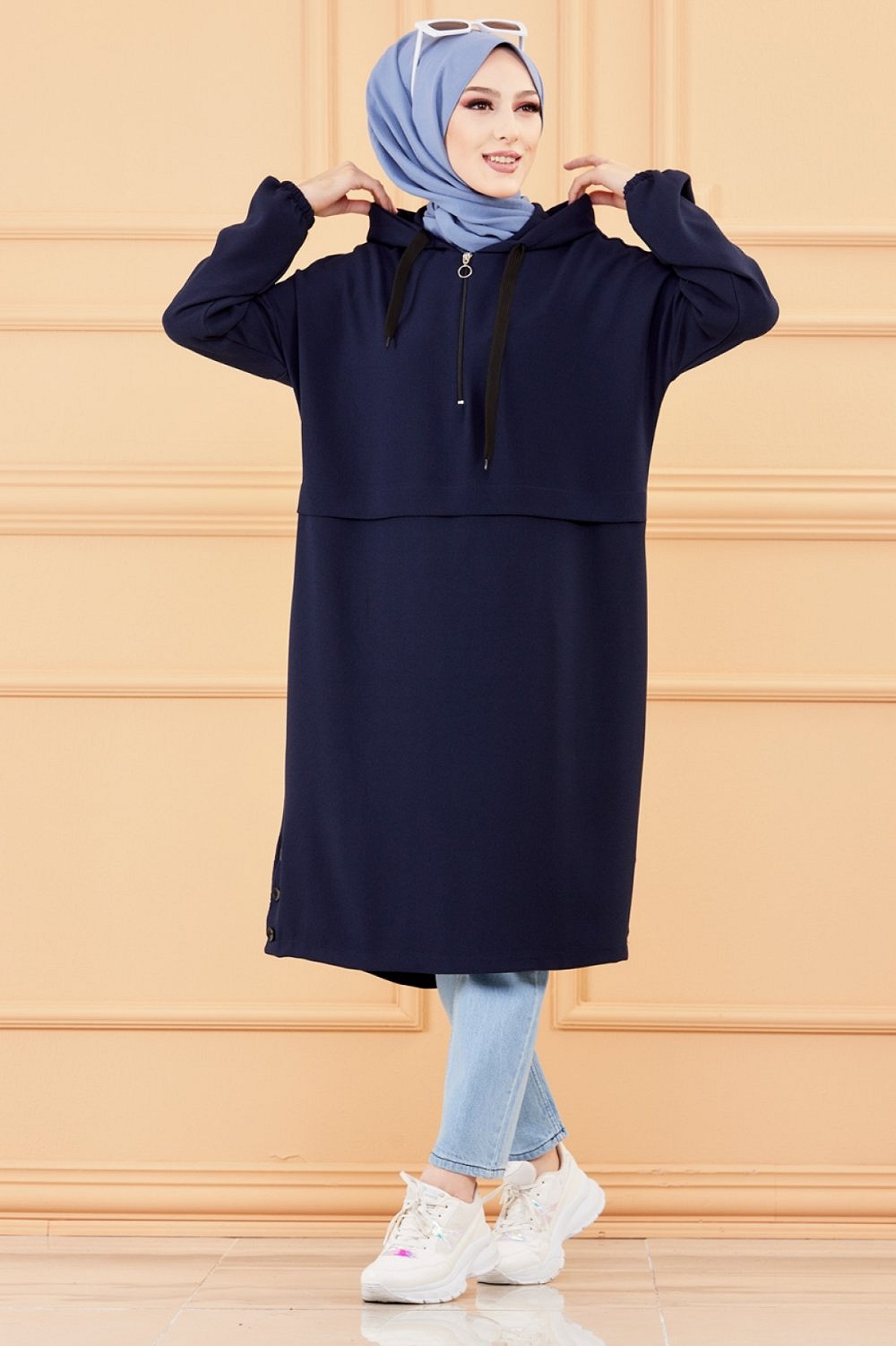 Tunique sweat long avec capuche pour femme (Vetement hijab moderne et sport) - Couleur bleu marine - REF. 35558 (23.00 €)