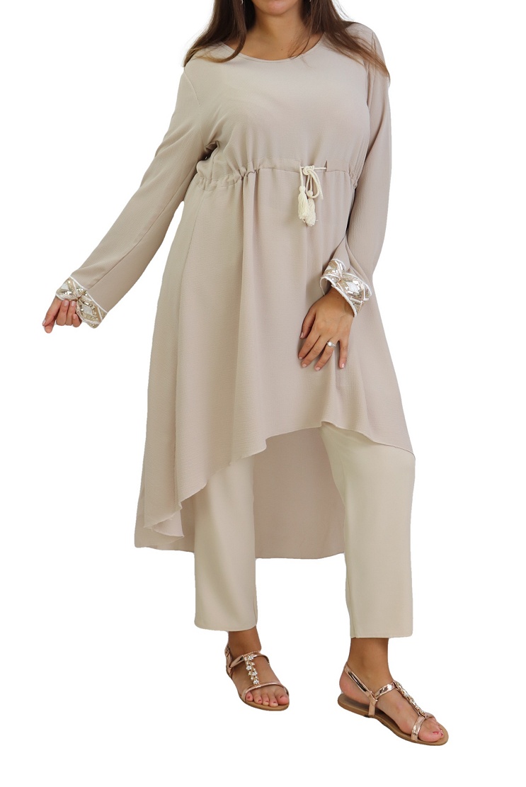 Tunique ample et originale pour femme avec cordon a pompons et strass sur les manches - Couleur Beige