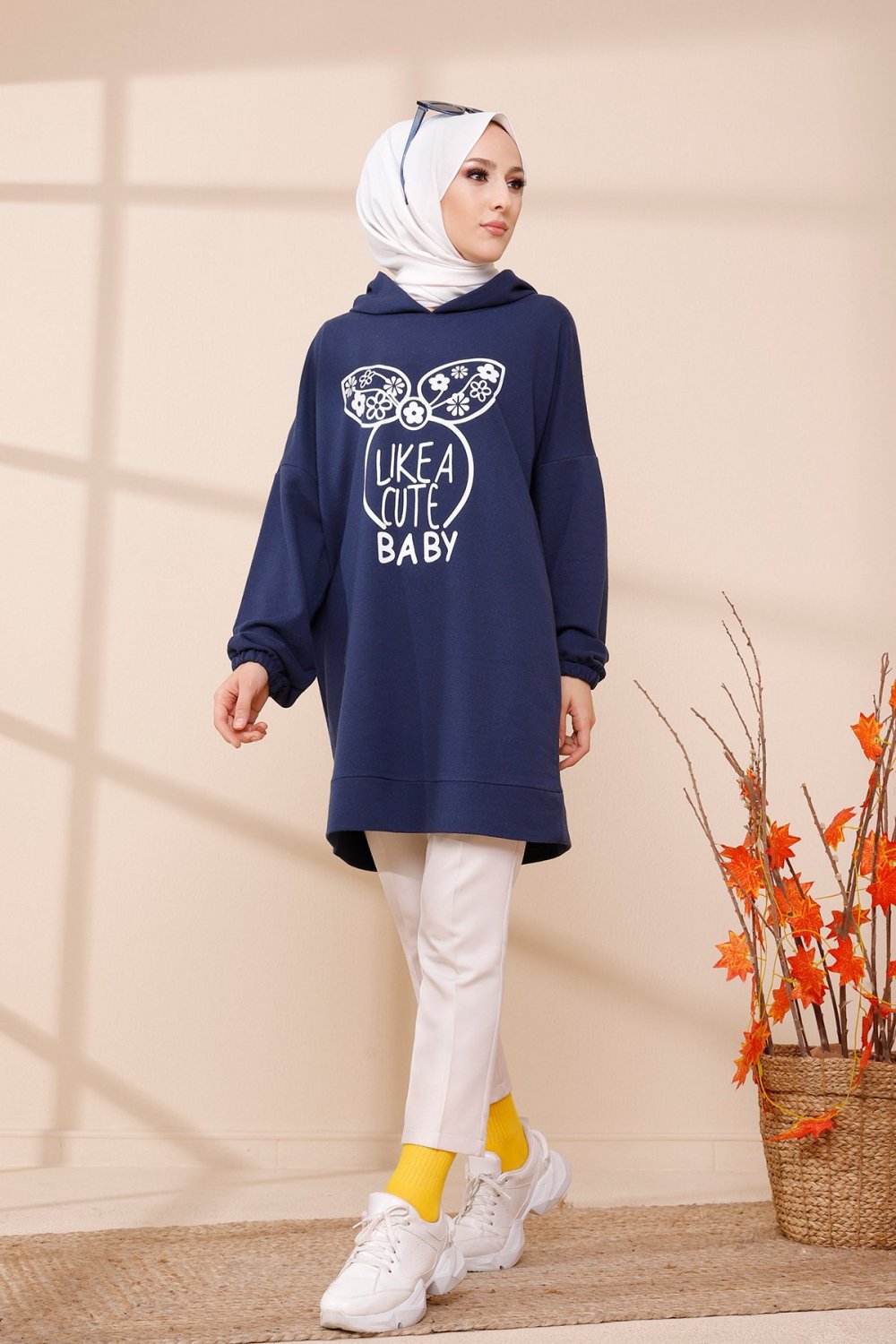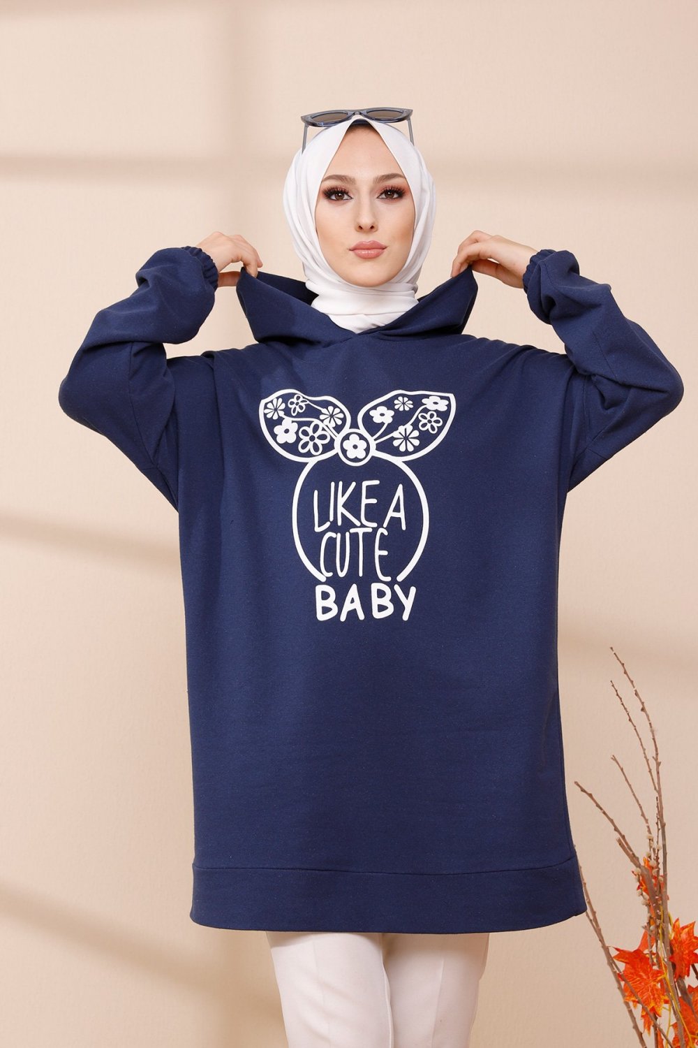 Tunique avec capuche imprimé "Like a cute baby" (Tenue Moderne Hijab) - Couleur bleu marine Vetement & Accessoire