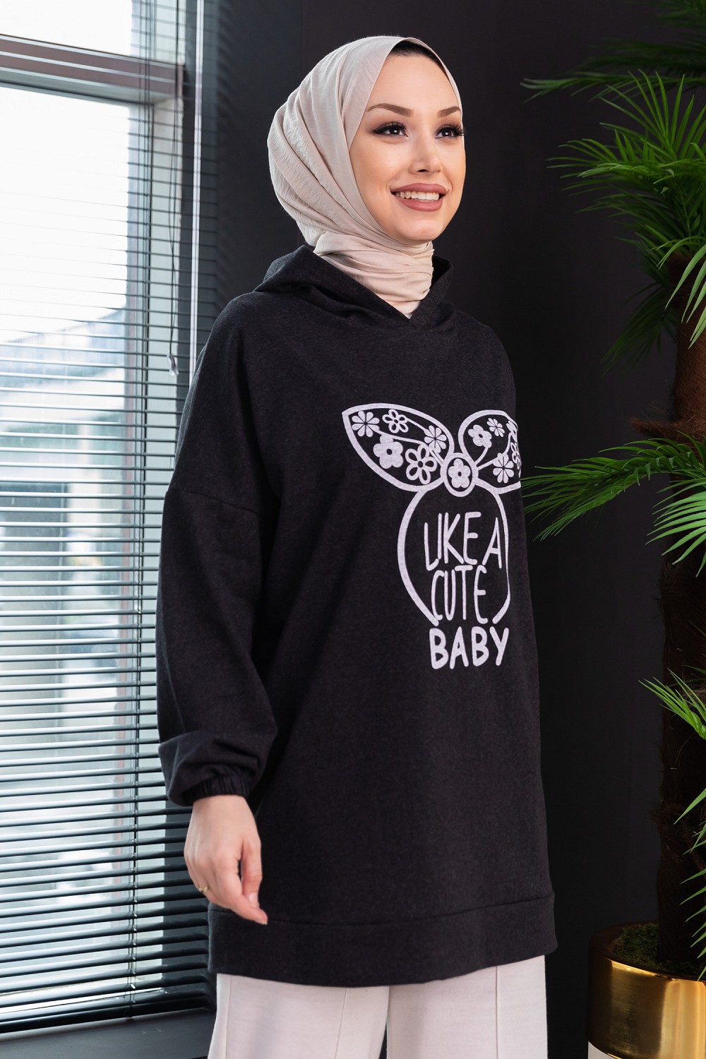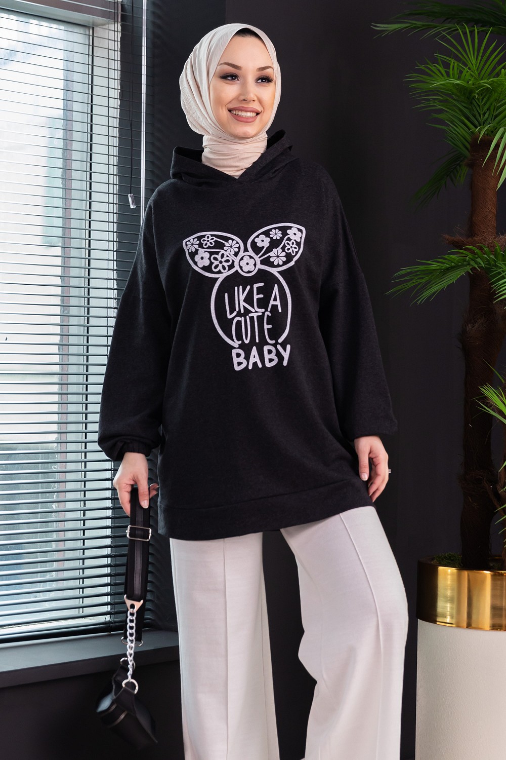 Tunique avec capuche imprimé "Like a cute baby" (Vêtement Femme Style Moderne) - Couleur anthracite Vetement & Accessoire