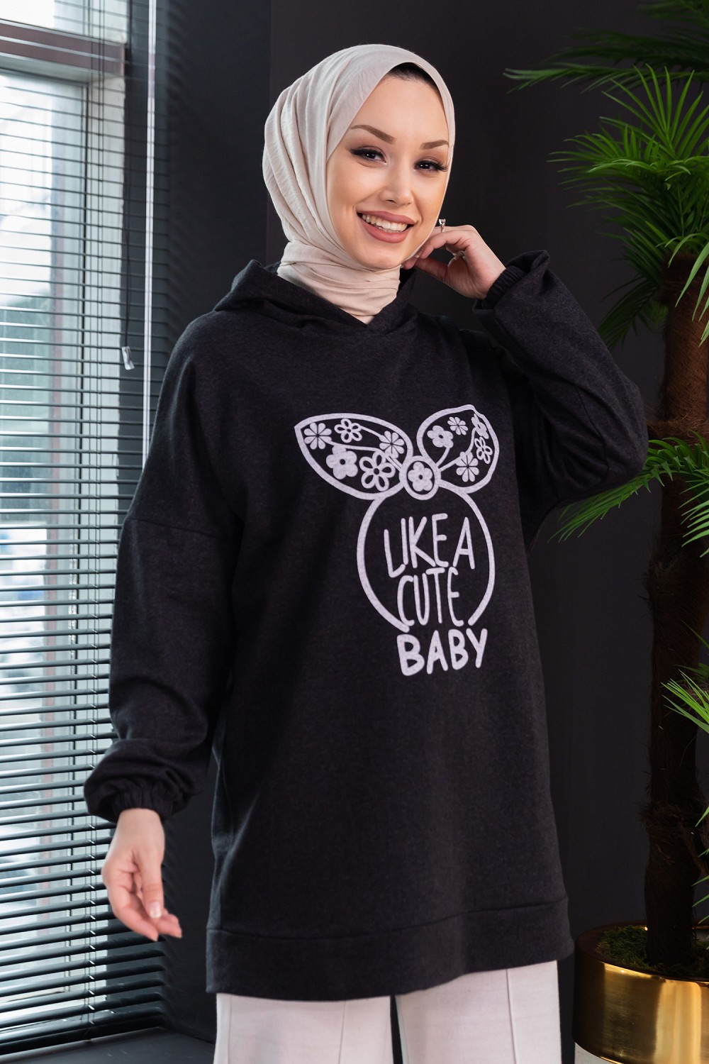 Tunique avec capuche imprime "Like a cute baby" (Vetement Femme Style Moderne) - Couleur anthracite