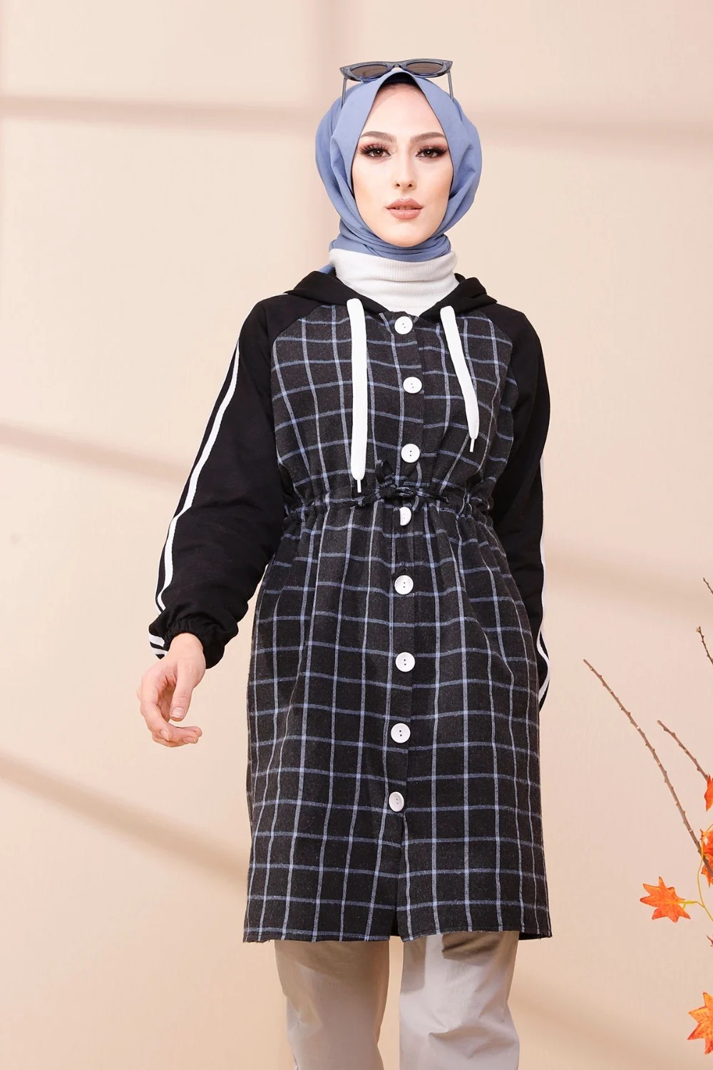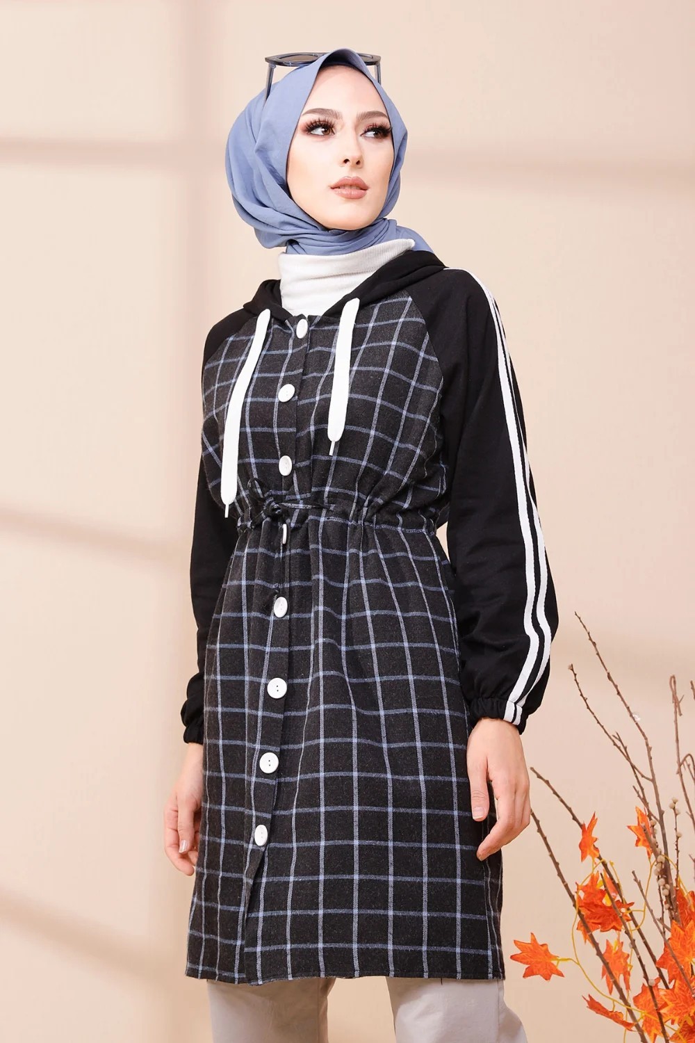 Tunique longue boutonnée (Vetement femme voilée Automne-Hiver) - Couleur noire et moutarde - REF. 32230 (25.00 €) - En Promotion à 18.00 €