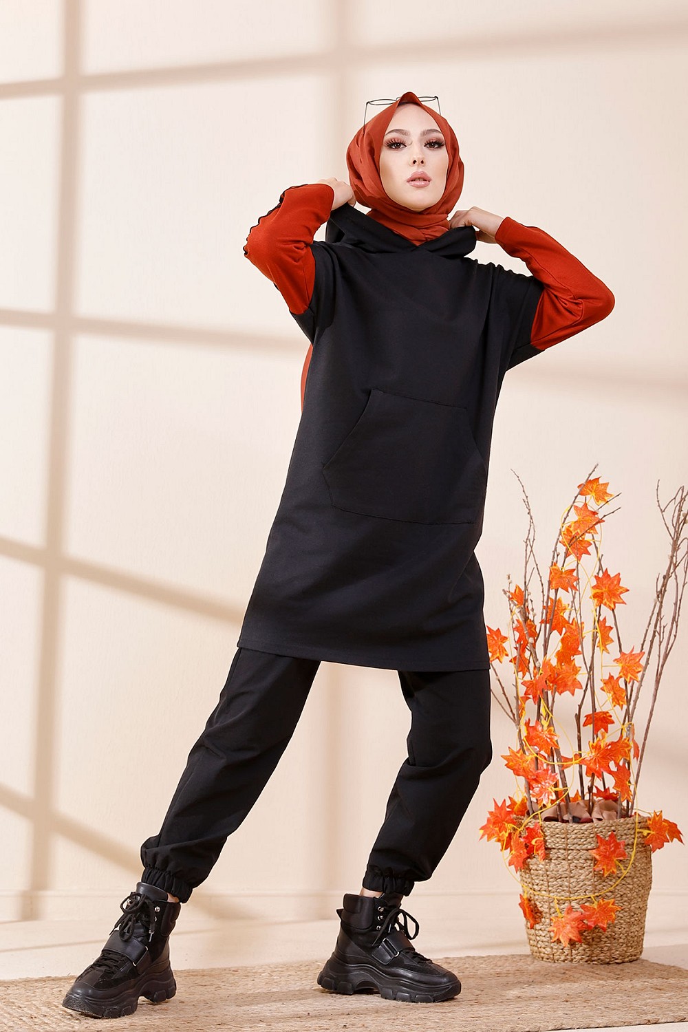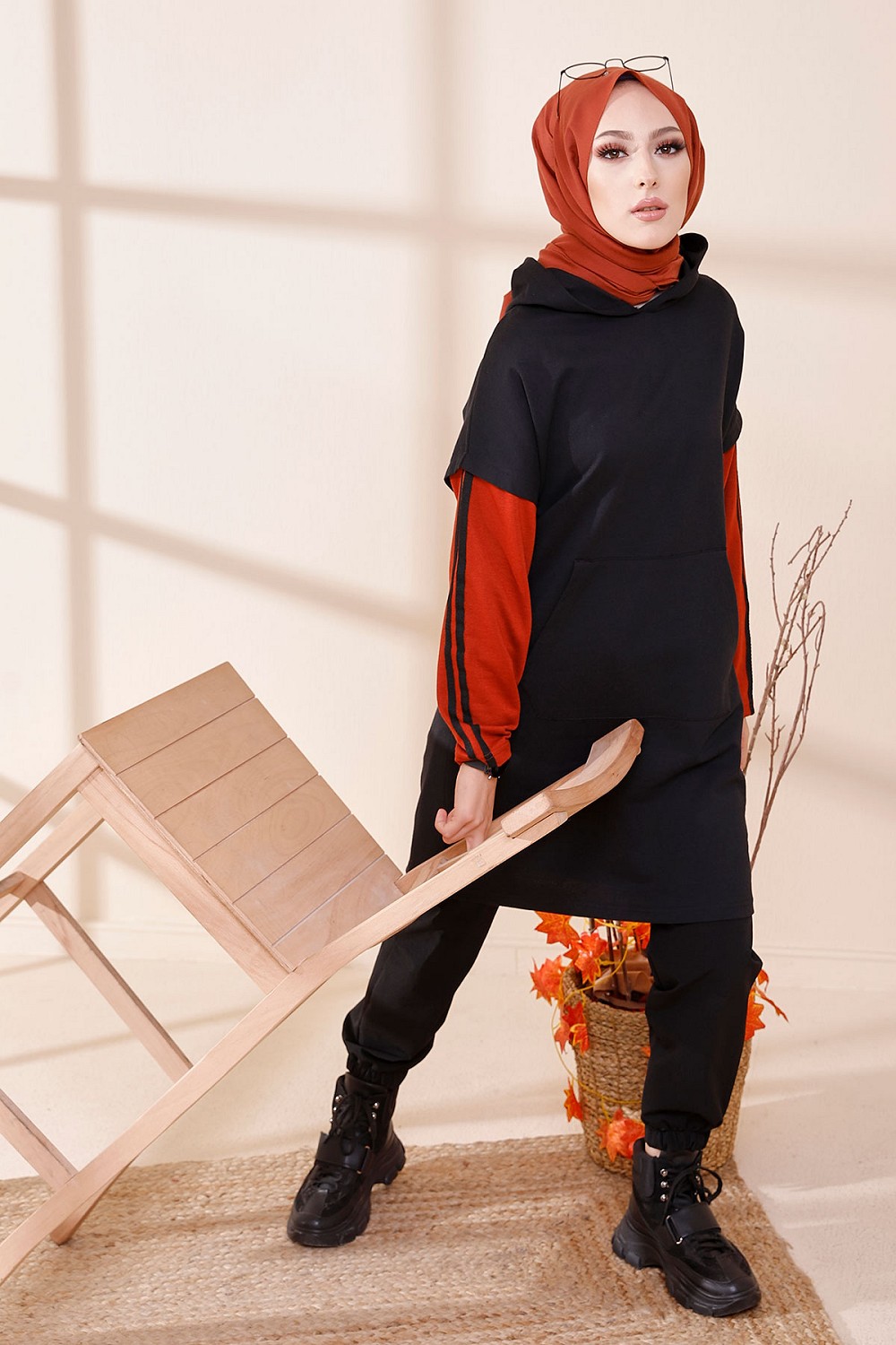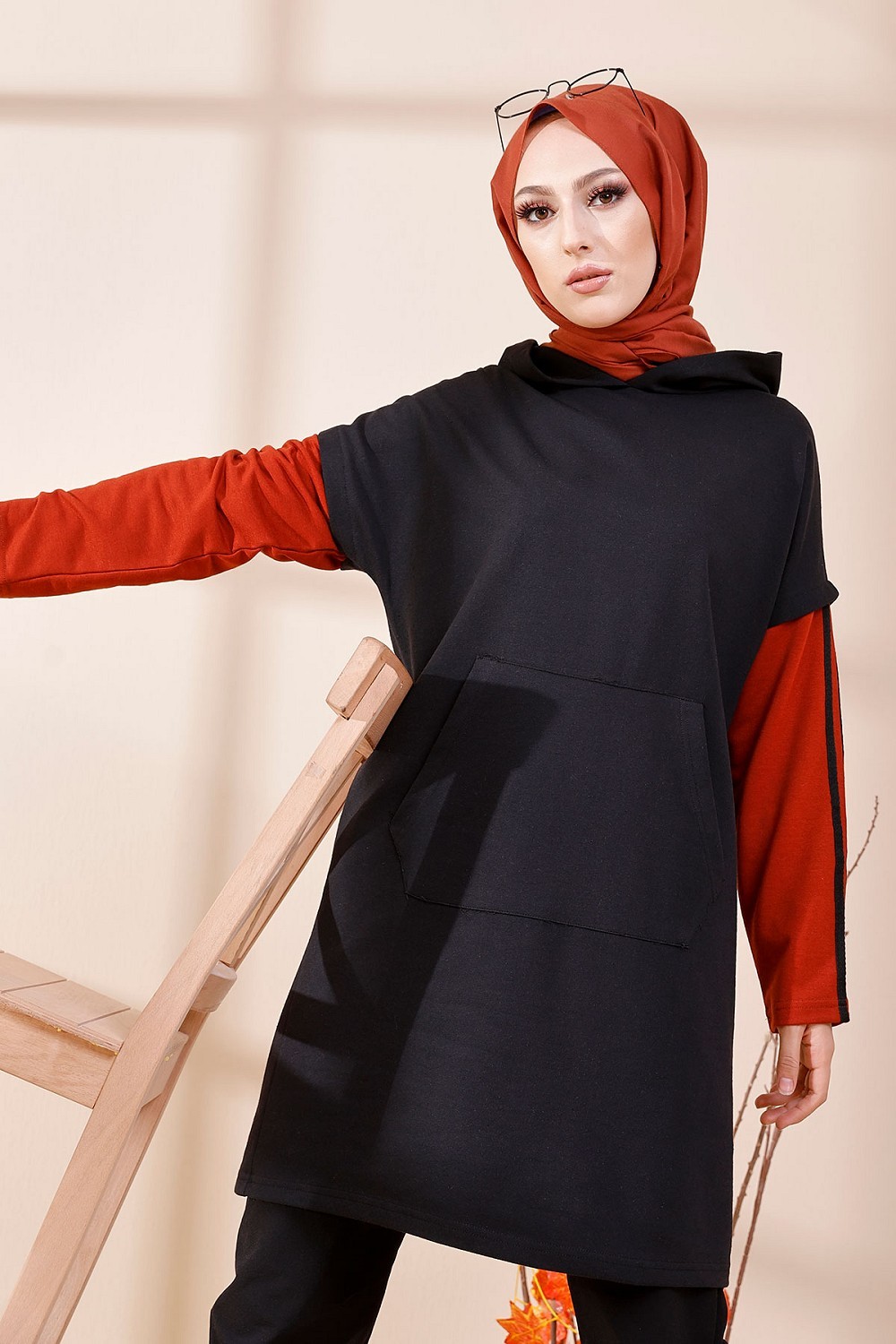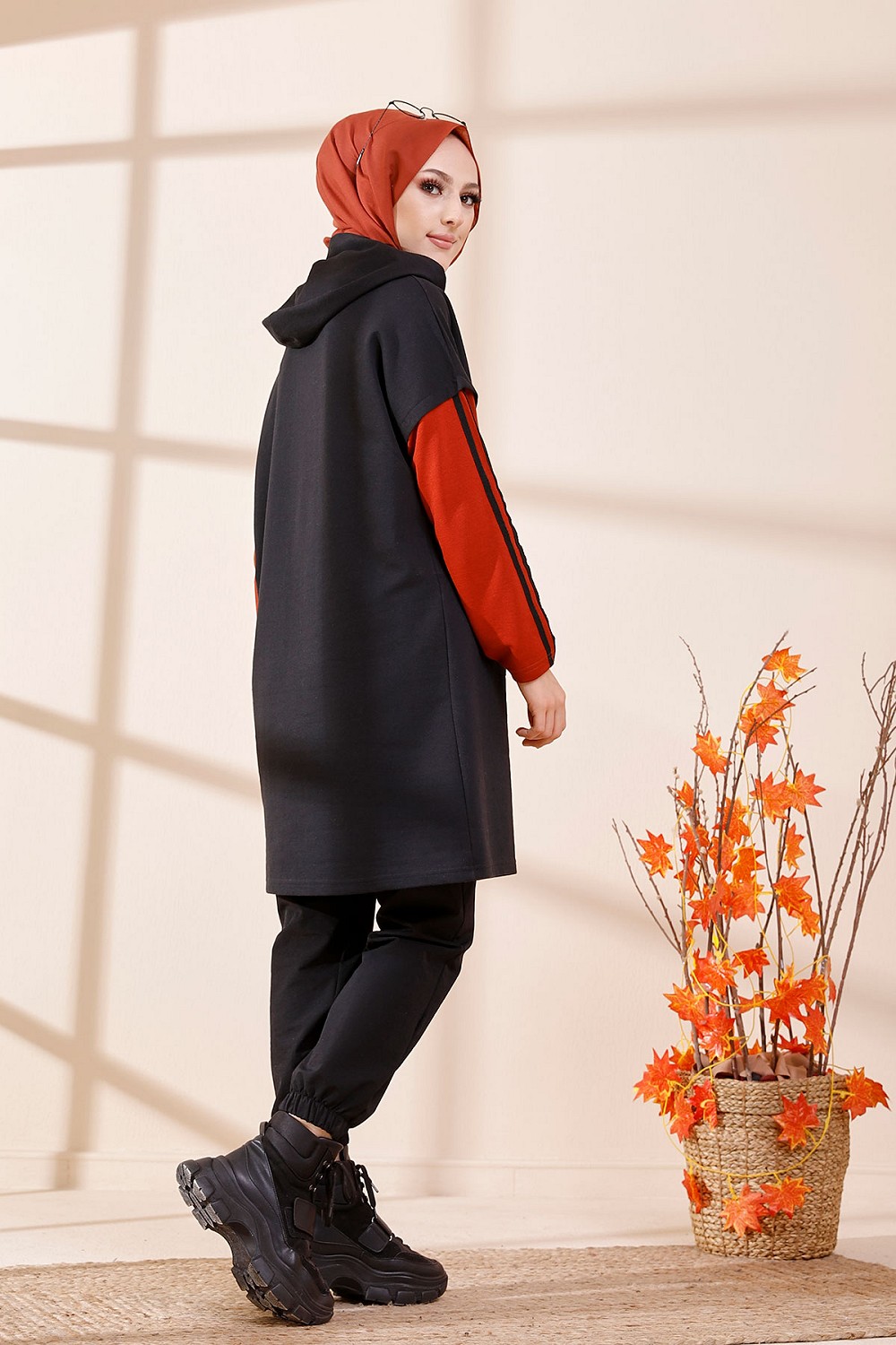 Tunique bicolore avec capuche pour femme (Sweat long style décontracté) - Couleur noir et rouille Vetement & Accessoire
