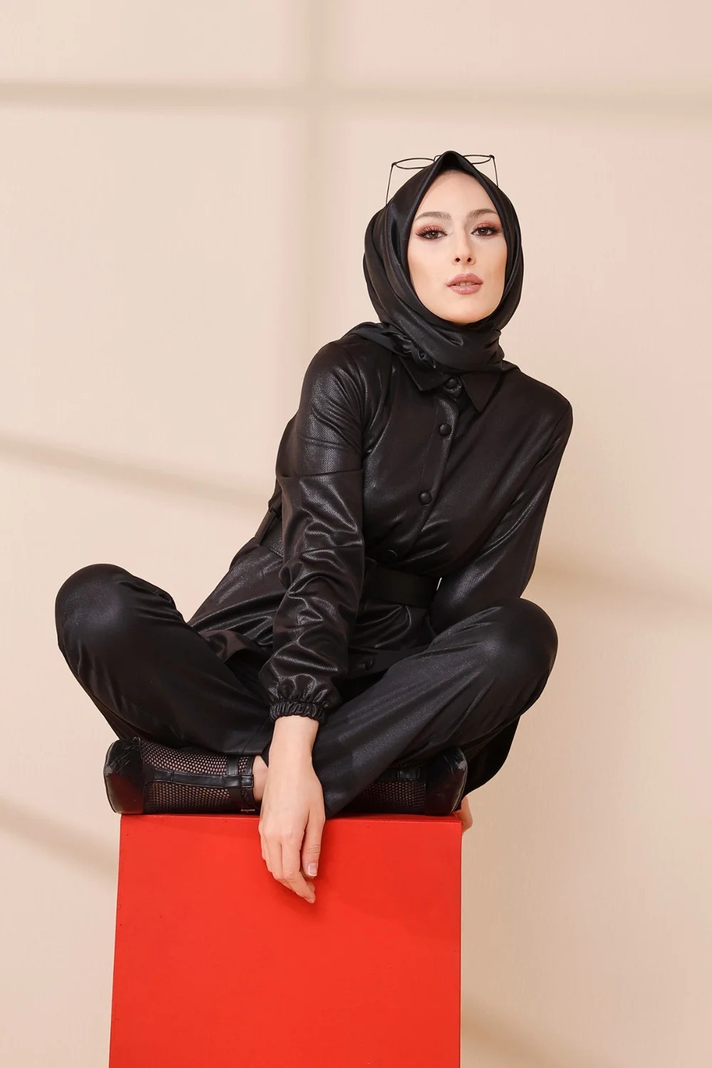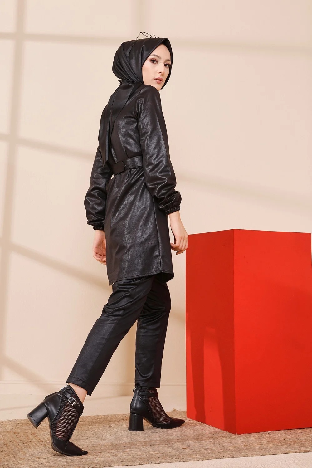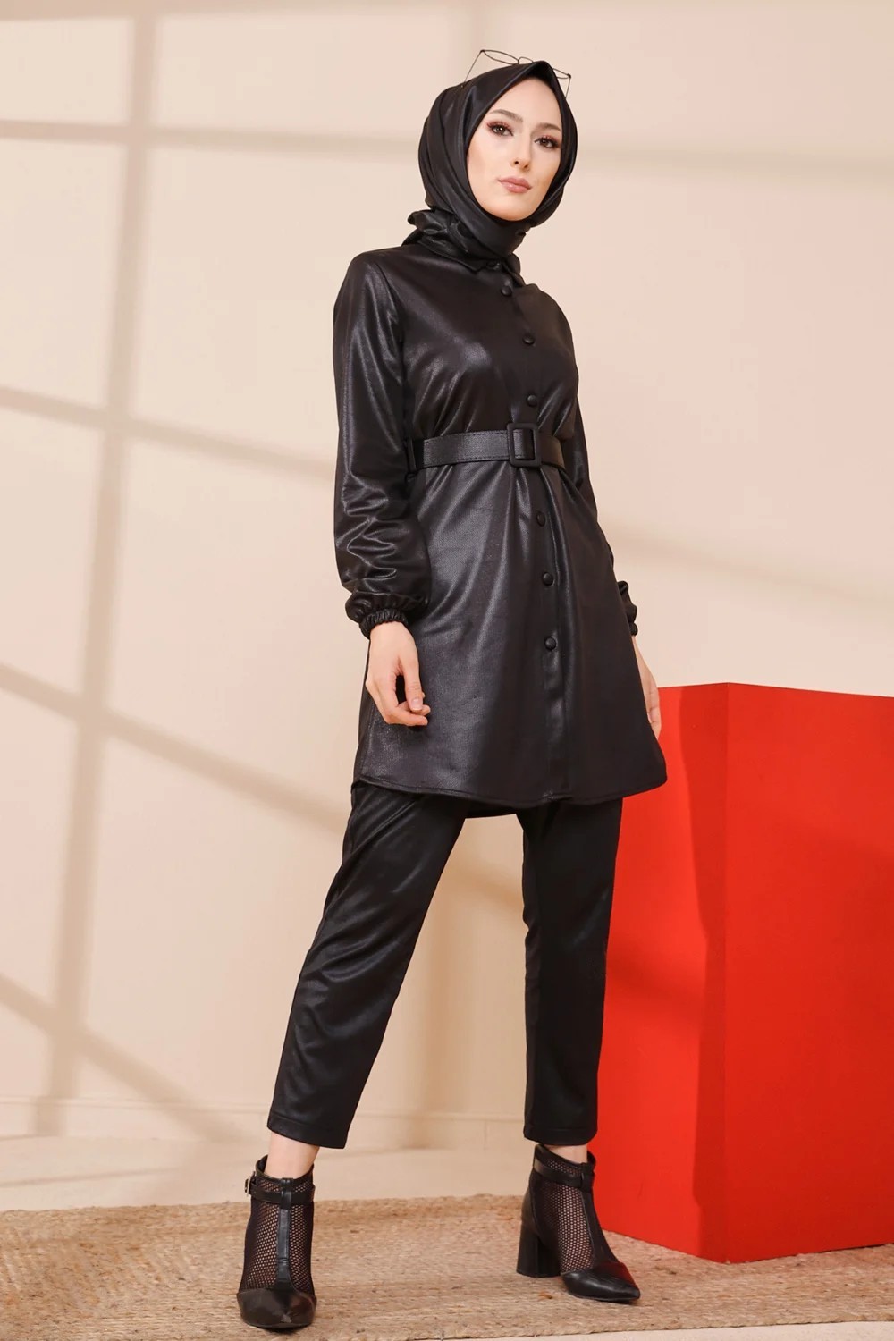 Tunique brillante avec ceinture pour femme (Tenue chic pour hijab) - Couleur noir Vetement & Accessoire