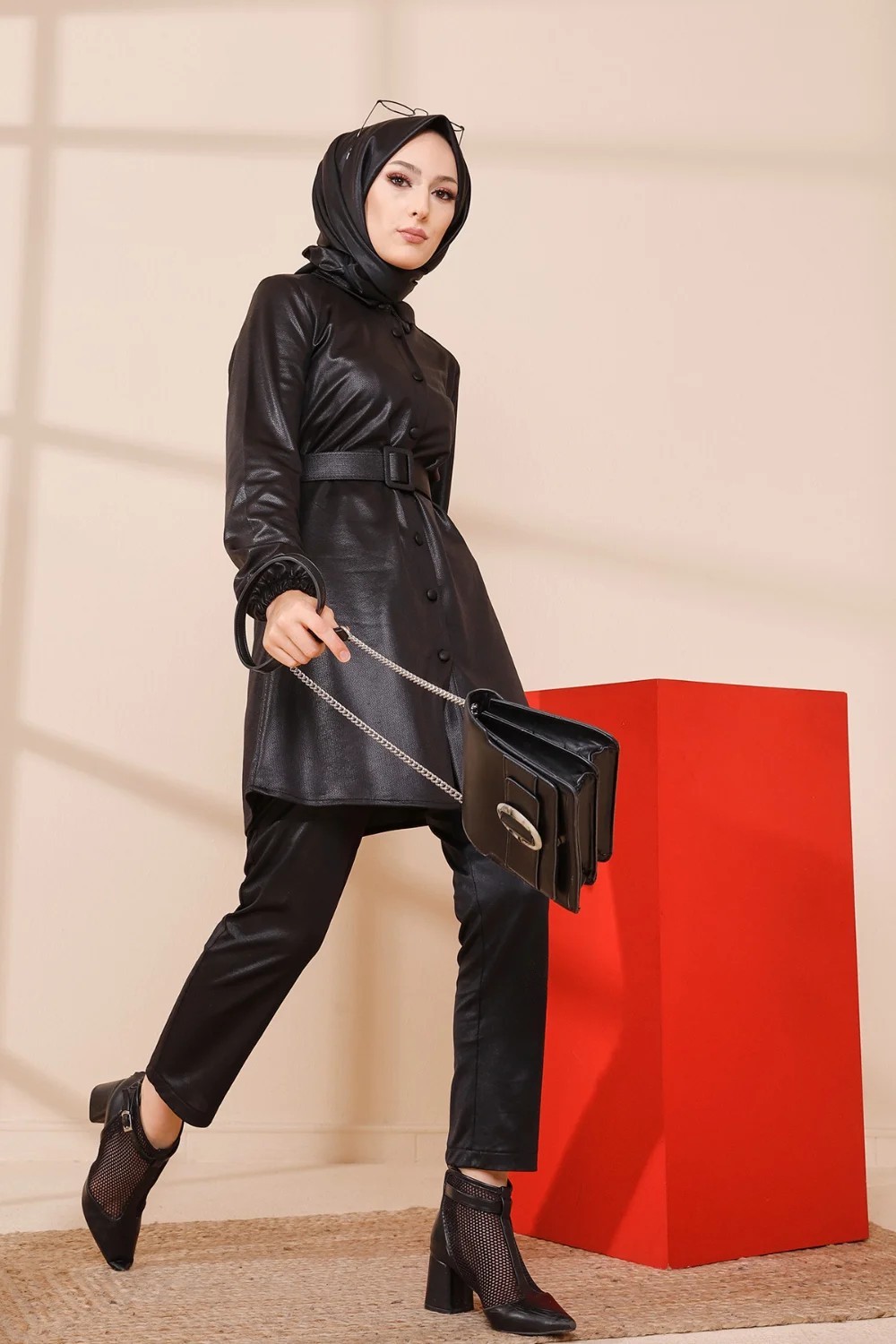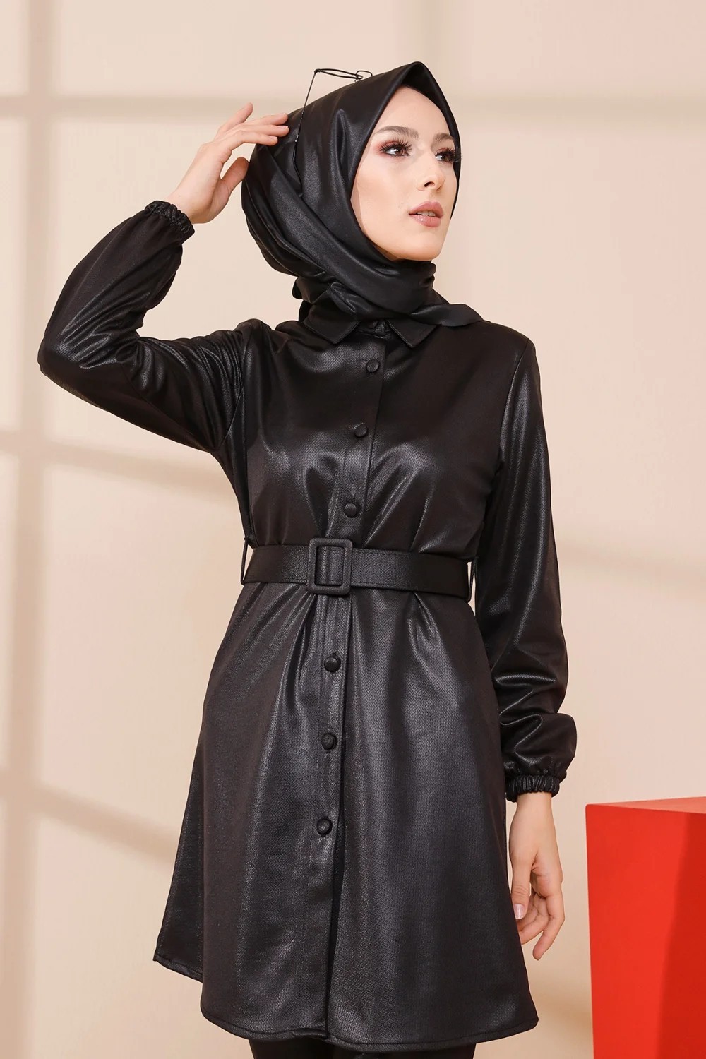 Tunique brillante avec ceinture pour femme (Tenue chic pour hijab) - Couleur noir