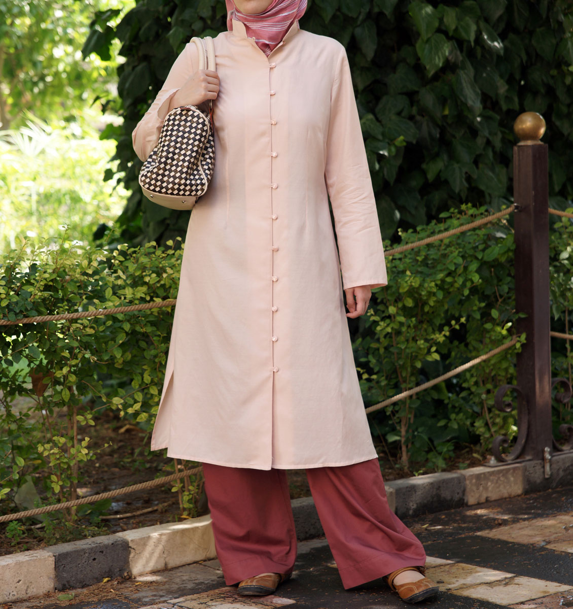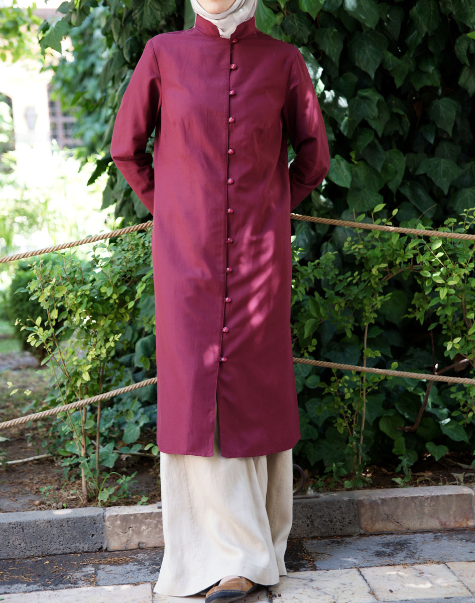 Description: hits mid-calf; open mandarin collar; button and loop opening; long side slits. Imported.