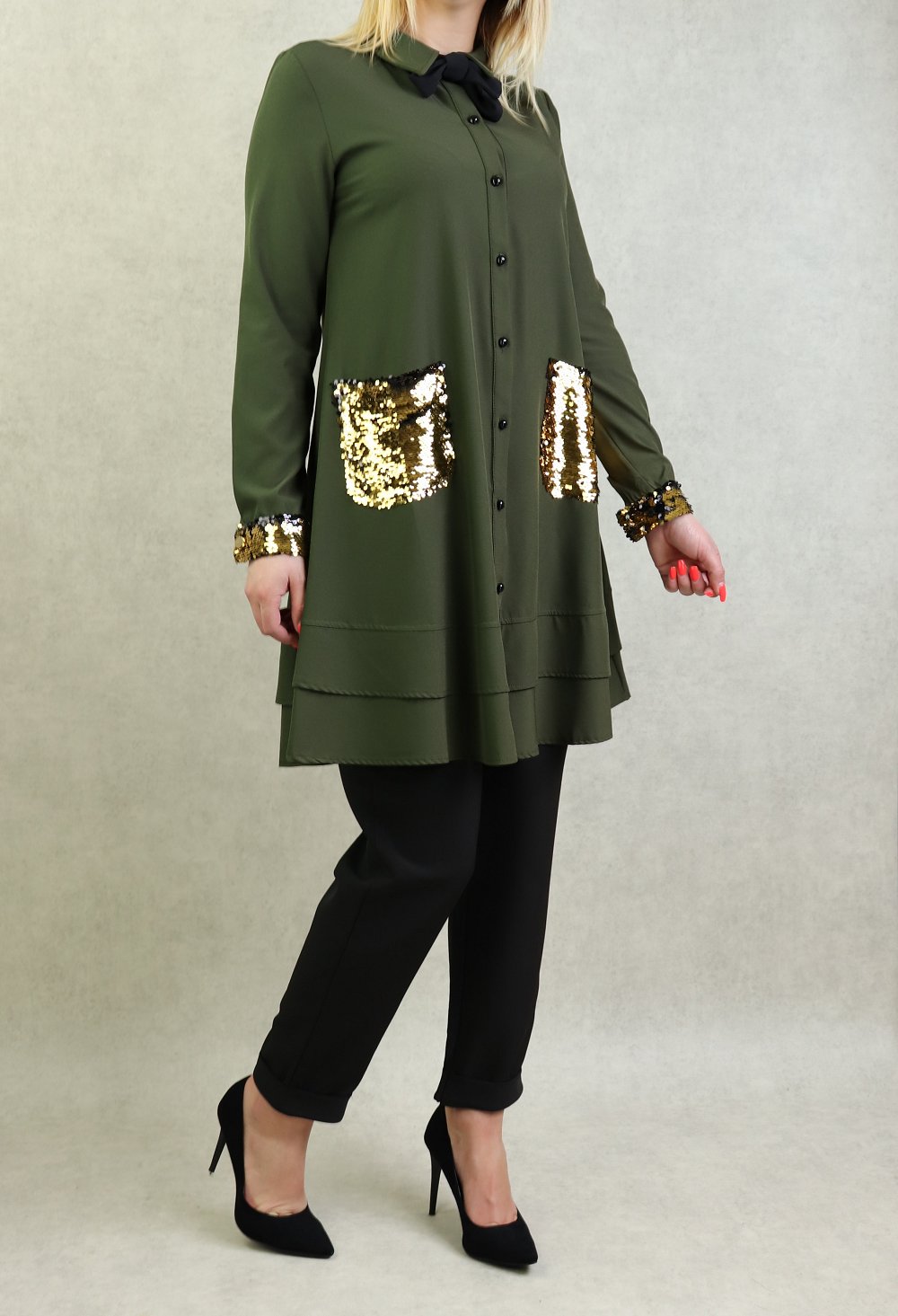 Tunique-Chemise longue, poches et manches paillettes finition bouton, col chemise avec nœud papillon, coupe légèrement évasée, fermeture boutons.