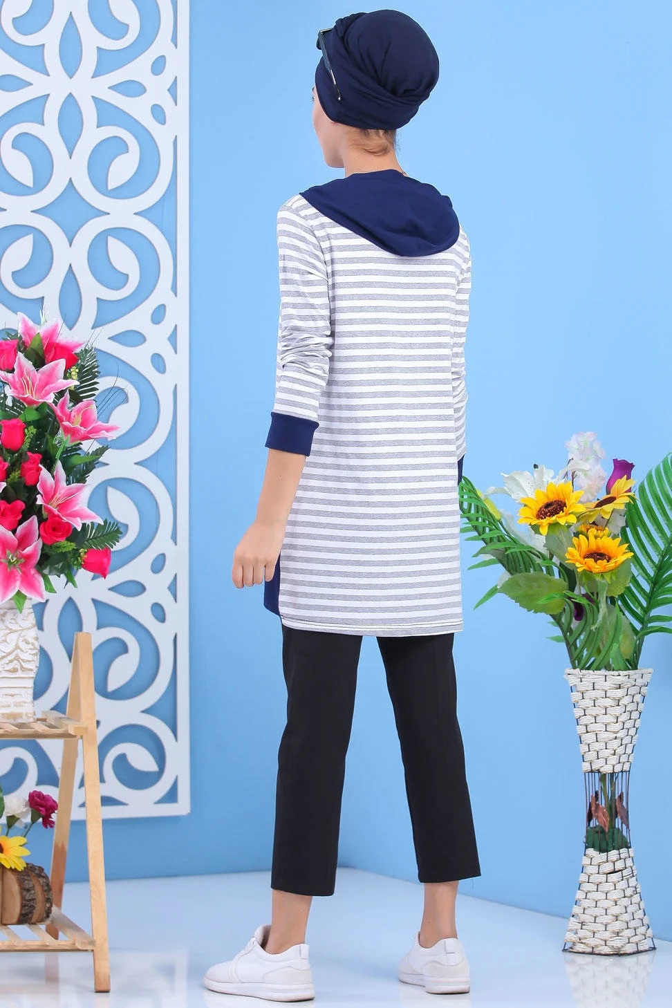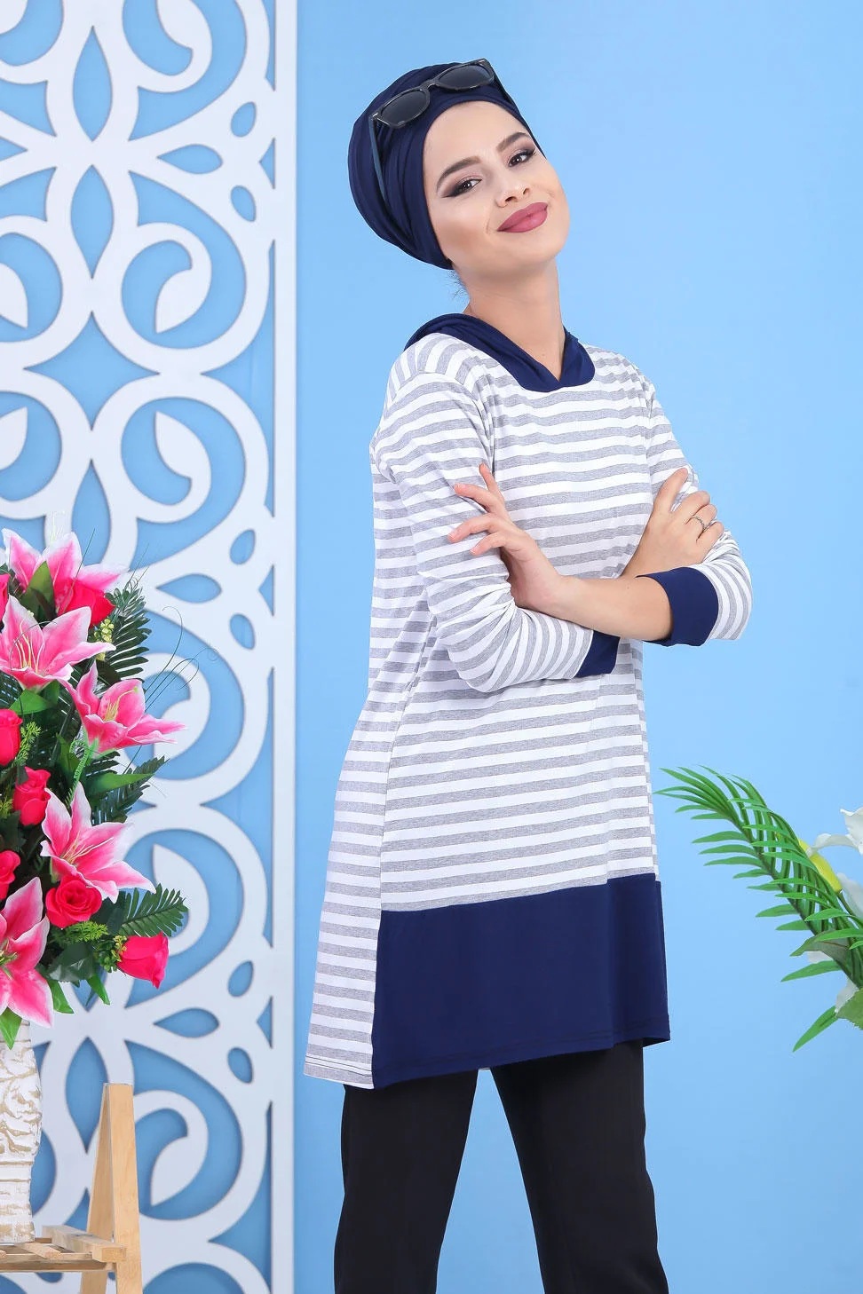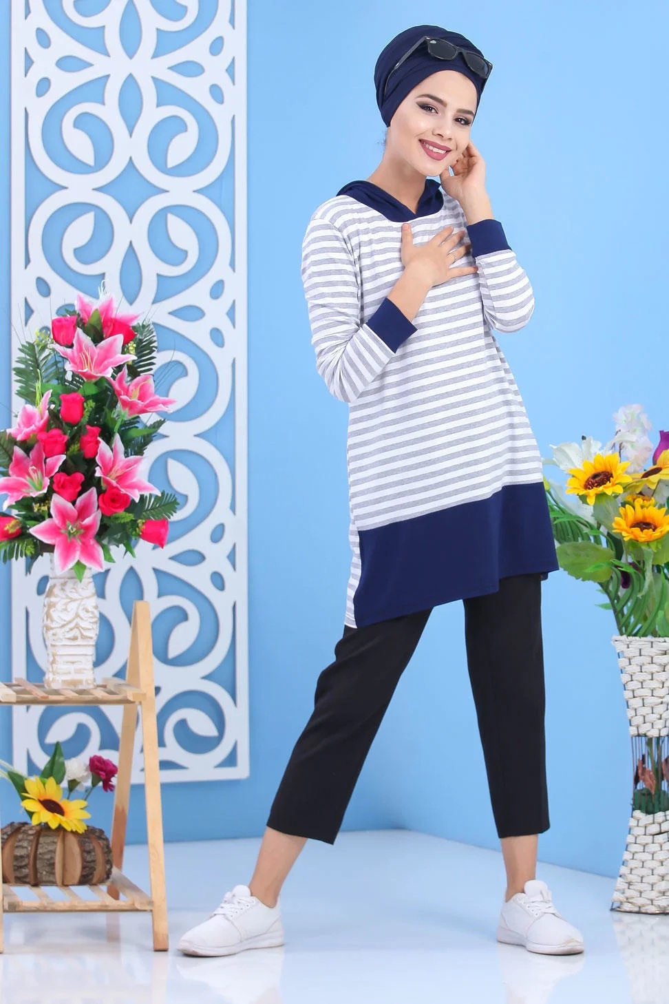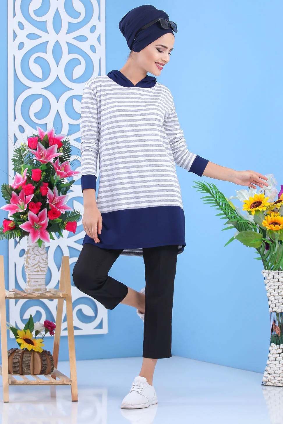 Tunique décontractée à capuche pour femme - Couleur blanche et bleu marine à rayures grise Vetement & Accessoire