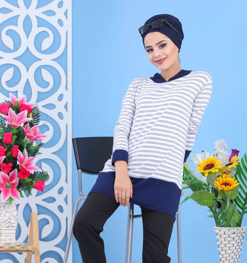 Tunique decontractee a capuche pour femme - Couleur blanche et bleu marine a rayures grise