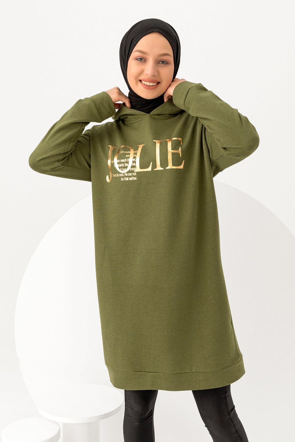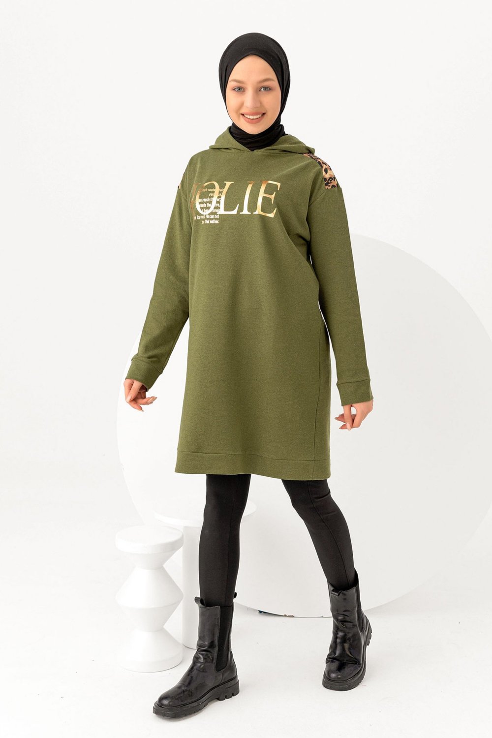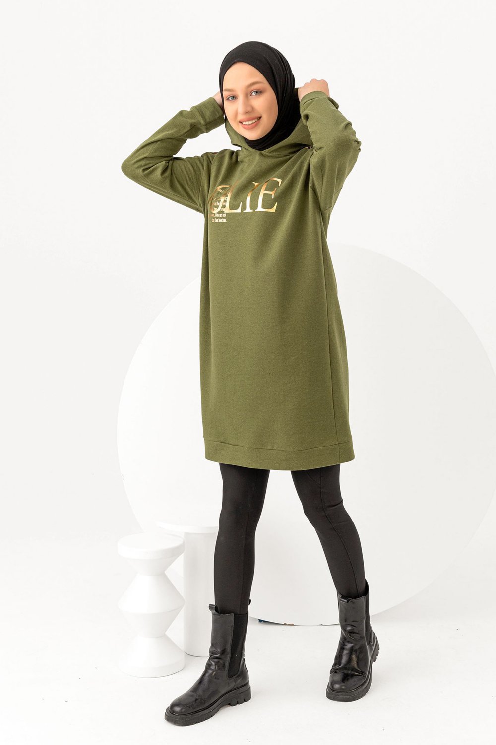 Tunique décontractée ample pour femme type sweat-shirt avec capuche et imprimé doré - Couleur kaki Vetement & Accessoire