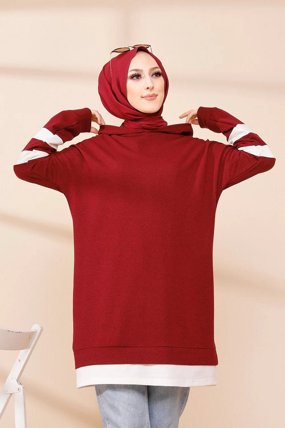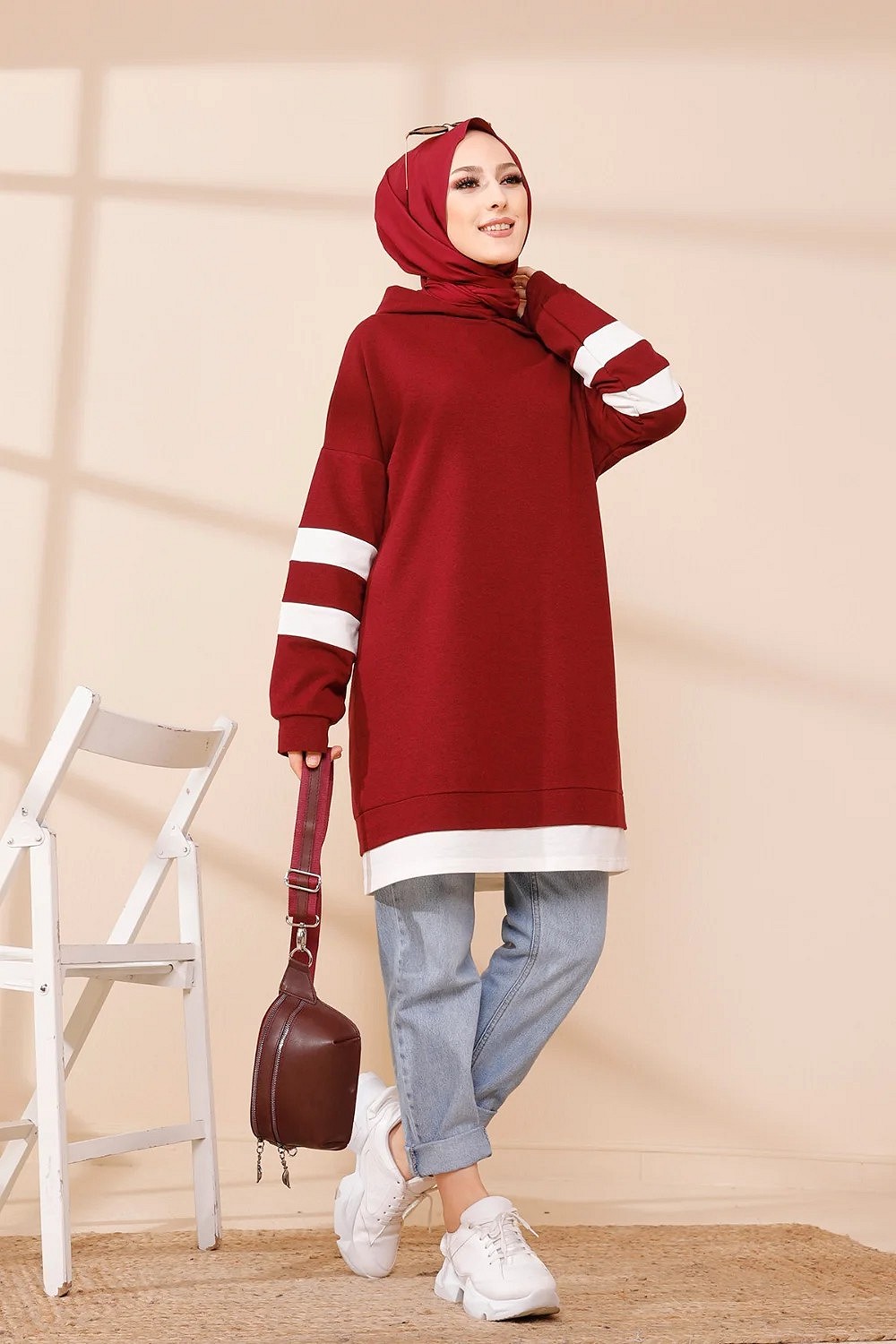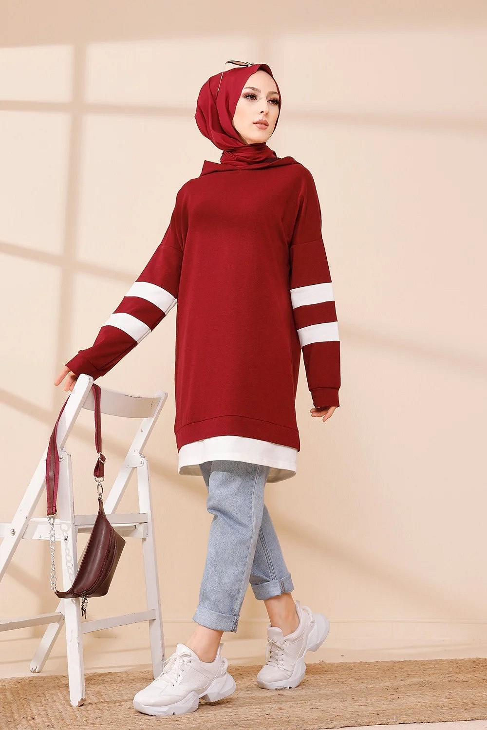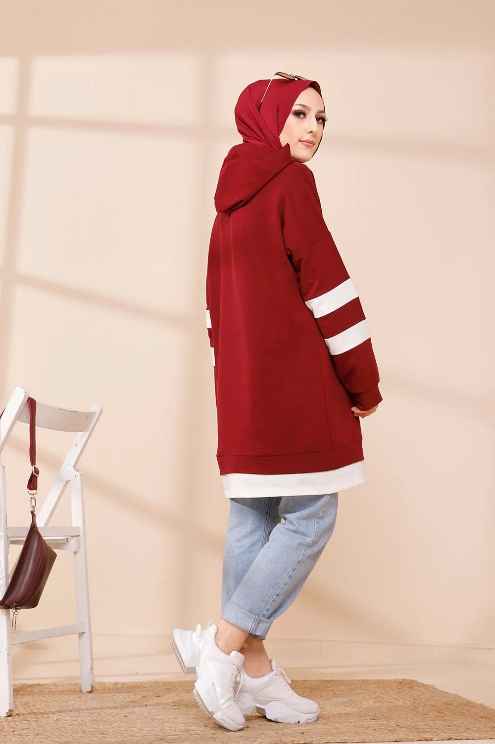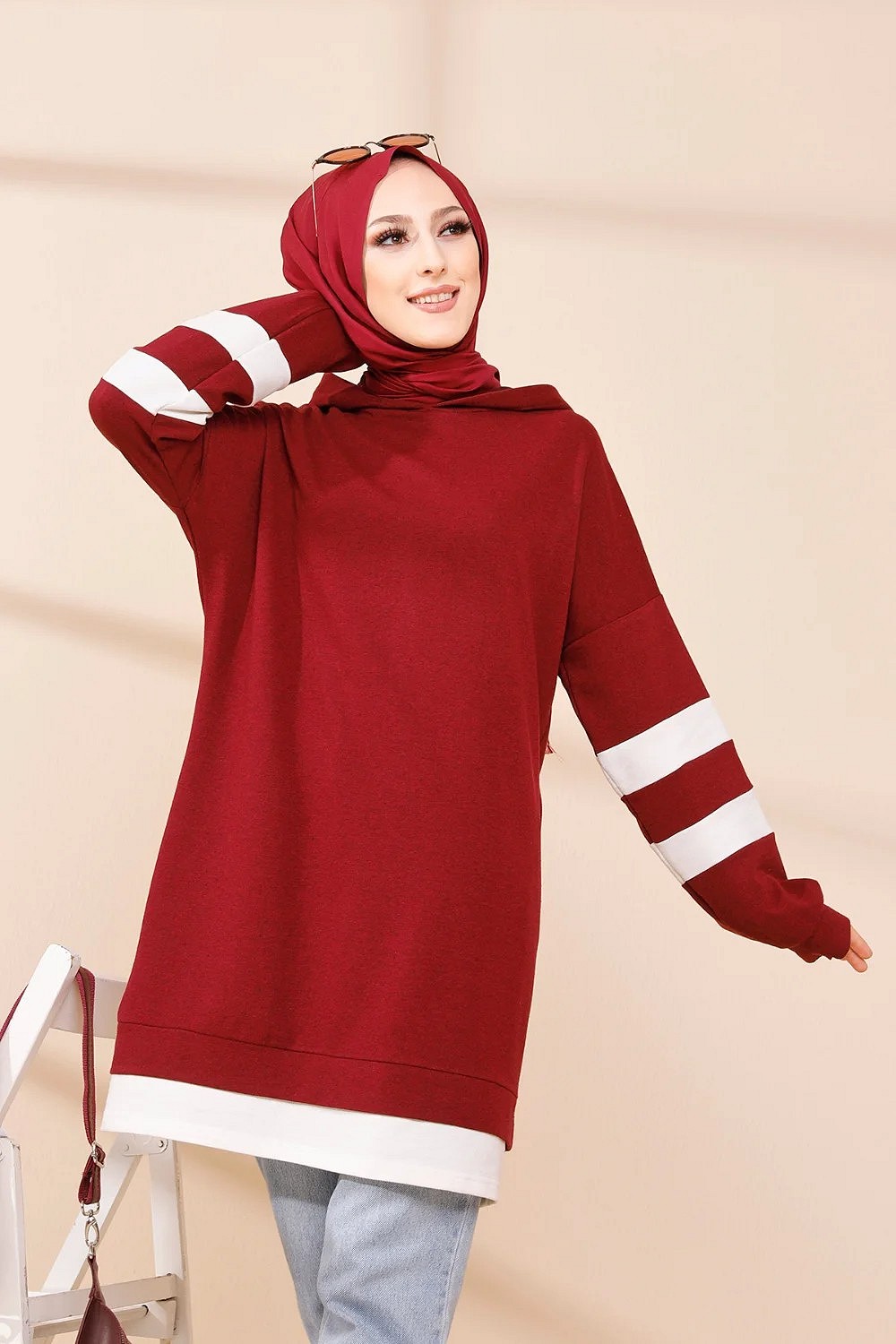 Tunique décontractée avec capuche (Sweat long pour femme voilée) - Couleur rouge bordeaux avec bandes blanches Vetement & Accessoire