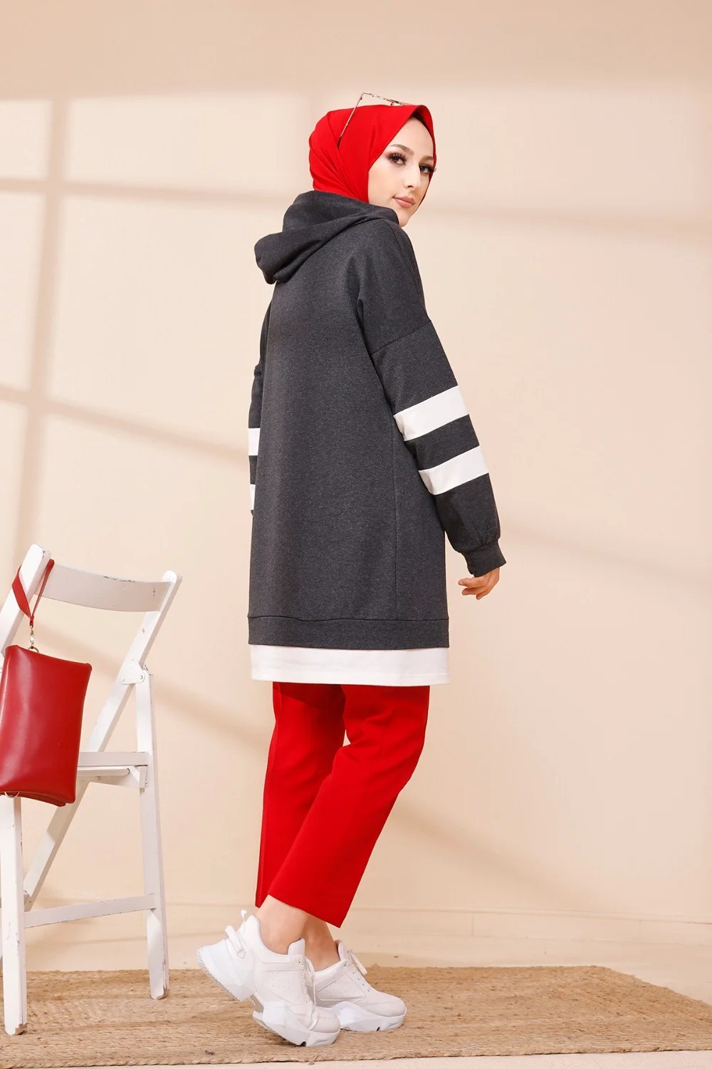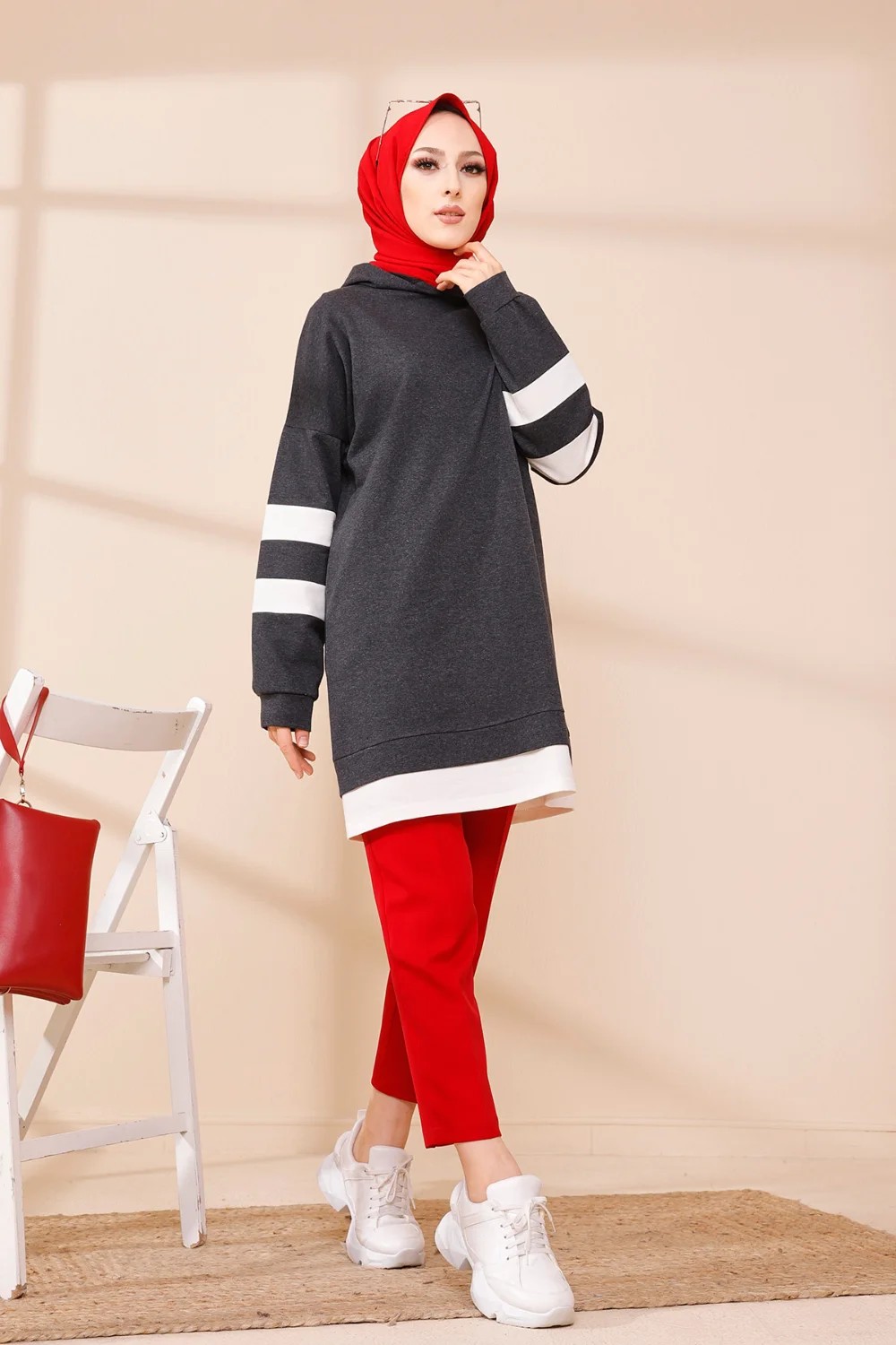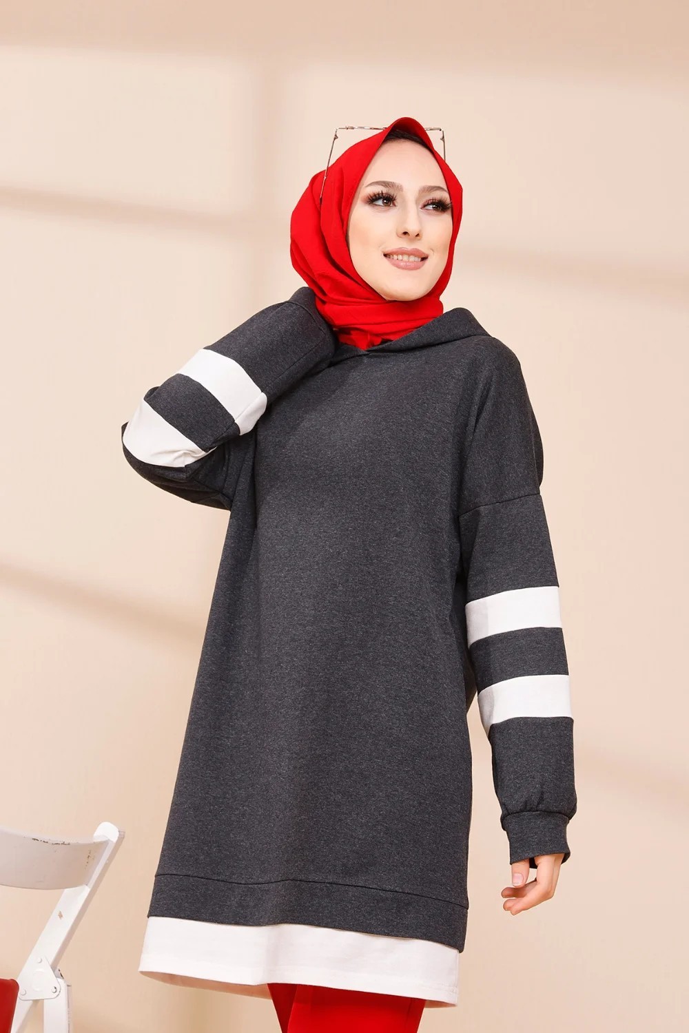 Tunique décontractée avec capuche (Sweat long pour hijab) - Couleur anthracite avec bandes blanches Vetement & Accessoire