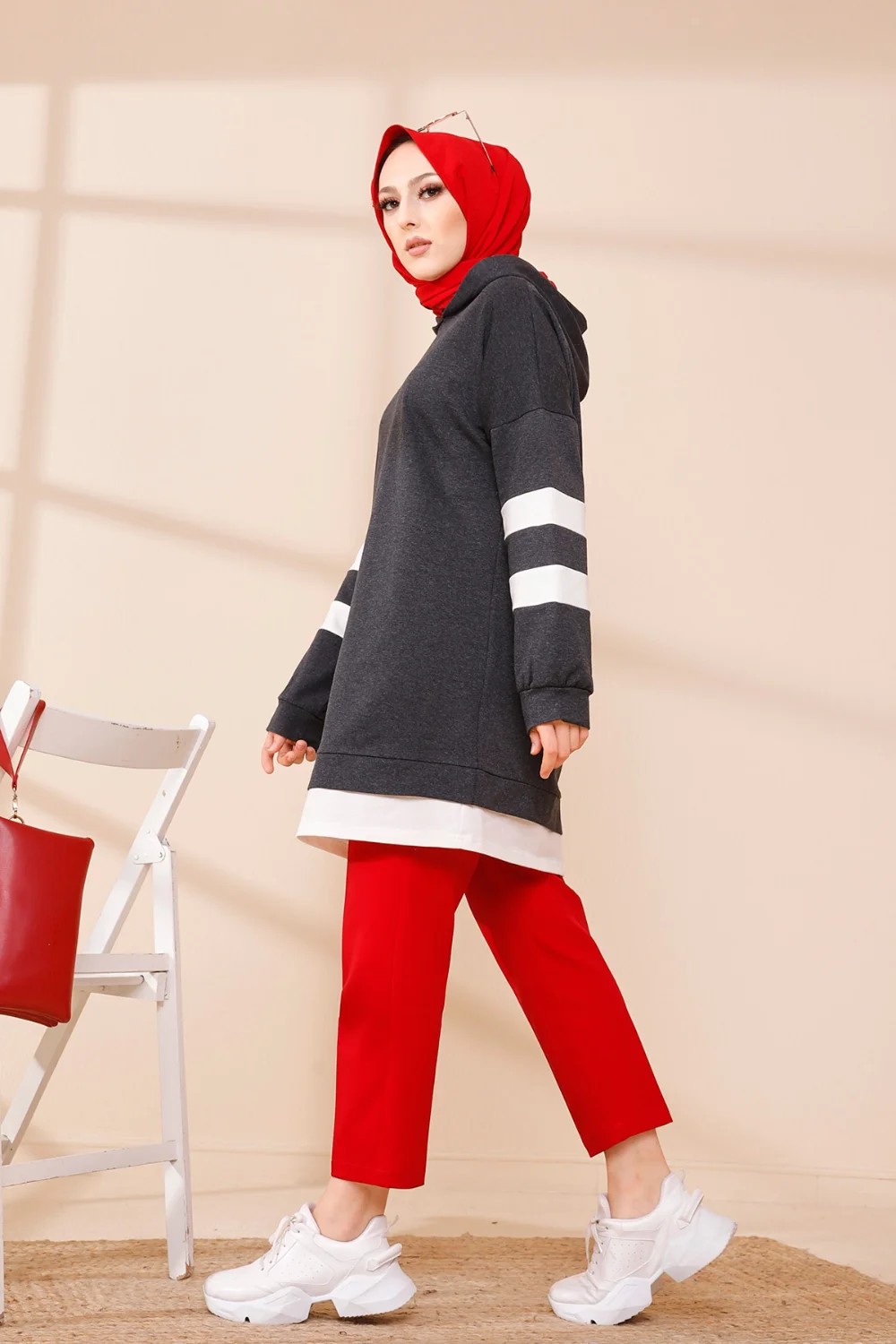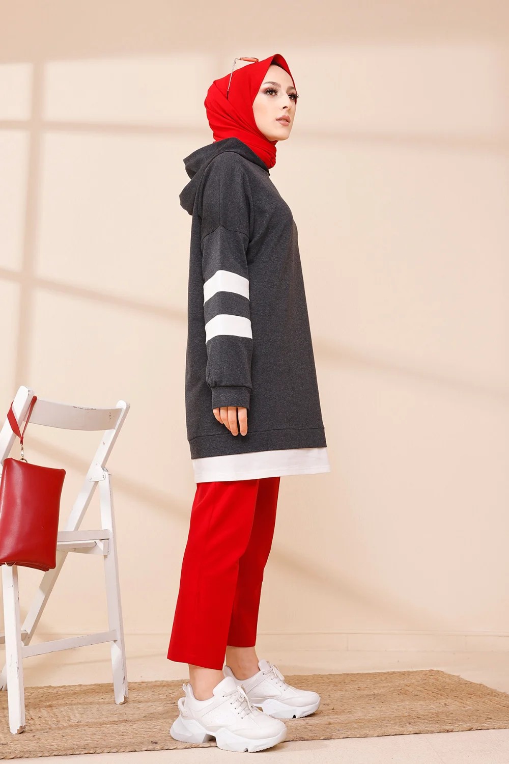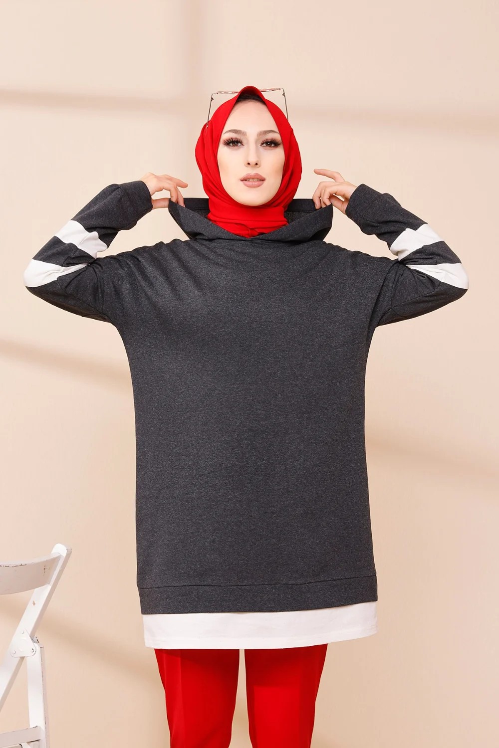 Tunique décontractée avec capuche (Sweat long pour hijab) - Couleur anthracite avec bandes blanches Vetement & Accessoire