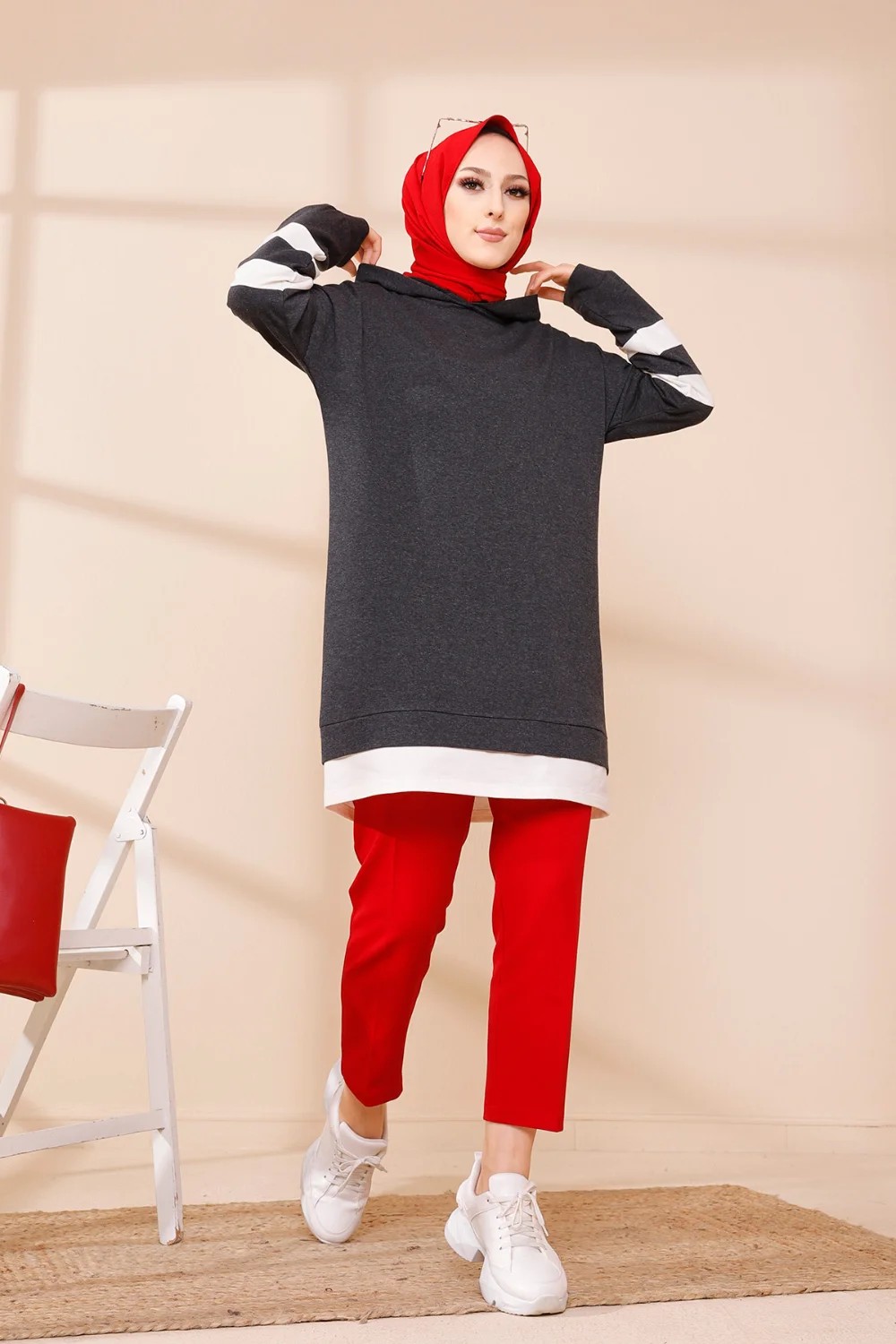 Tunique decontractee avec capuche (Sweat long pour hijab) - Couleur anthracite avec bandes blanches