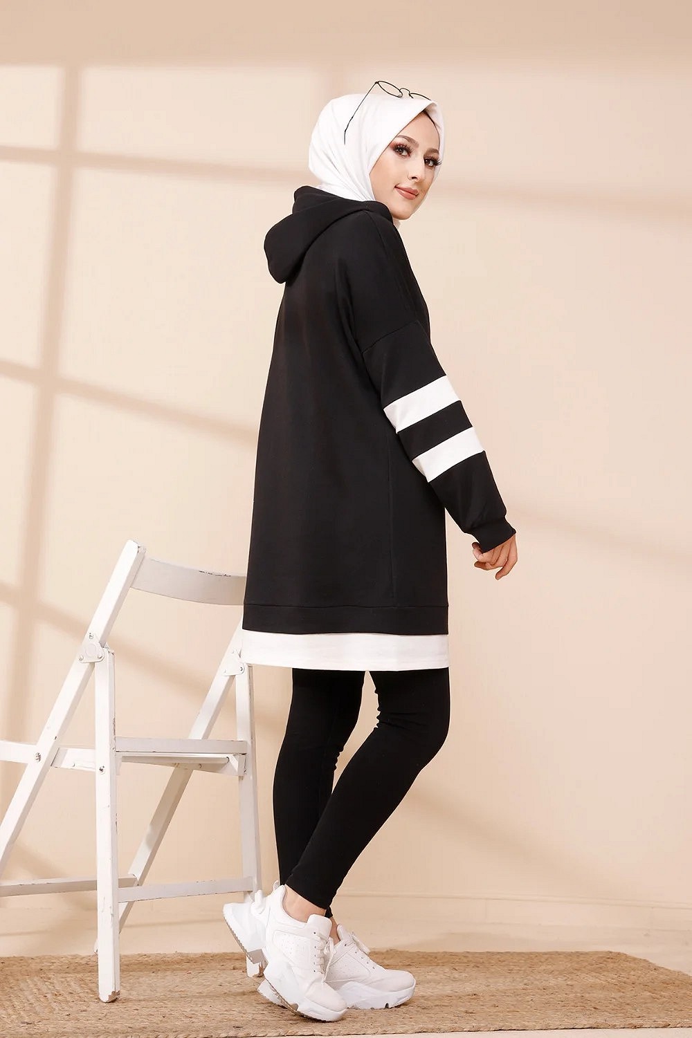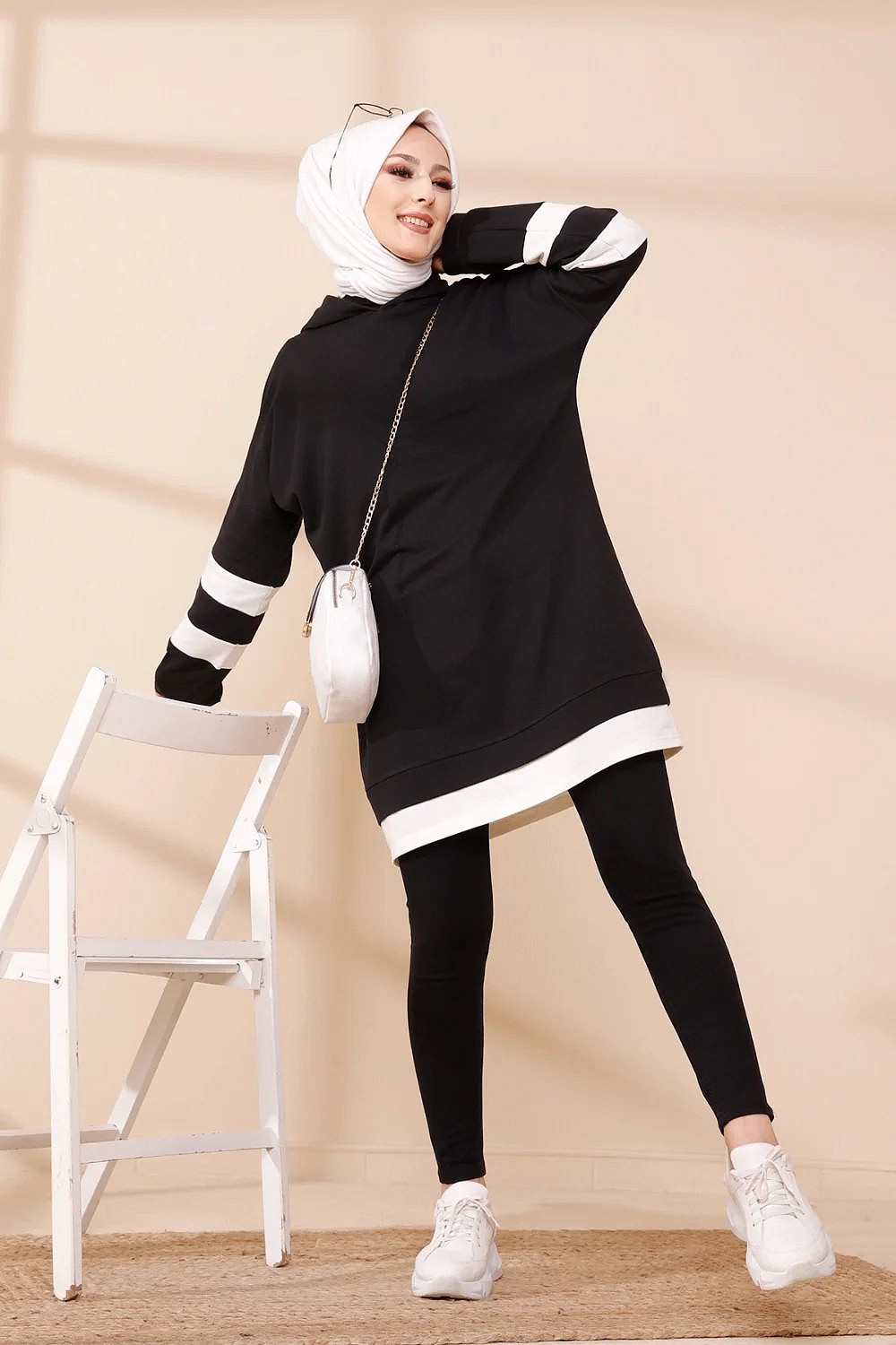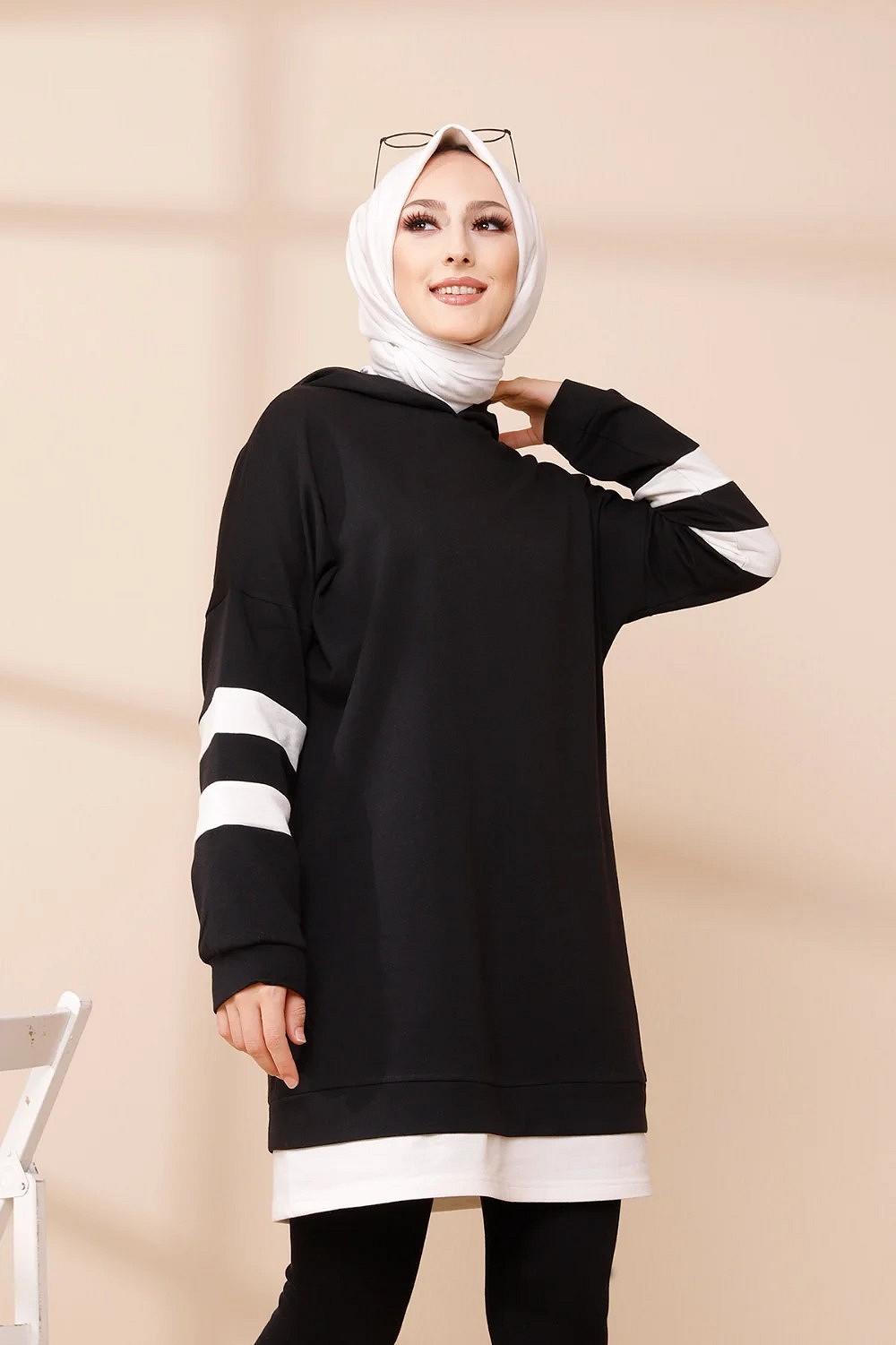 Tunique décontractée avec capuche (Vetement hijab) - Couleur noir avec bandes blanches Vetement & Accessoire