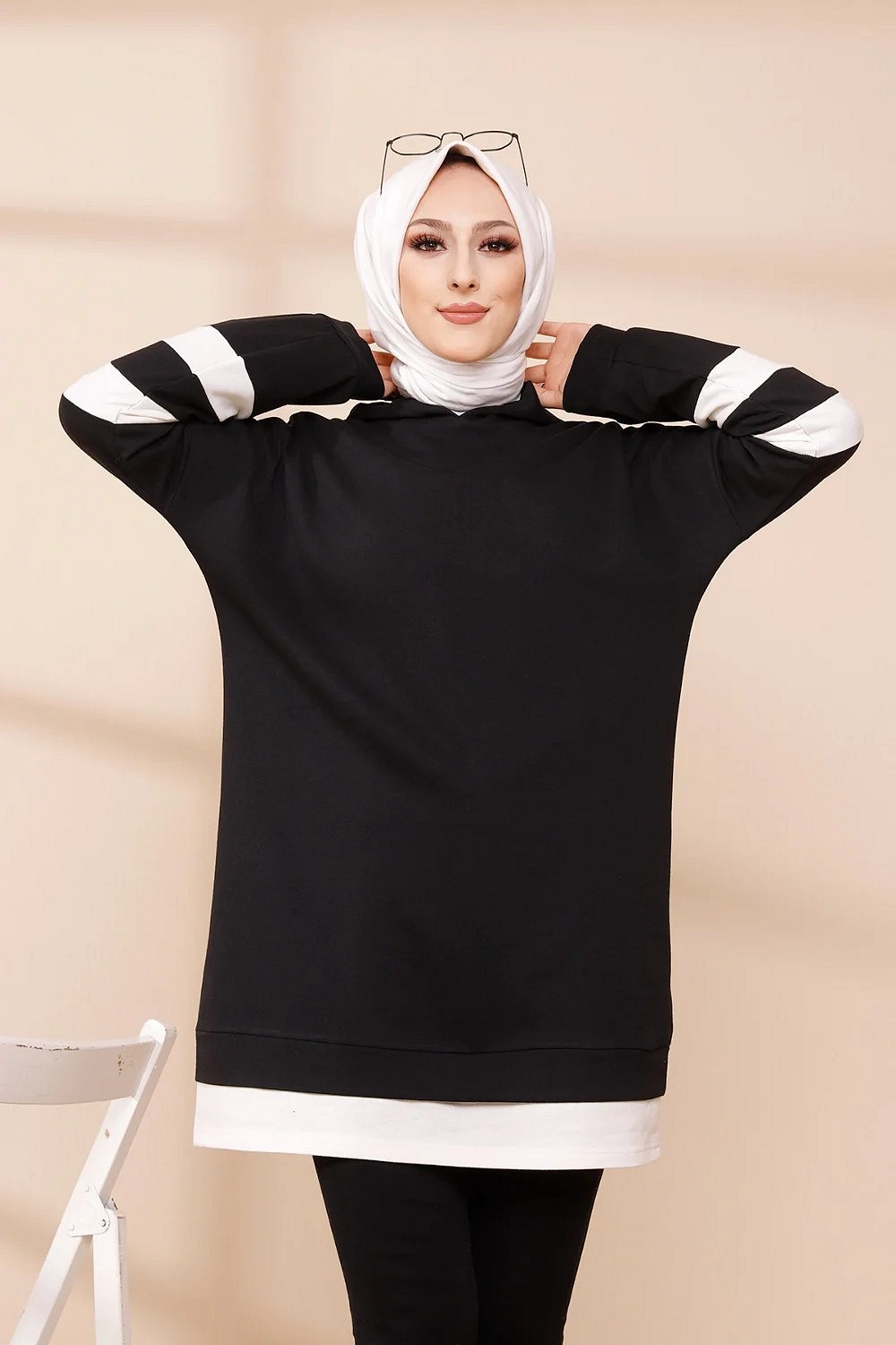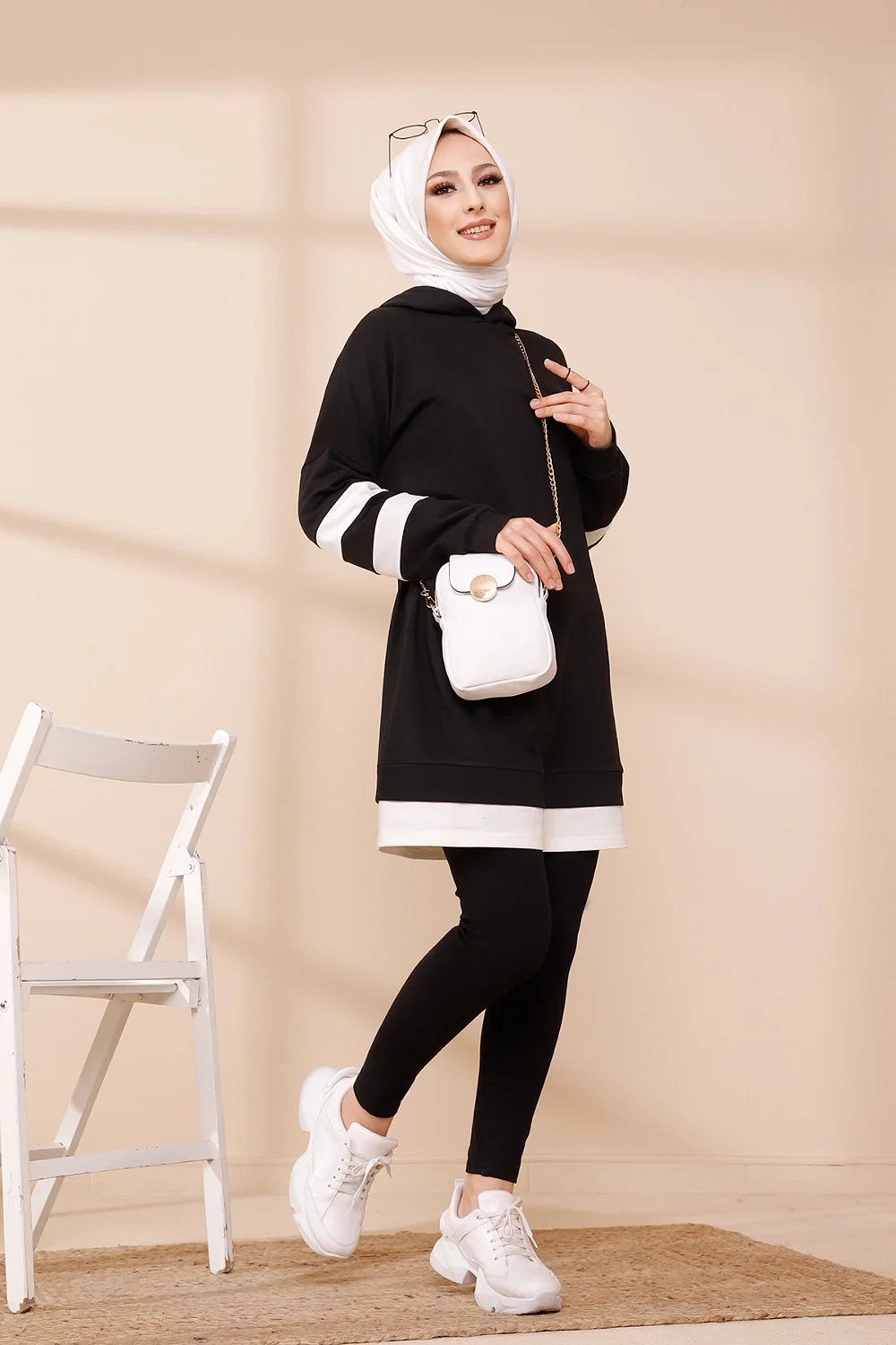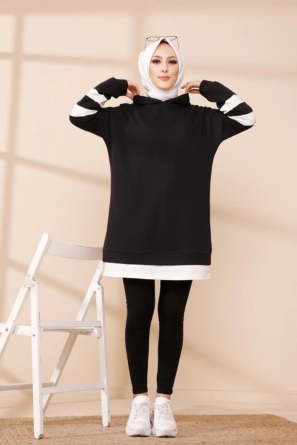 Tunique décontractée avec capuche (Vetement hijab) - Couleur noir avec bandes blanches Vetement & Accessoire