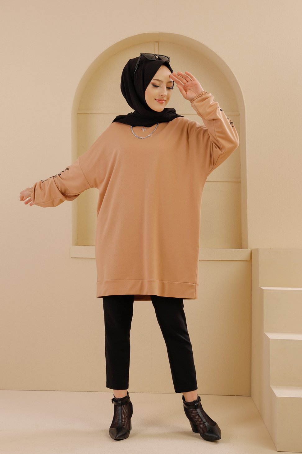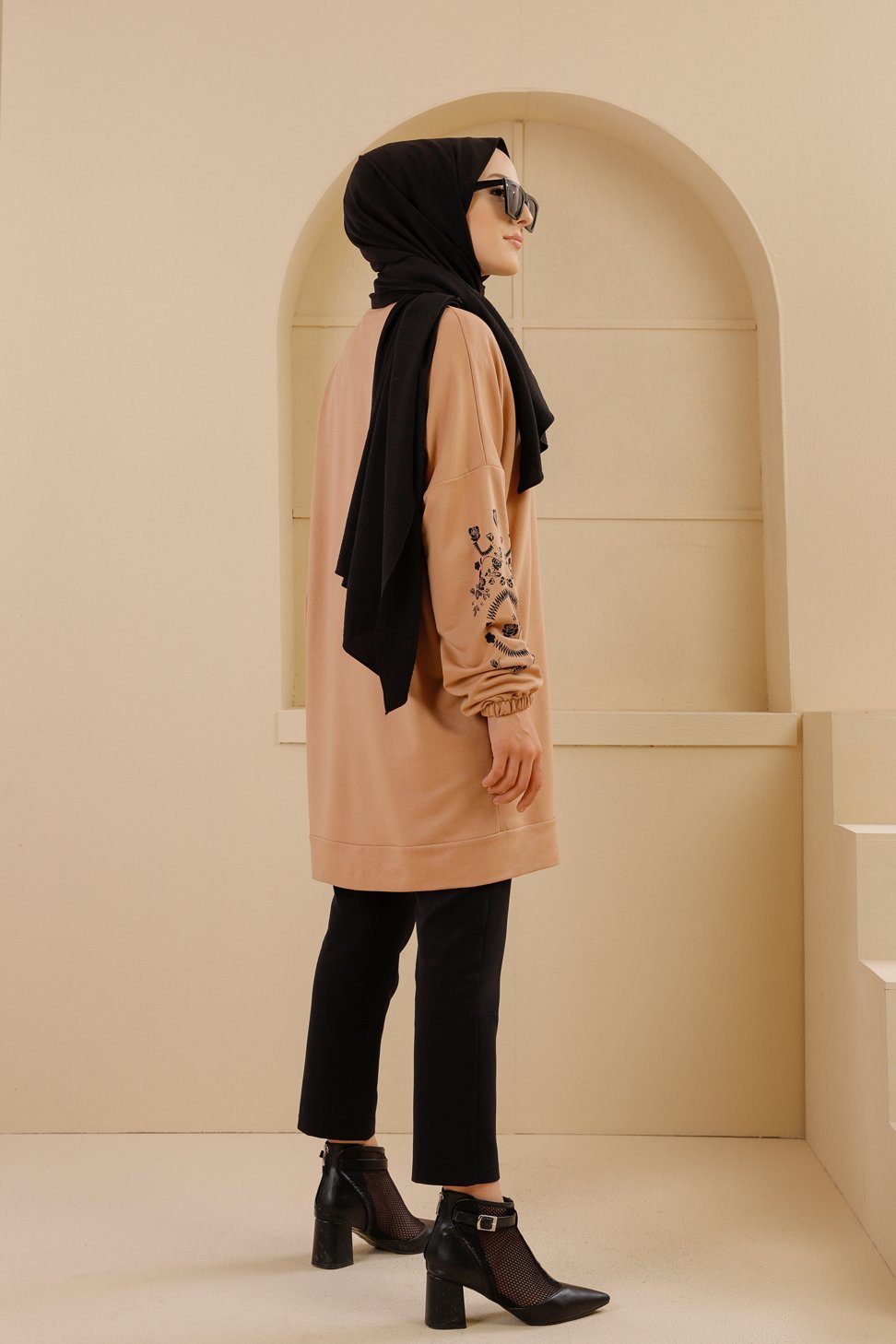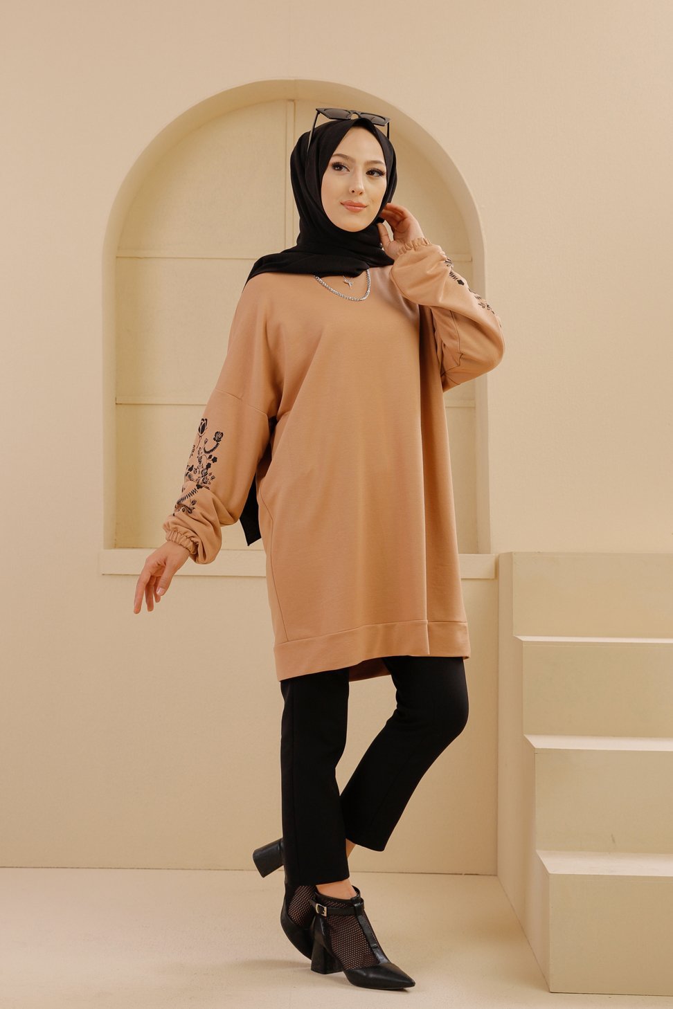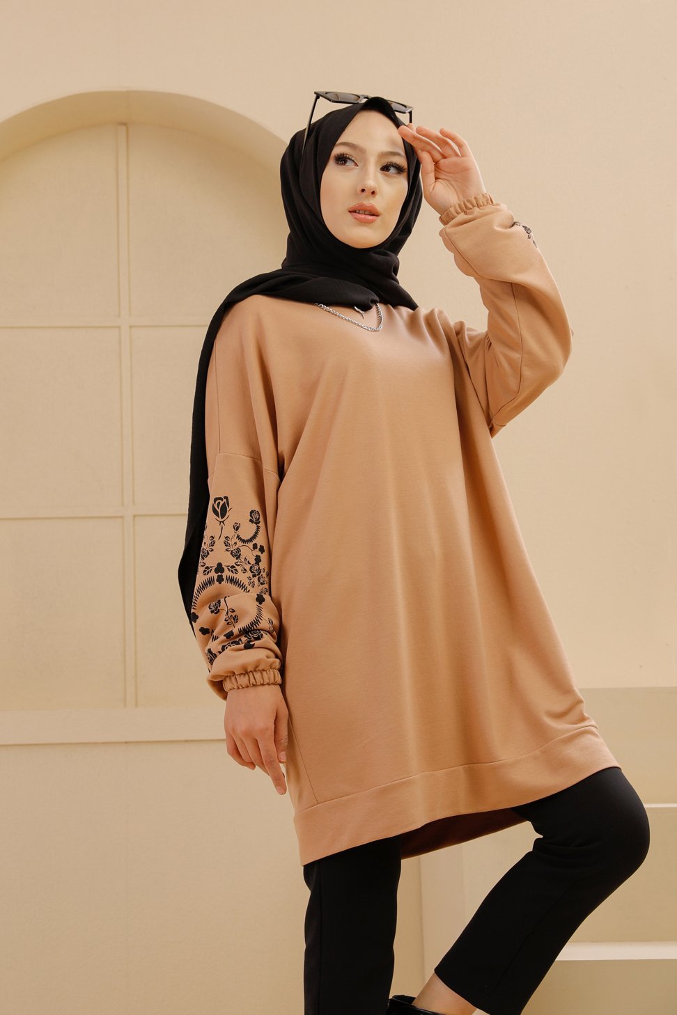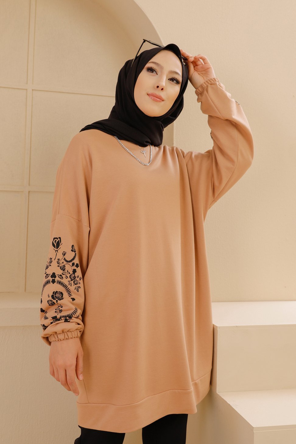 Tunique decontractee avec manches a motif fleurs (Tenue Hijab pour femme musulmane) - Couleur beige