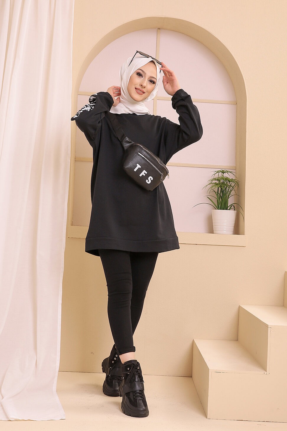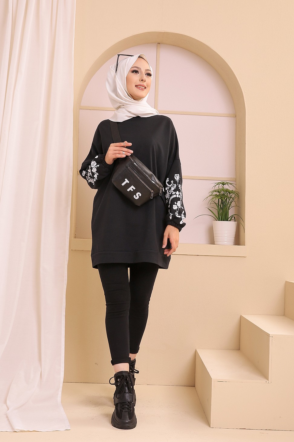 Tunique decontractee avec manches a motif fleurs (Tenue Hijab pour femme musulmane) - Couleur noir