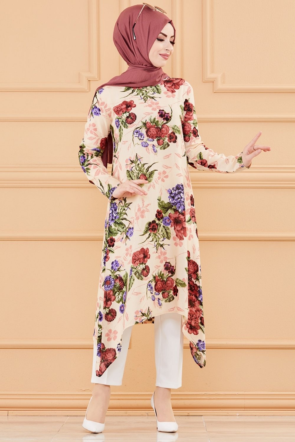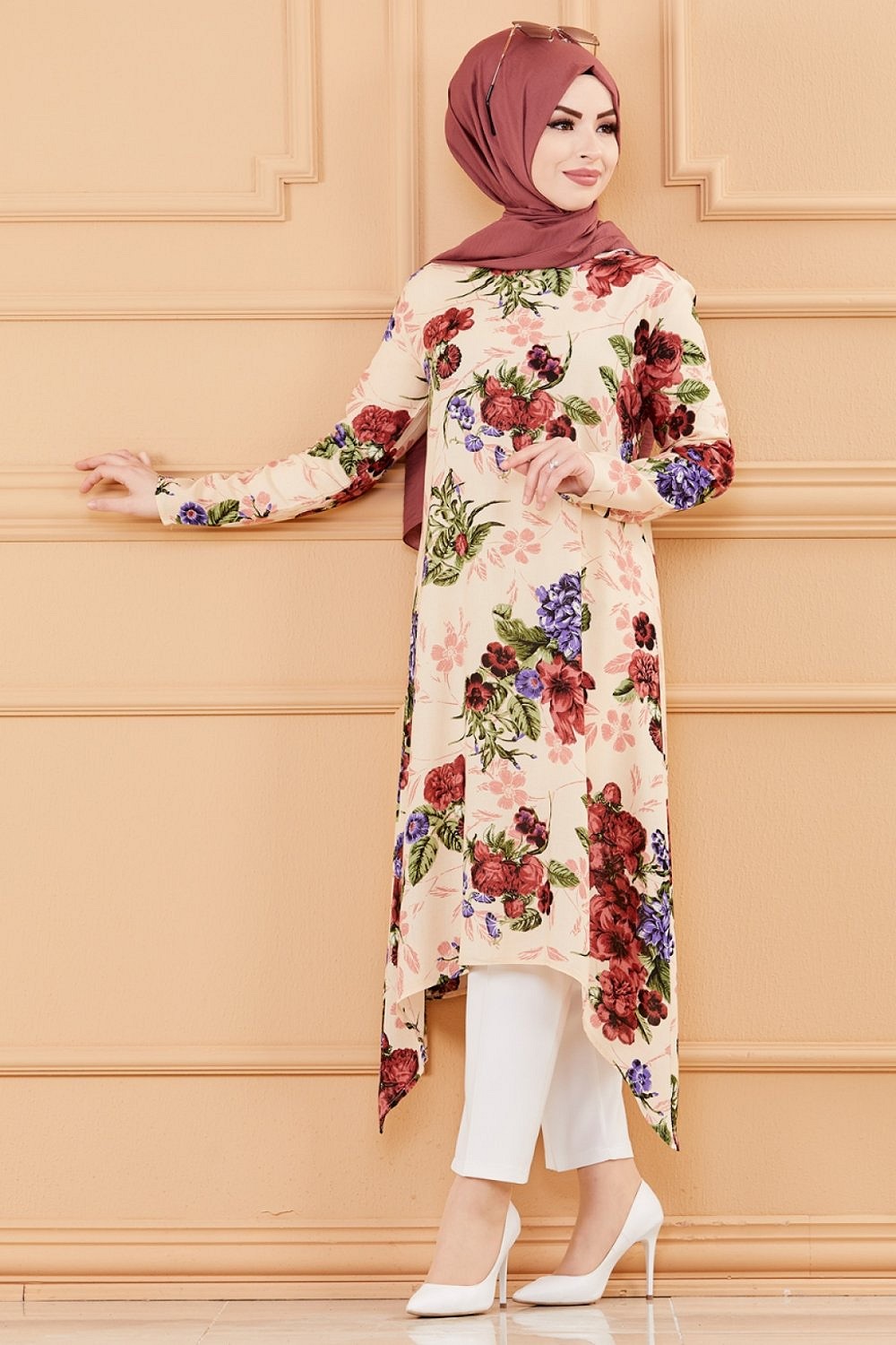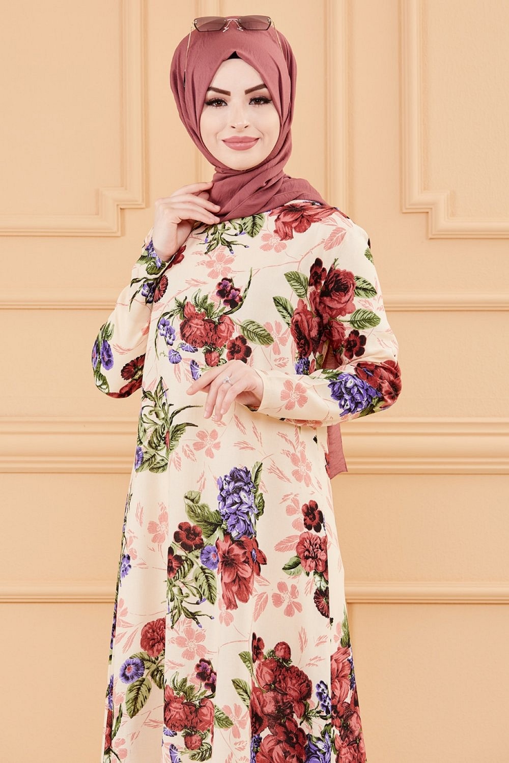 Tunique fleurie ample (Vêtement chic pour femme voilée - Nouveauté) - Couleur beige Vetement & Accessoire