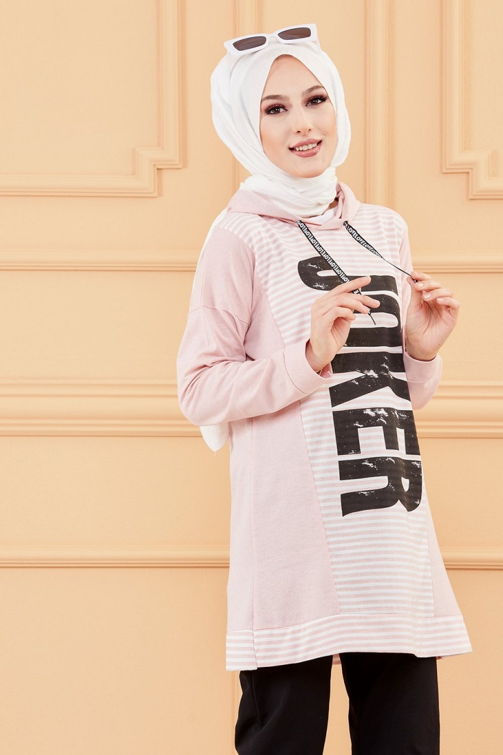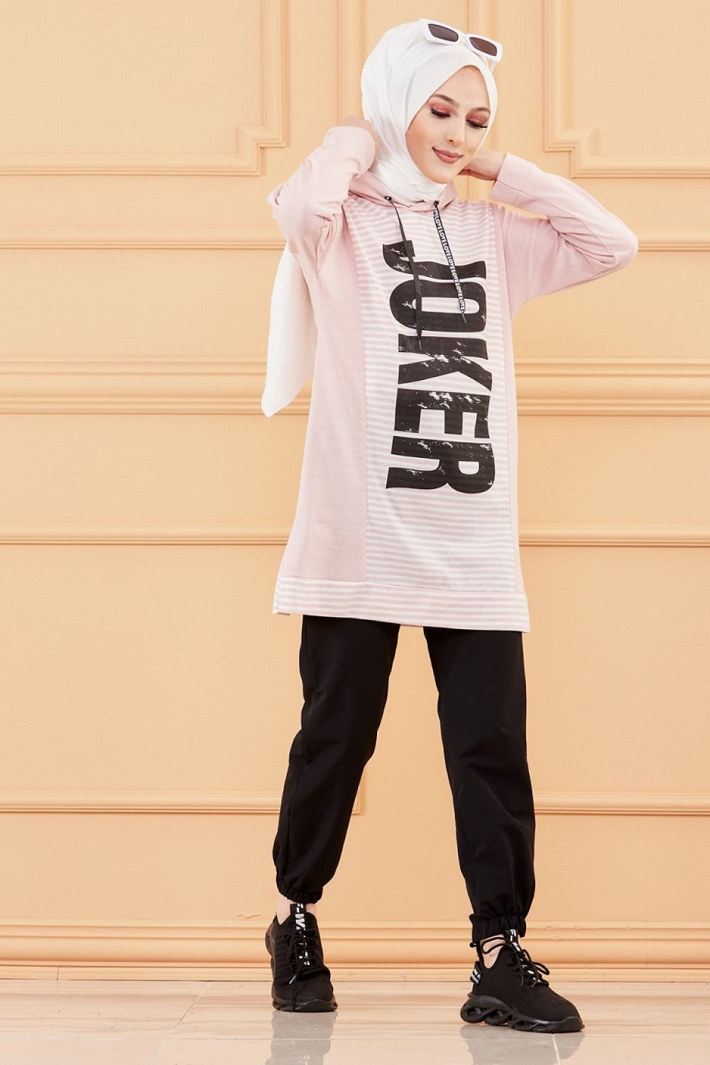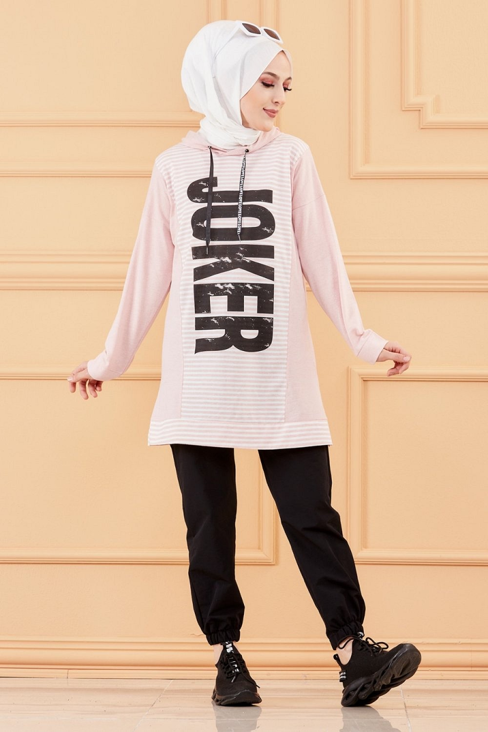 Tunique imprimée Joker - Sweat long à capuche (Mode pour jeune femme musulmane) - Couleur rose poudré Vetement & Accessoire