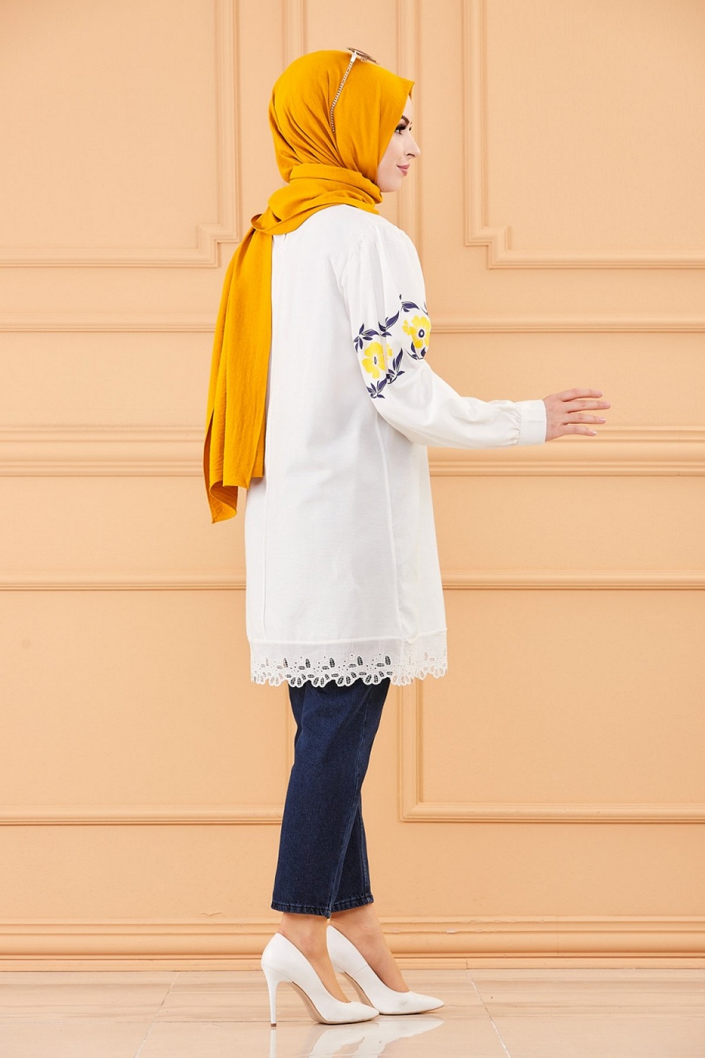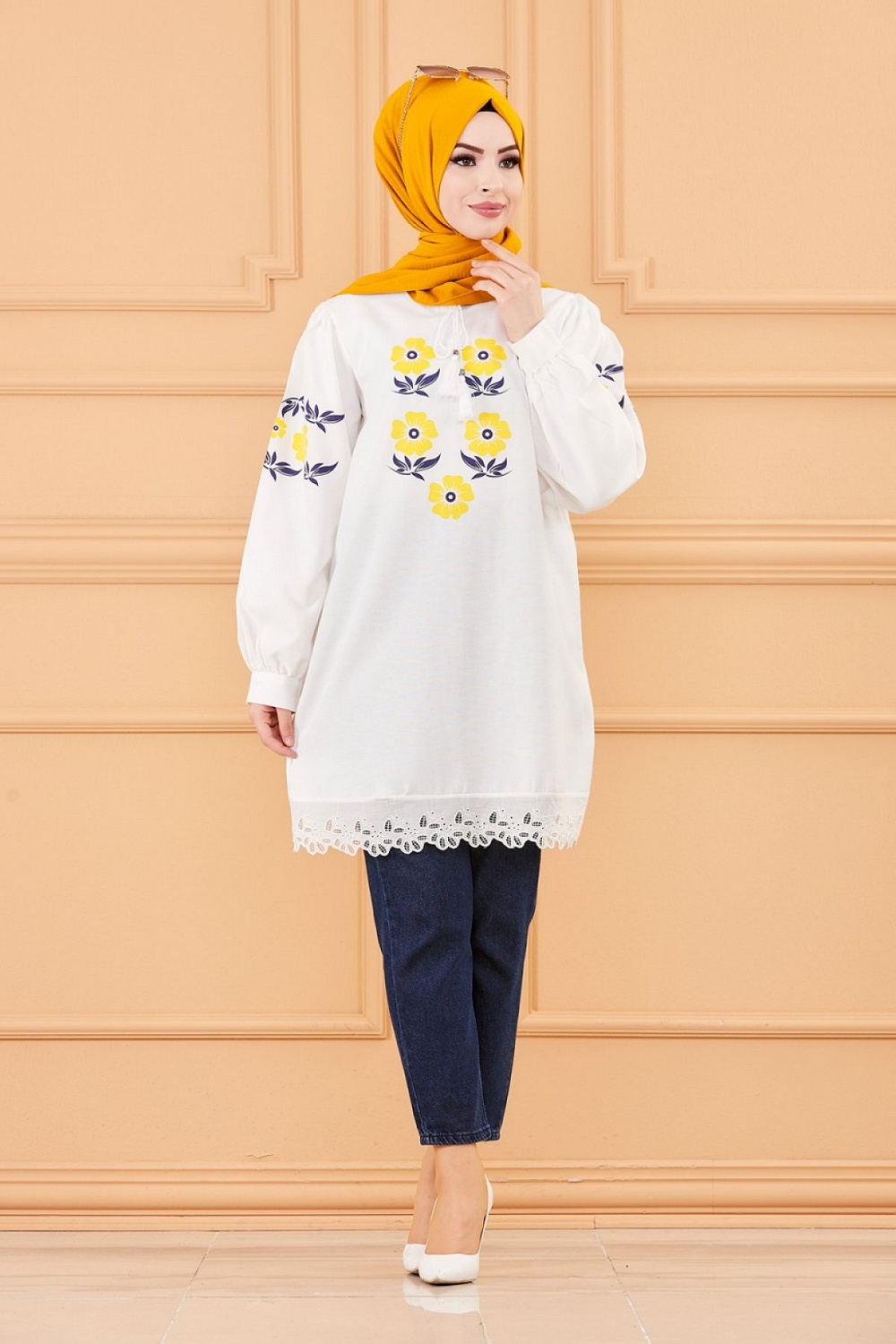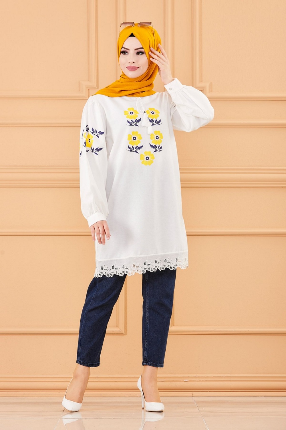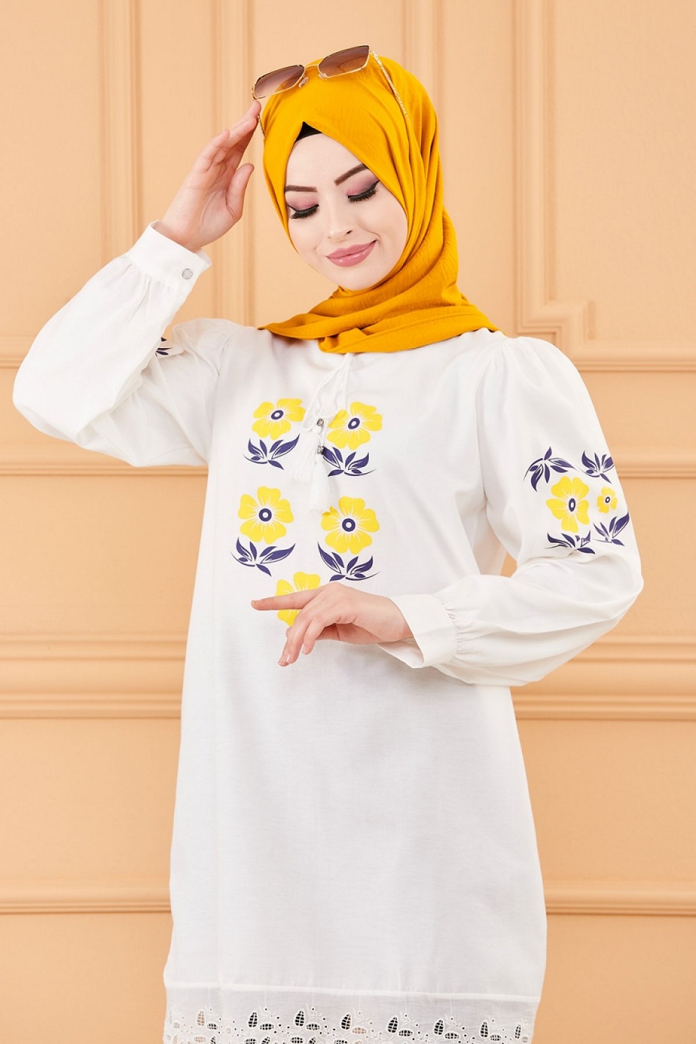 Tunique imprimee a fleurs pour femme - Couleur blanc avec fleurs de couleur jaune