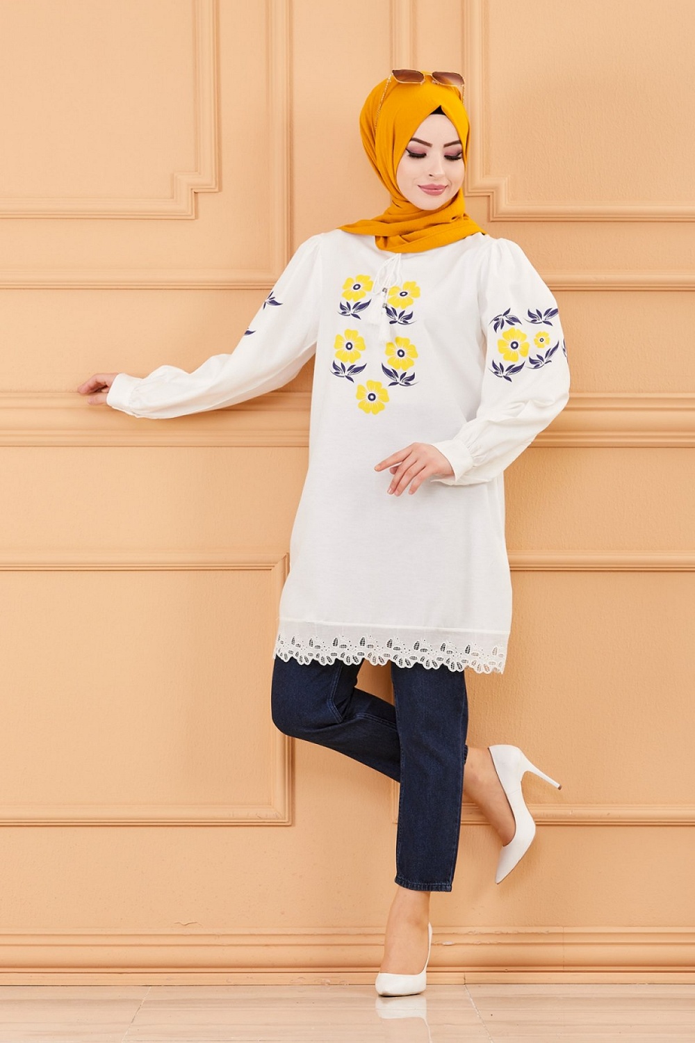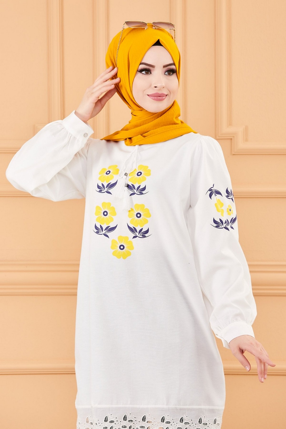 Tunique imprimée à fleurs pour femme - Couleur blanc avec fleurs de couleur jaune Vetement & Accessoire