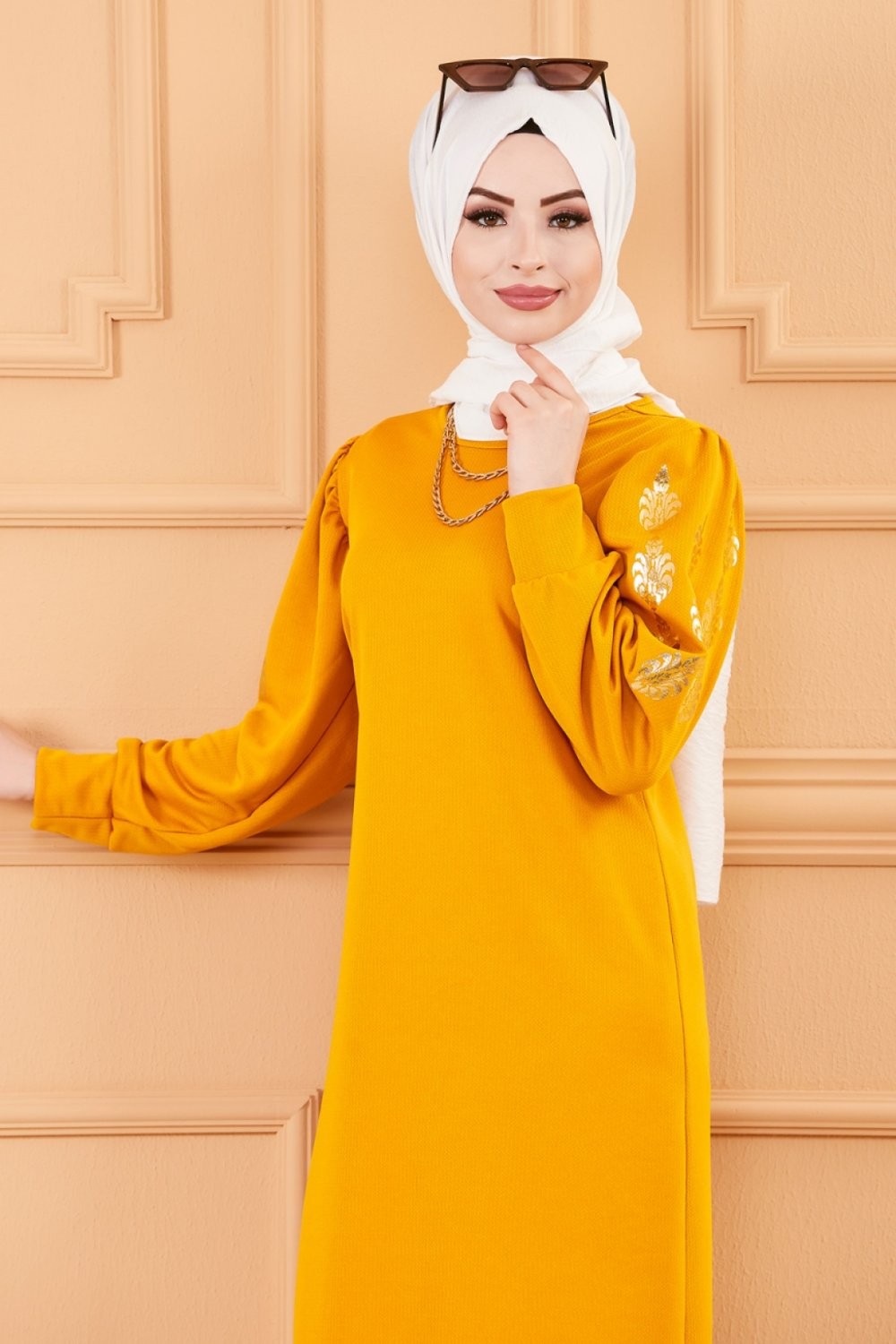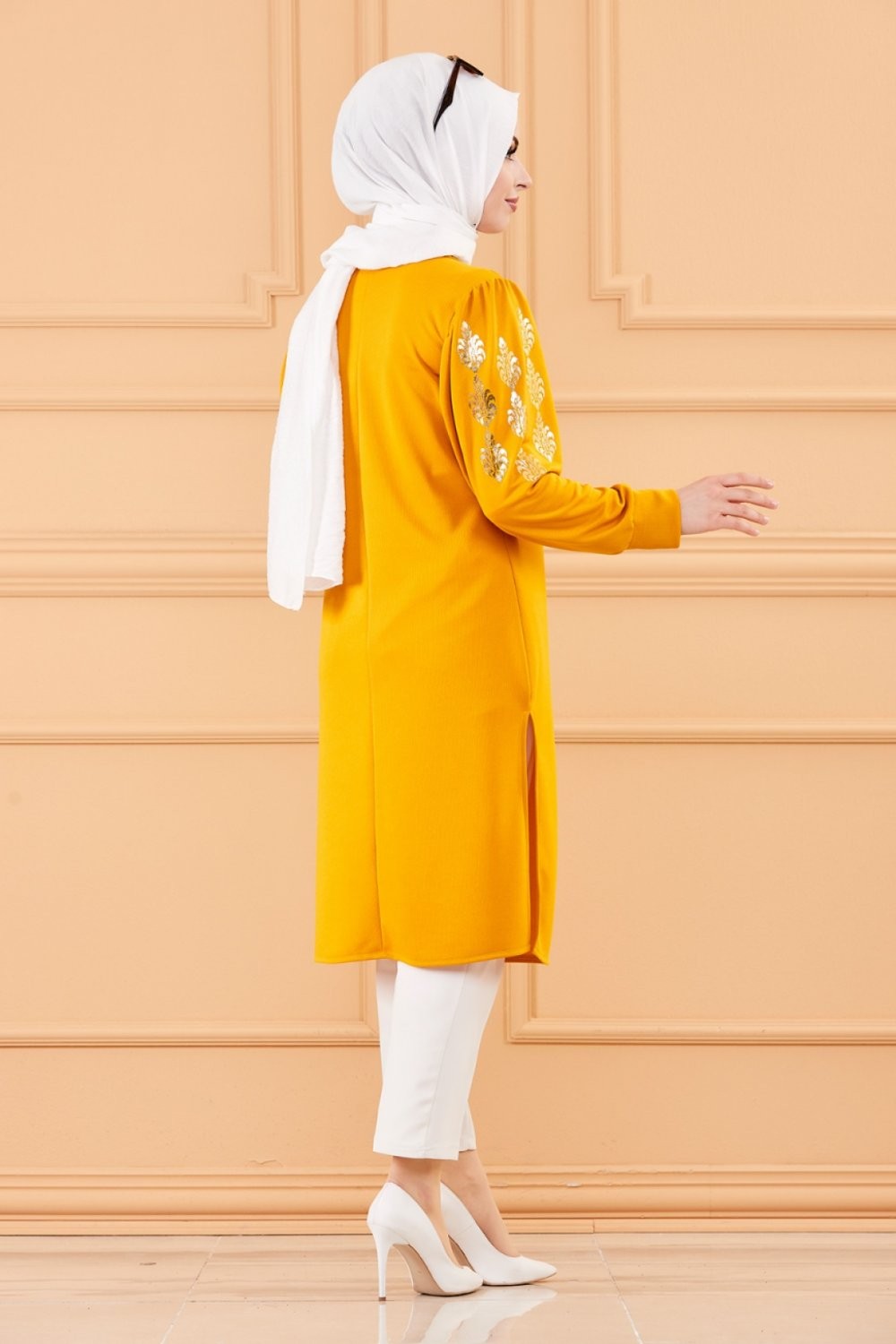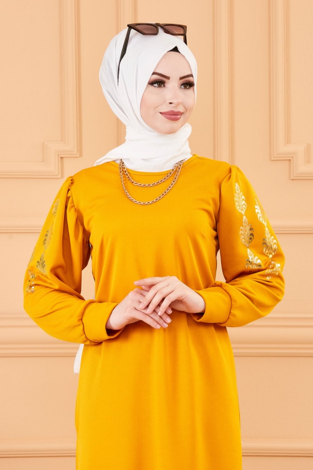 Tunique longue avec dorures (Vêtement à la mode pour femme voilée) - Couleur moutarde Vetement & Accessoire