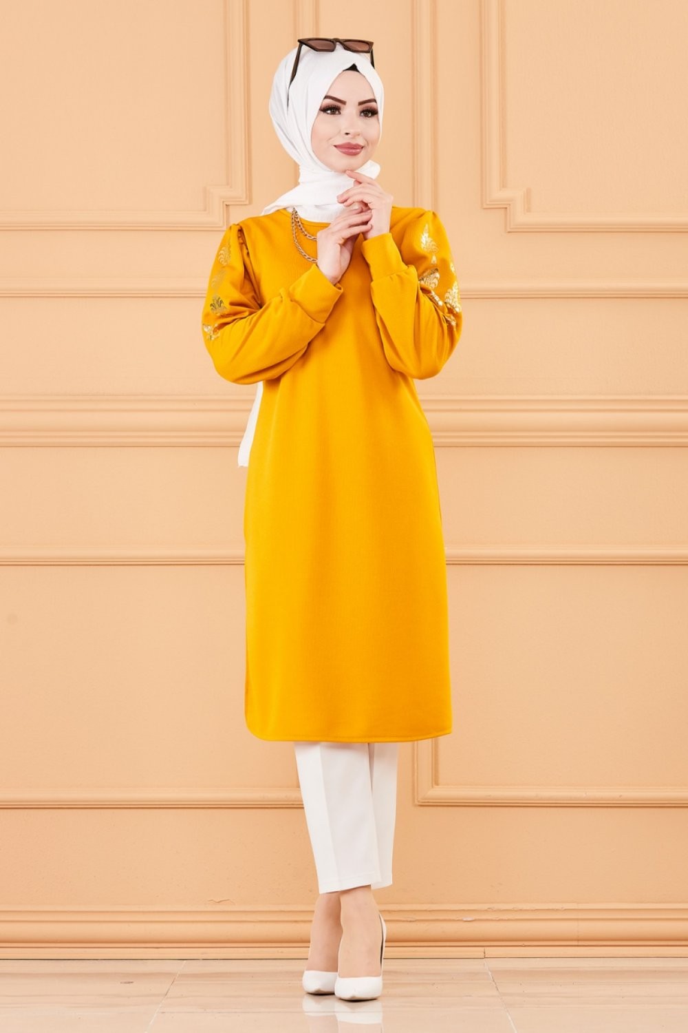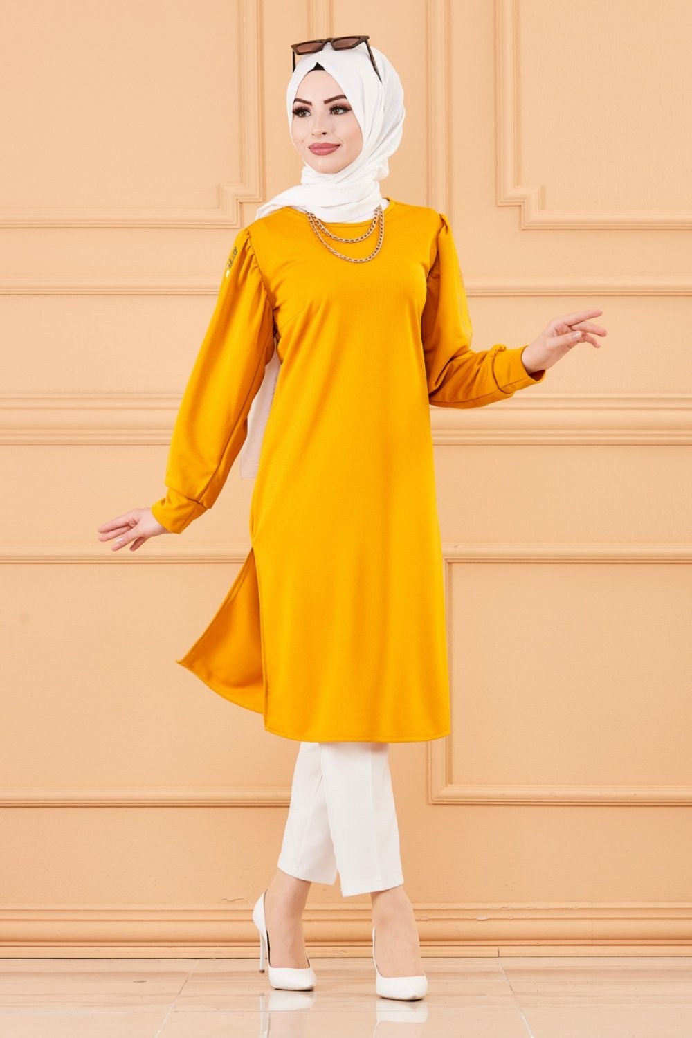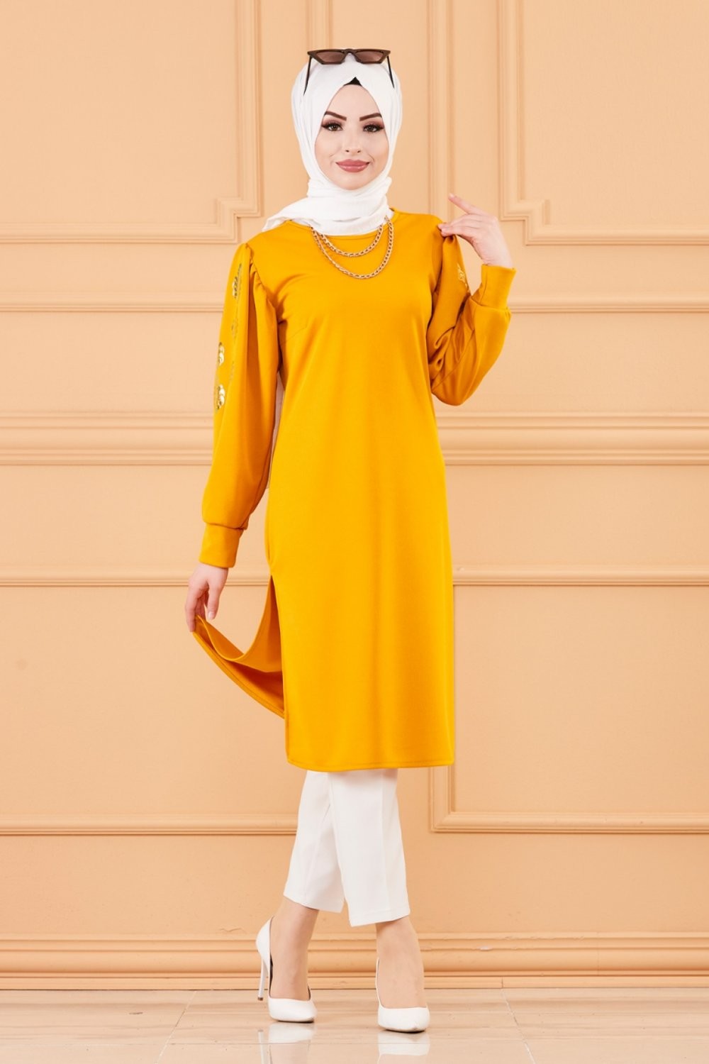 Tunique longue avec dorures (Vêtement à la mode pour femme voilée) - Couleur moutarde Vetement & Accessoire