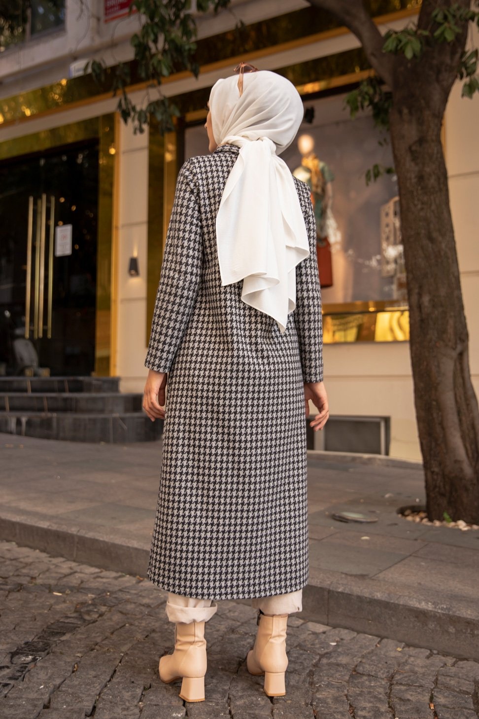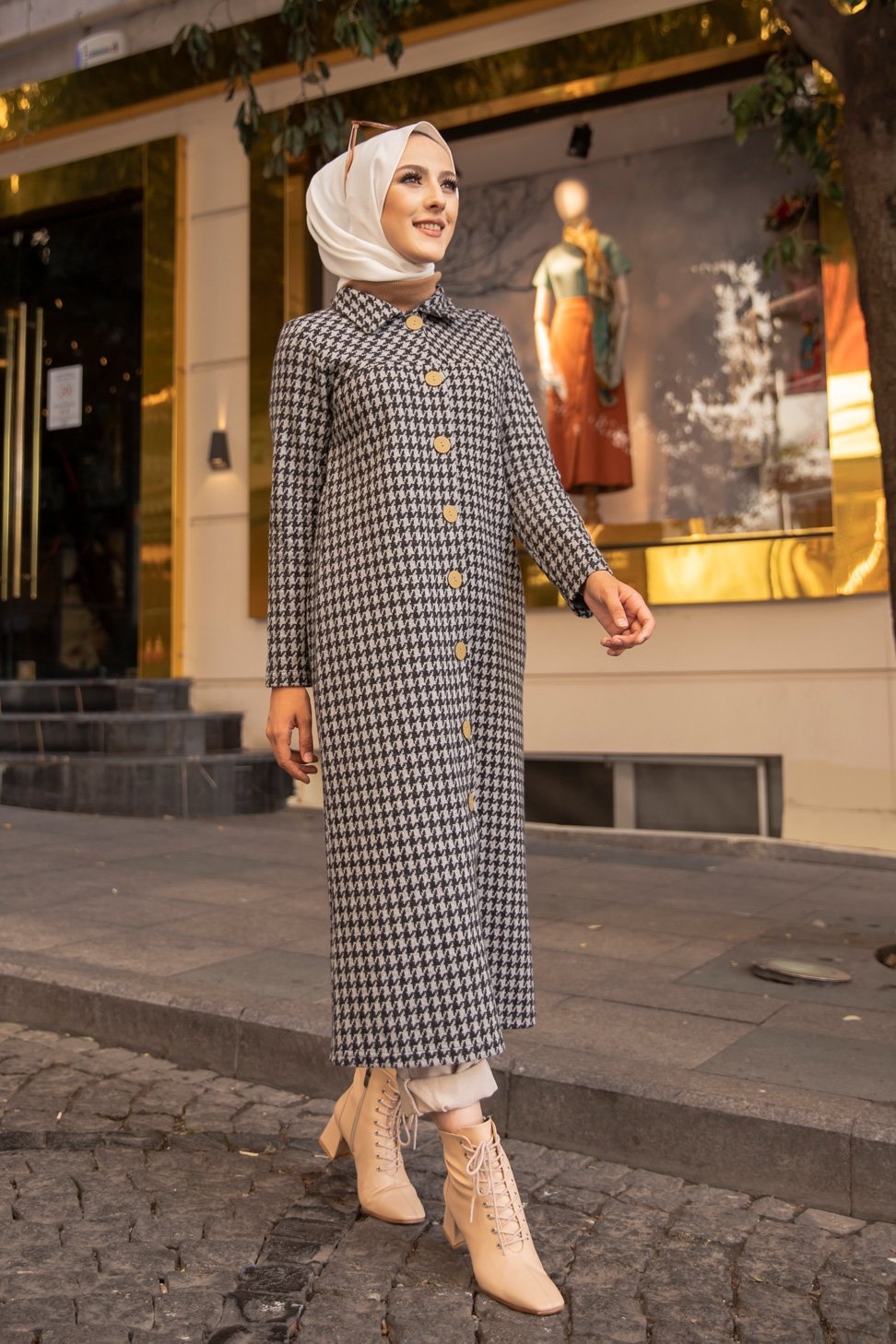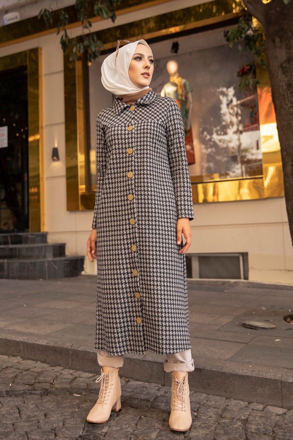 Veste à carreaux pour femme (Tenue Hijab Saison Automne Hiver) - Couleur noir et beige - REF. 35547 (30.00 €) - En Promotion à 24.90 €
