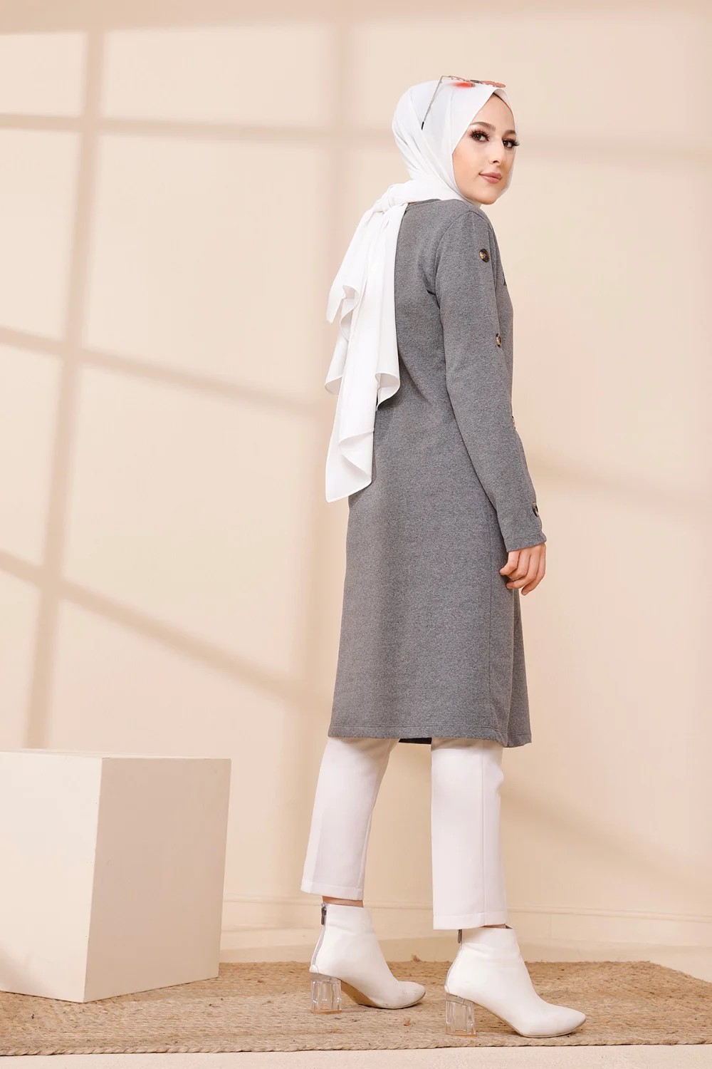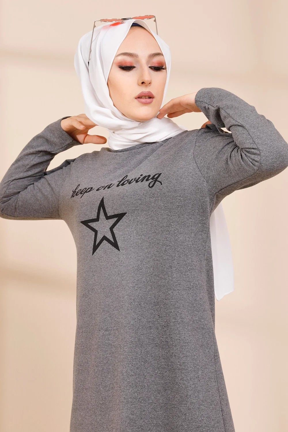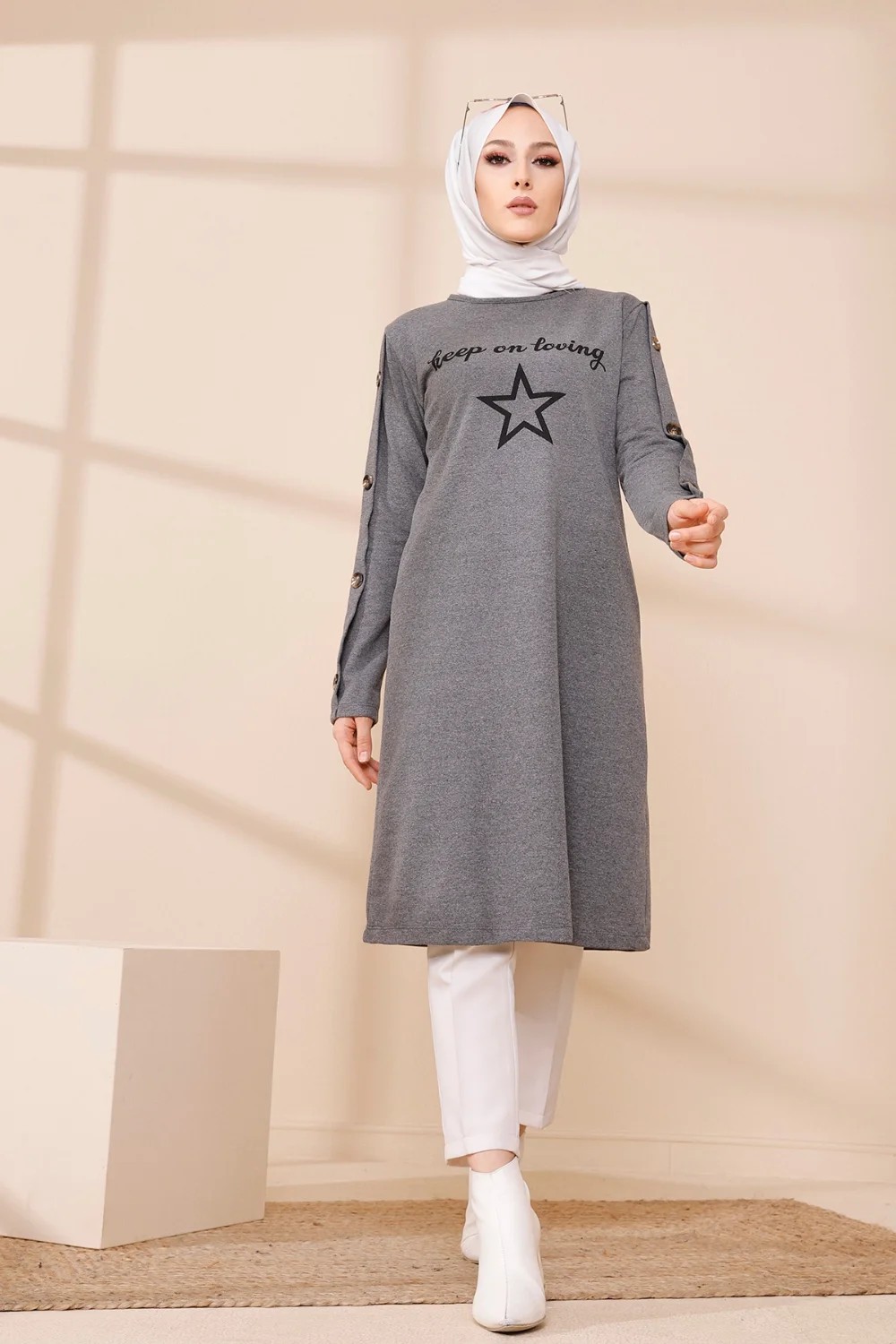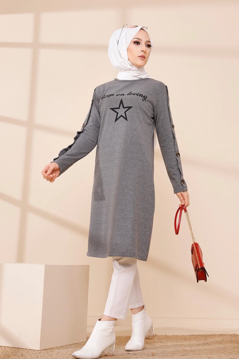Tunique type sweat long à capuche (Vêtement moderne décontracté pour Hijab) - Couleur gris - REF. 35423 (22.00 €) - En Promotion à 16.90 €