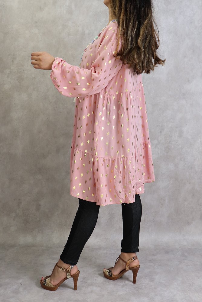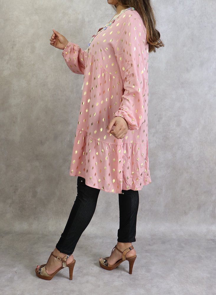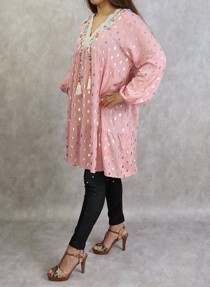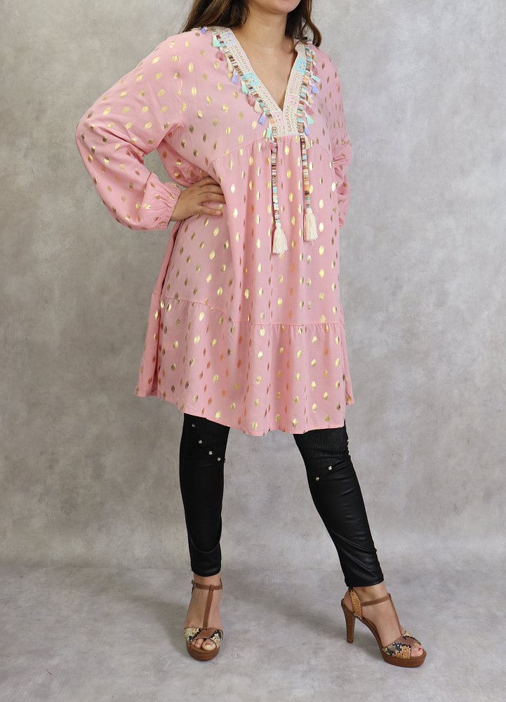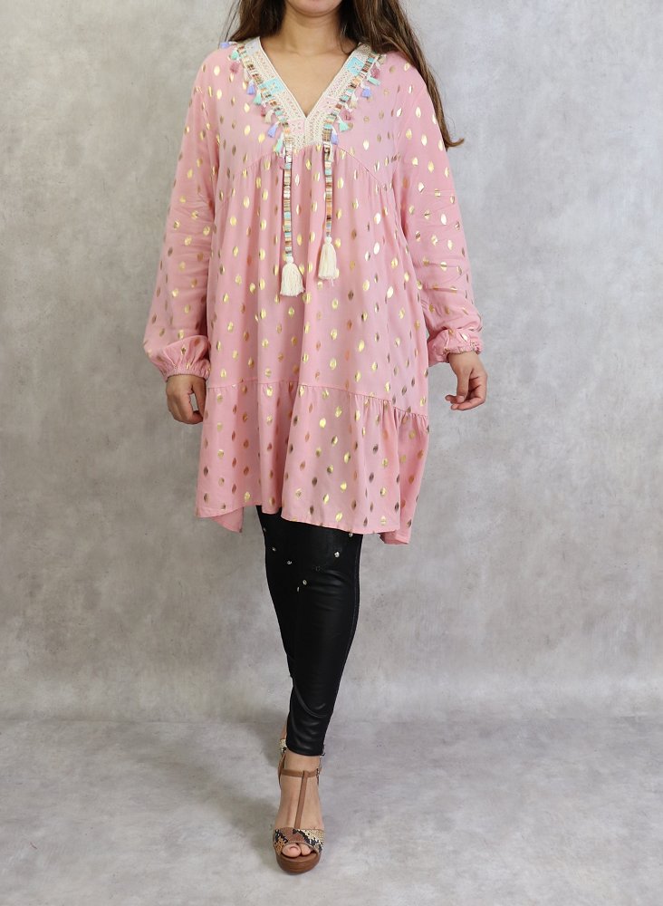 Tunique longue, col en V avec broderies, manches longues, poignets élastiques. Motifs dorés. Coupe évasée, matière légère et fluide.