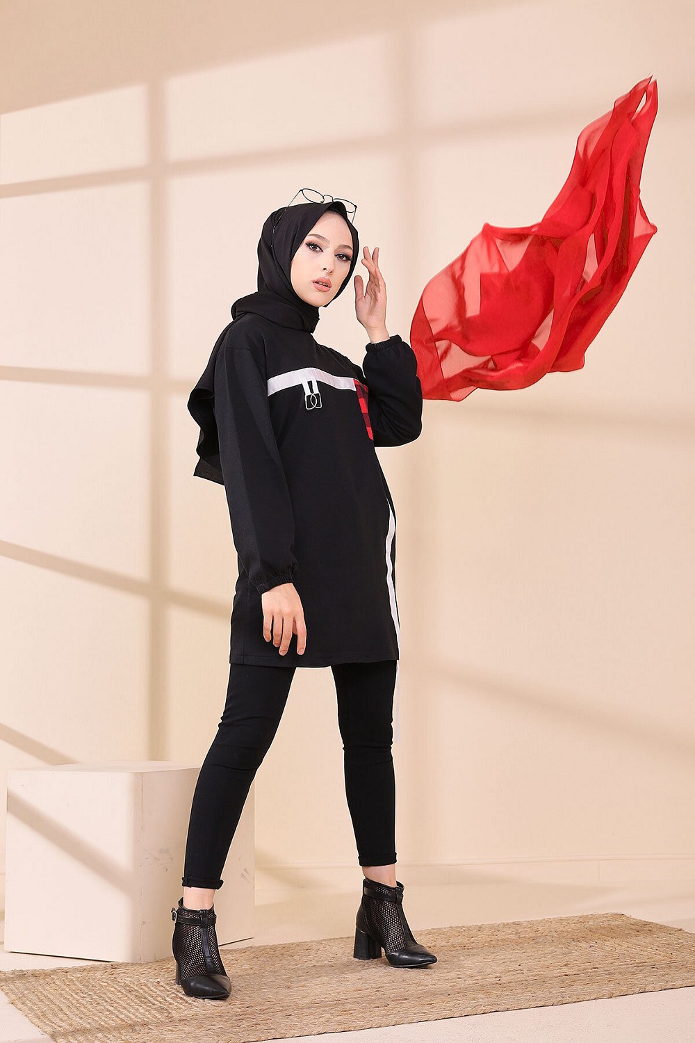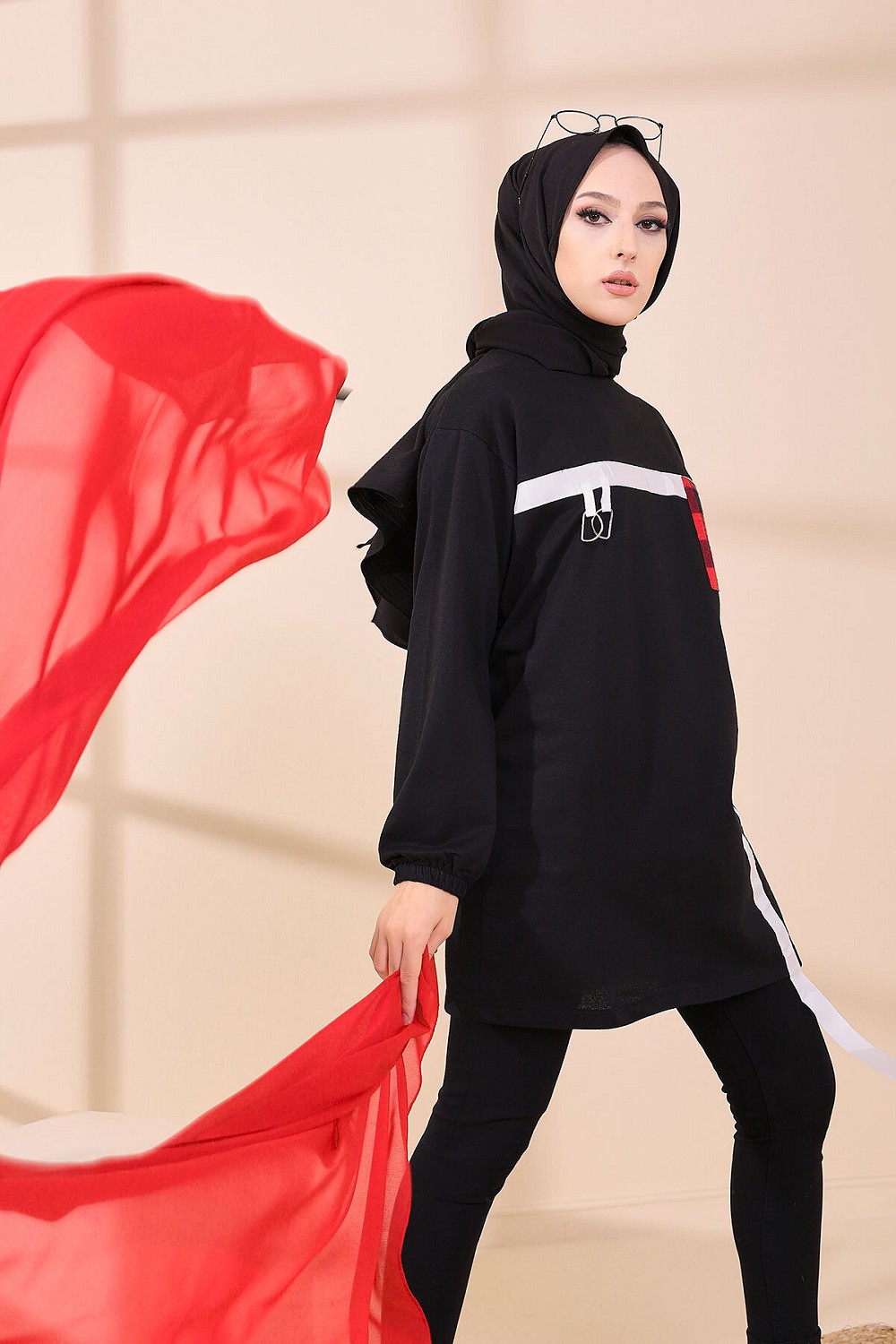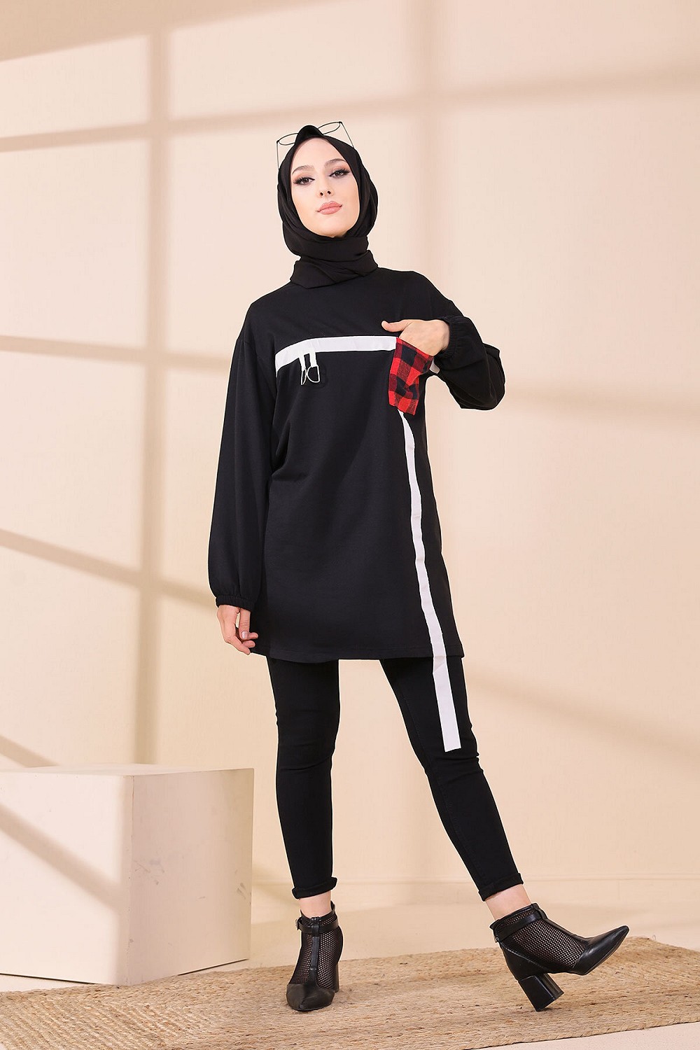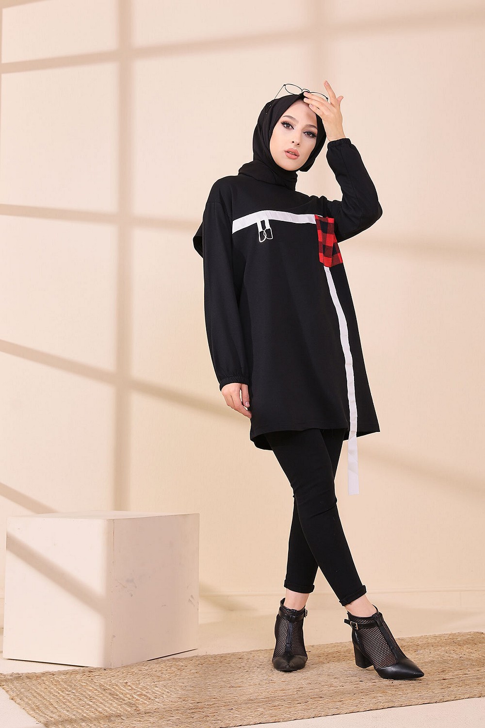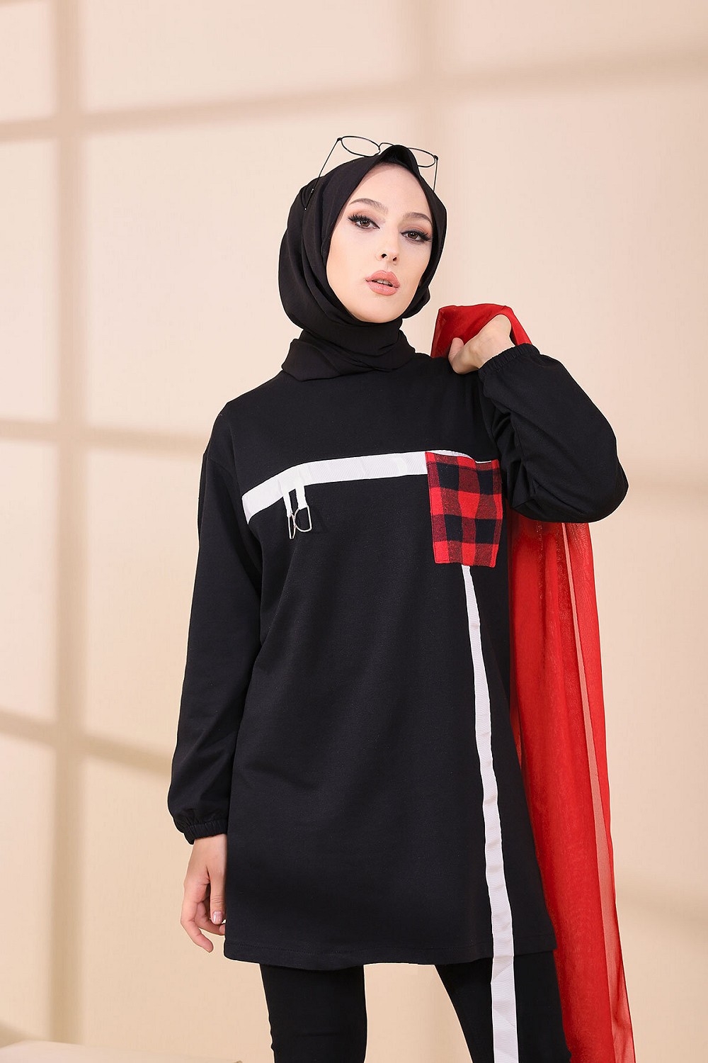 Tunique moderne avec poche a carreaux pour femme (Sweat style fashion mode musulmane) - Couleur noir