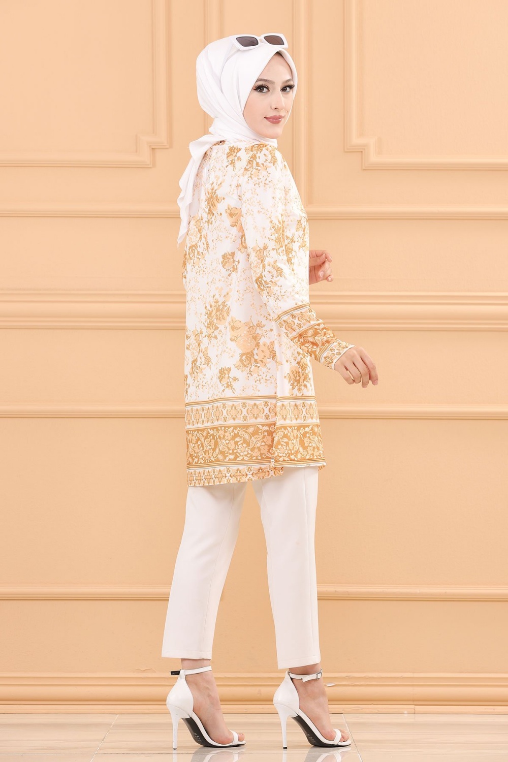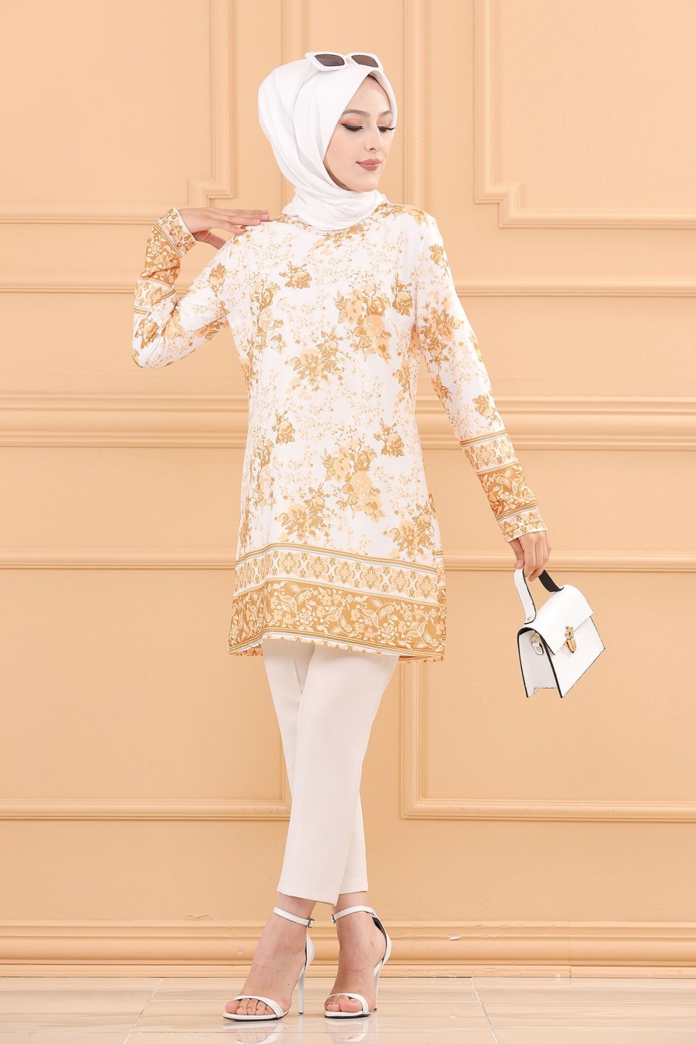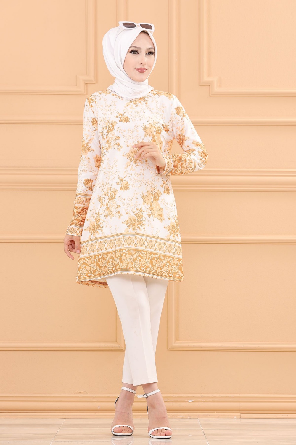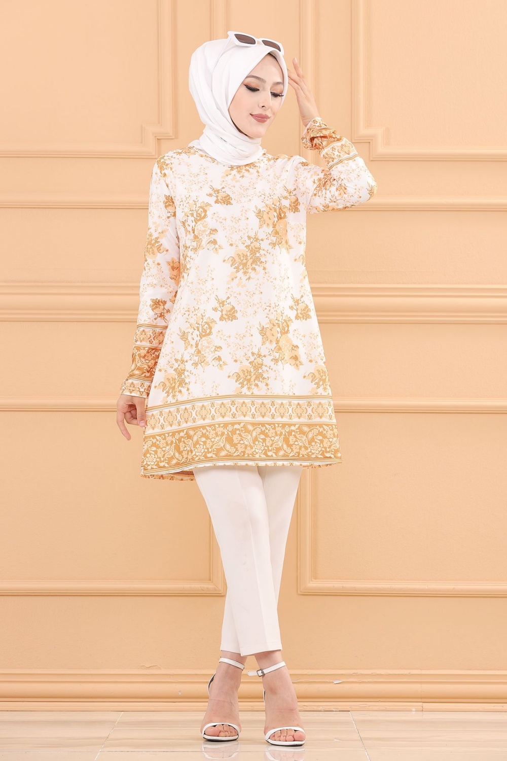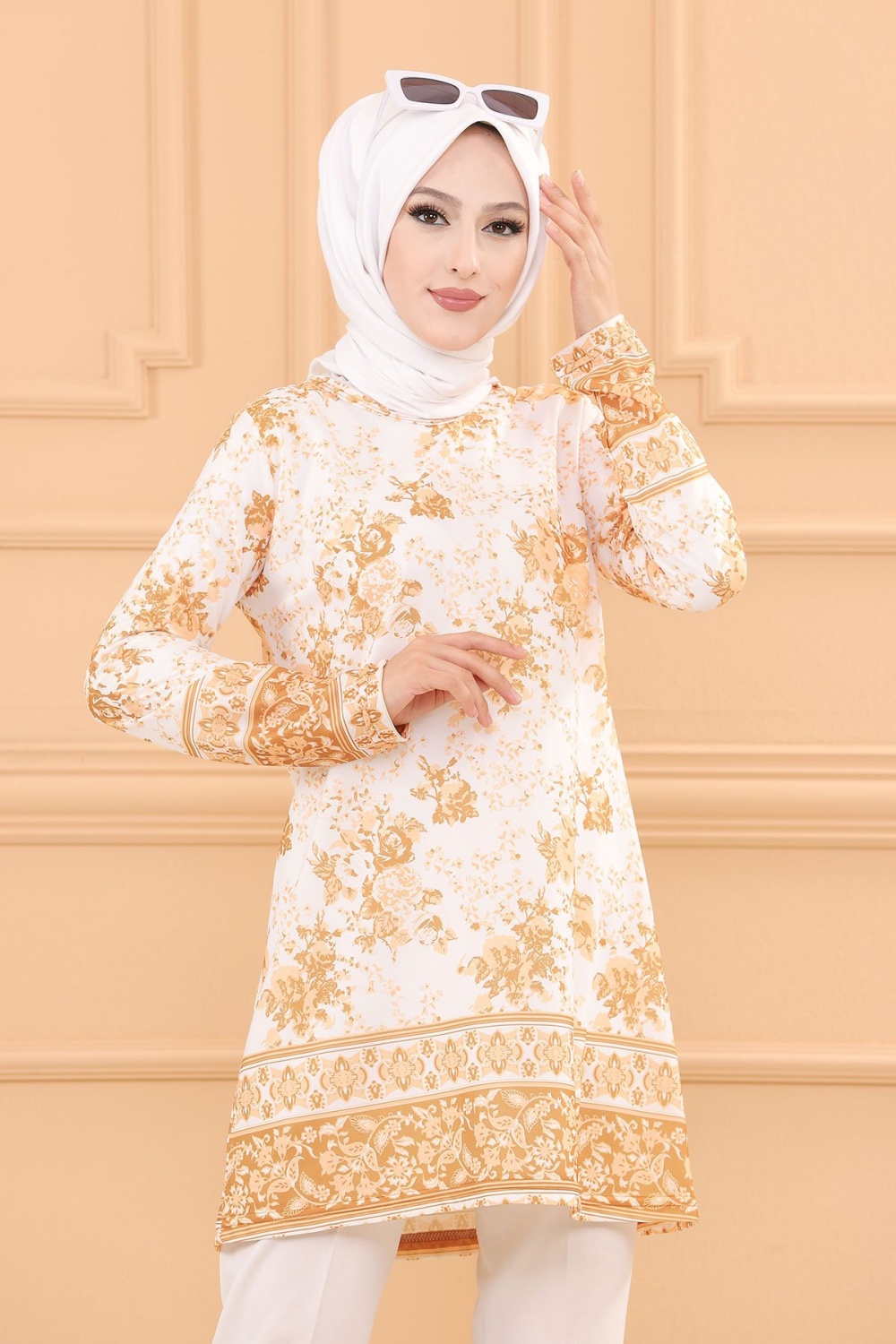 Tunique motifs fleurs et arabesques pour femme (Vêtement Hijab Chic) - Couleur vison Vetement & Accessoire