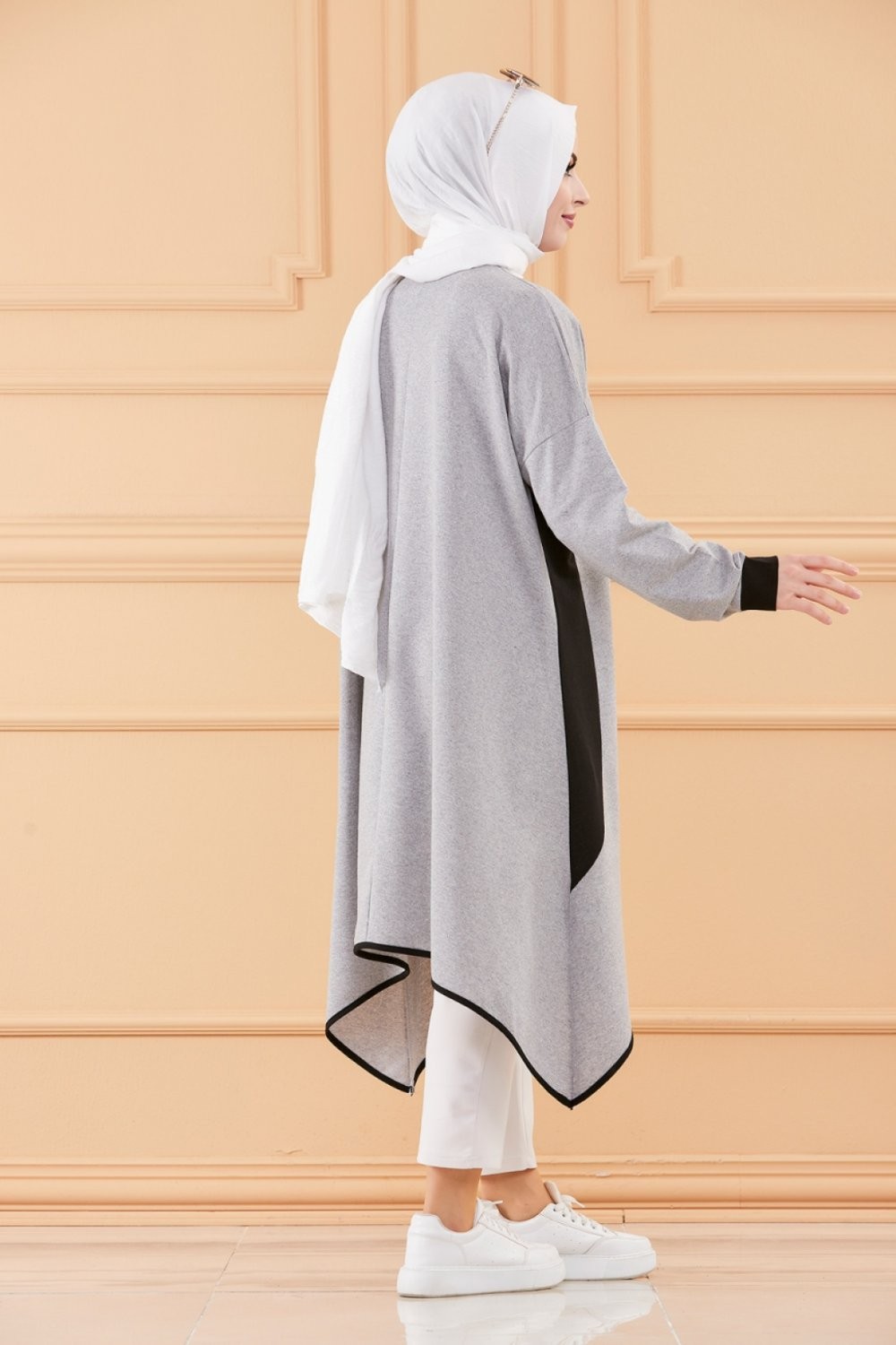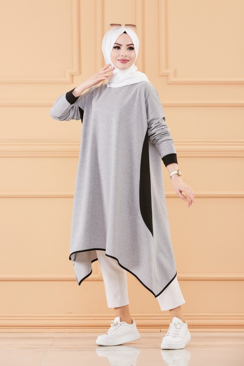 Tunique décontractée avec capuche (Tenue moderne pour Hijab) - Couleur gris clair avec bandes blanches - REF. 35610 (19.00 €)