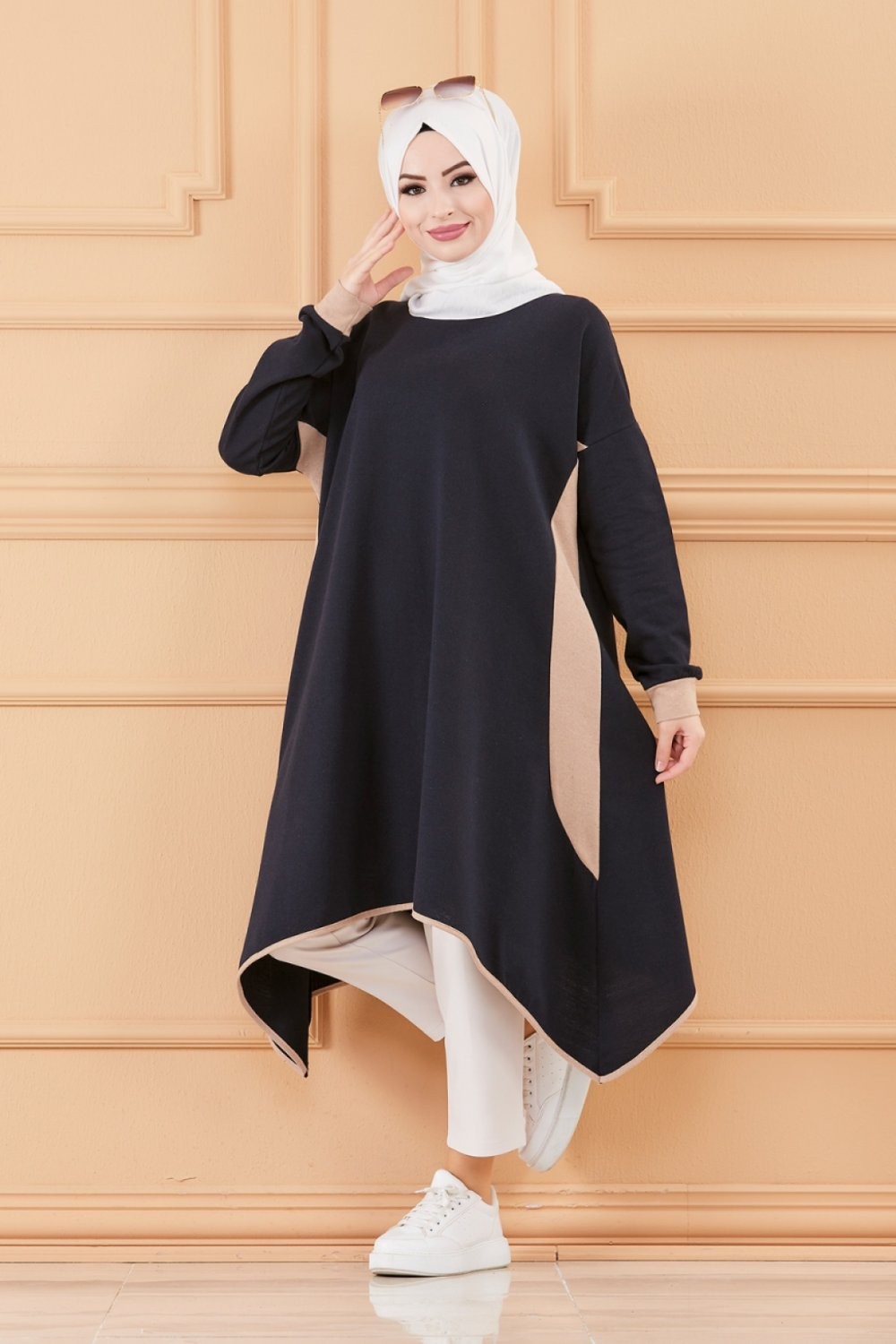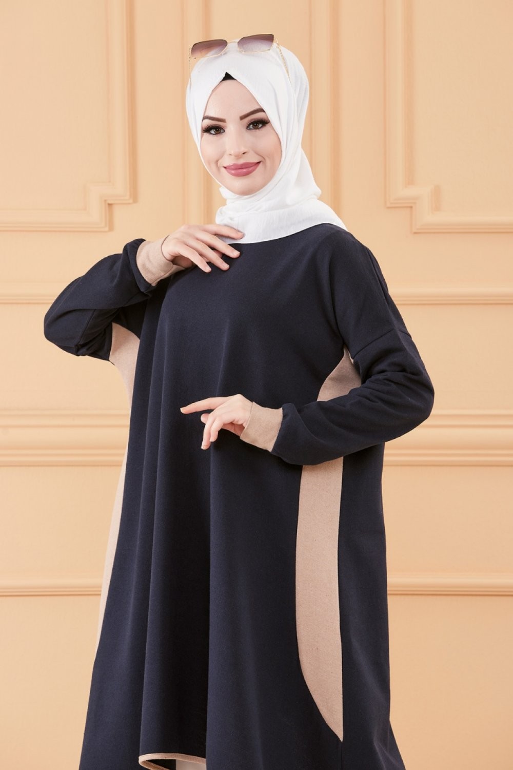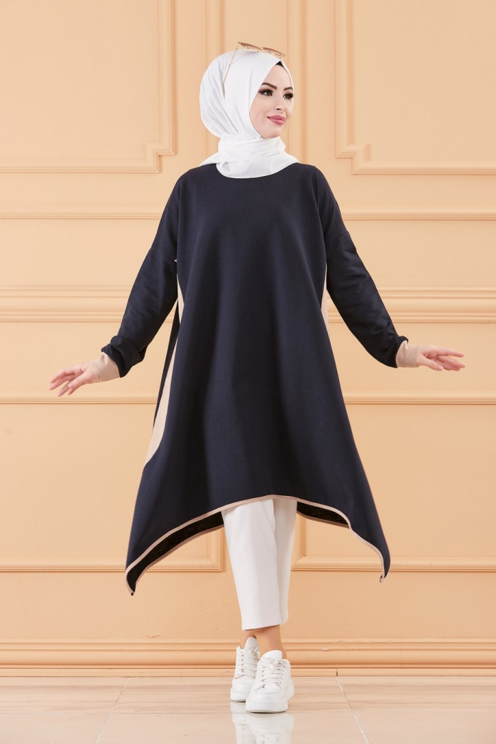 Tunique oversize pour femme (Vetement ample Modest Fashion) - Couleur Bleu marine et beige