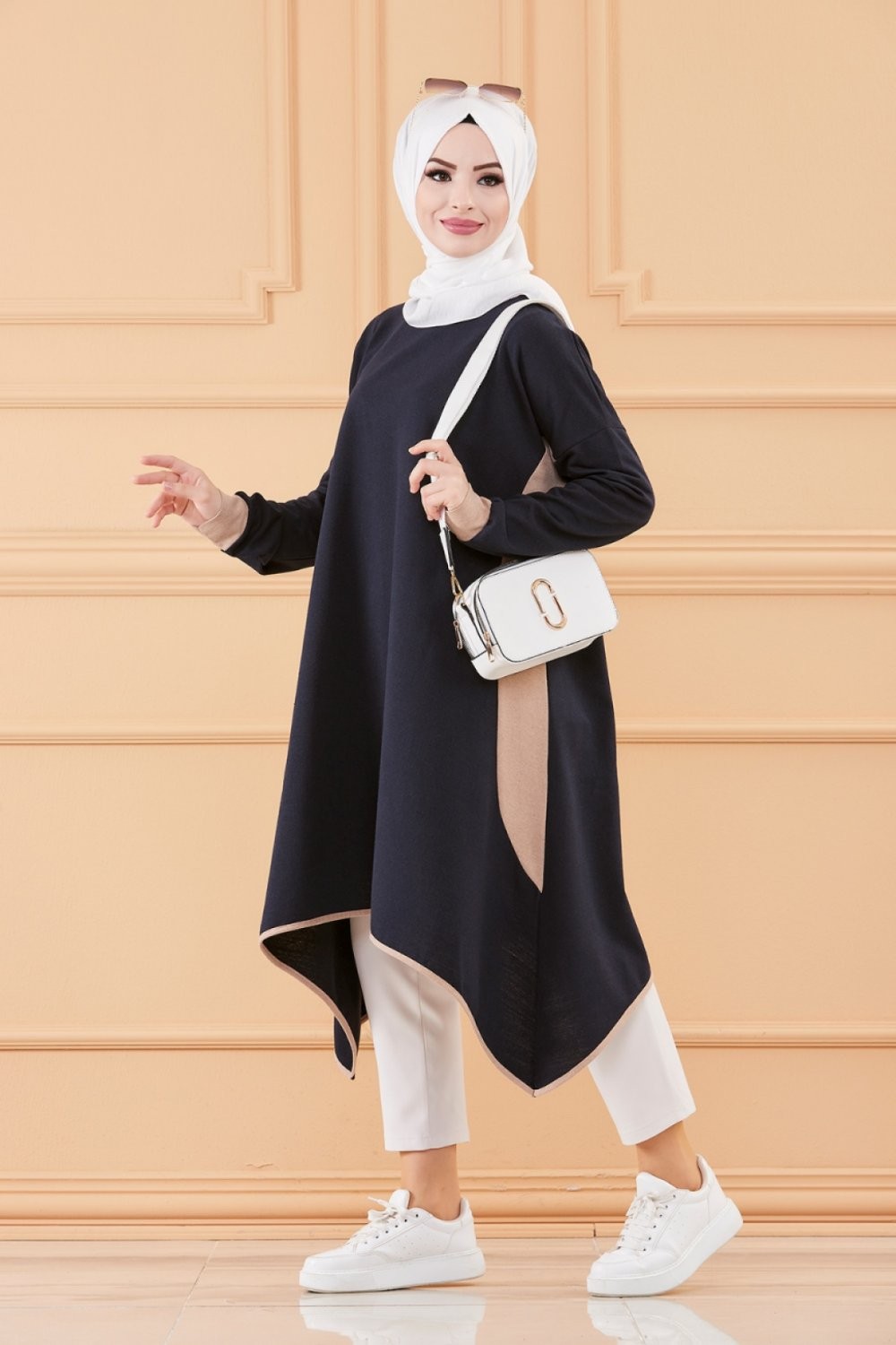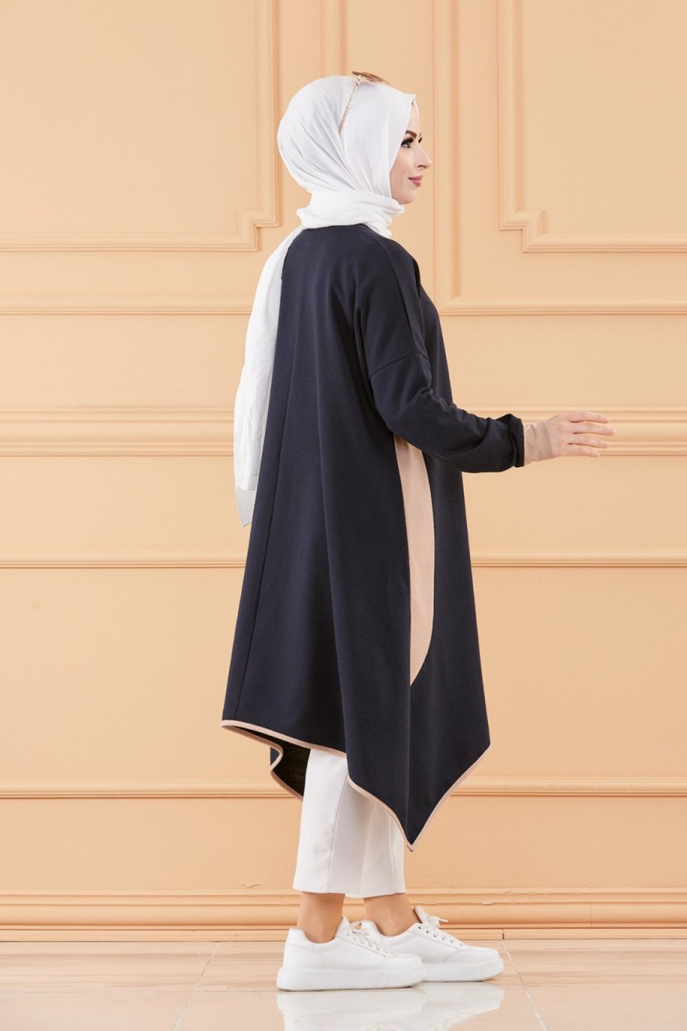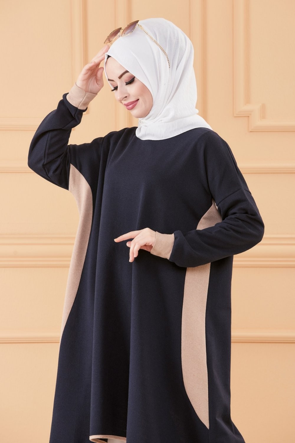 Tunique oversize pour femme (Vetement ample Modest Fashion) - Couleur Bleu marine et beige