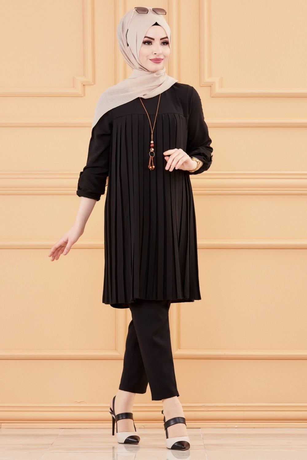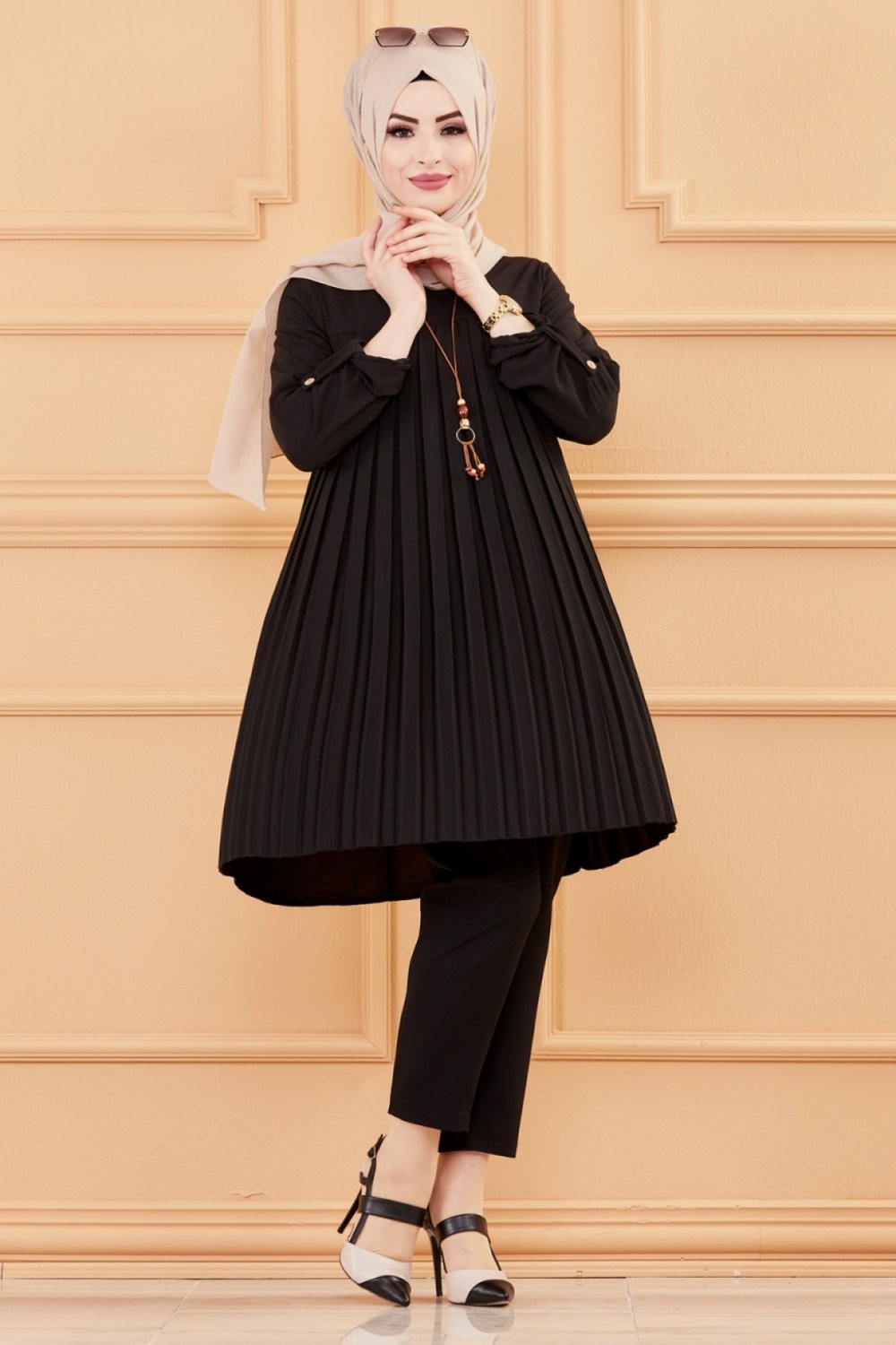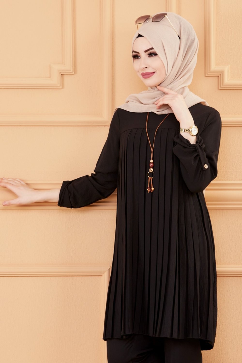 Tunique plissee style habille pour femme (Vetement elegant pour hijab - Nouveautes 2025) - Couleur noir