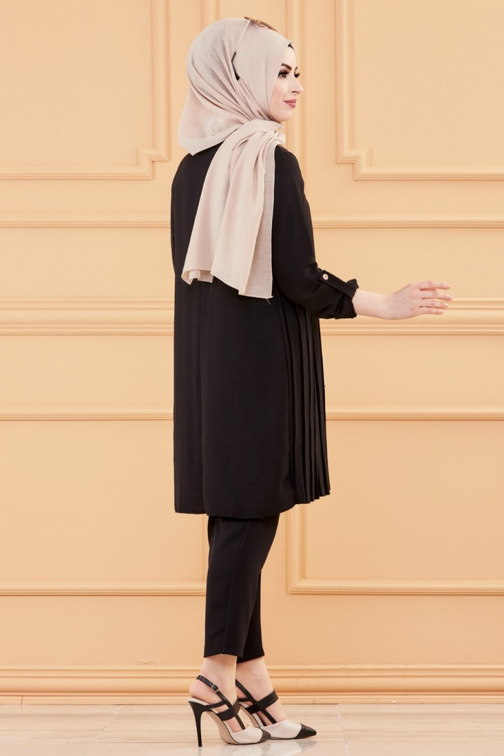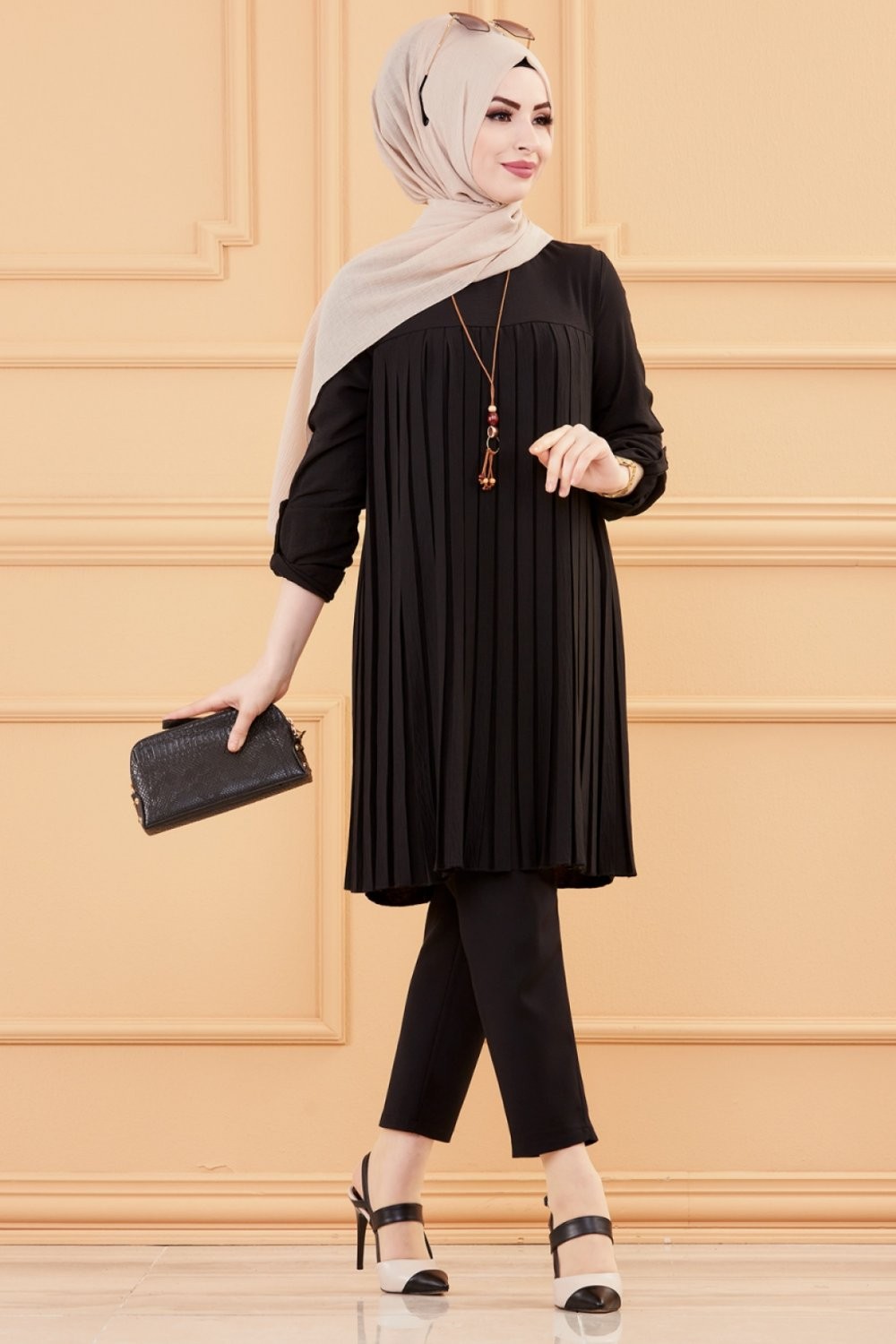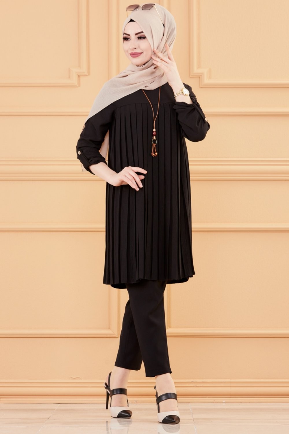Tunique plissee style habille pour femme (Vetement elegant pour hijab - Nouveautes 2025) - Couleur noir