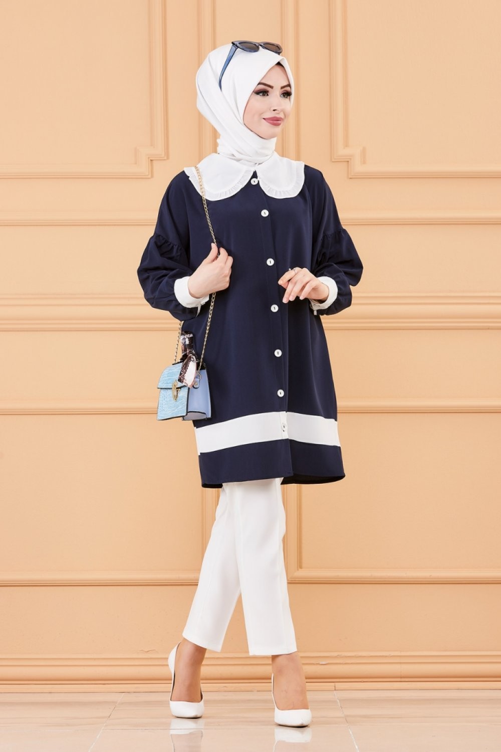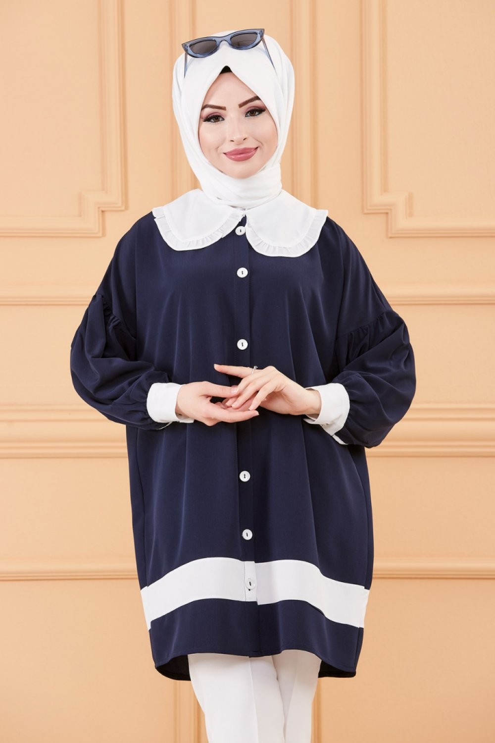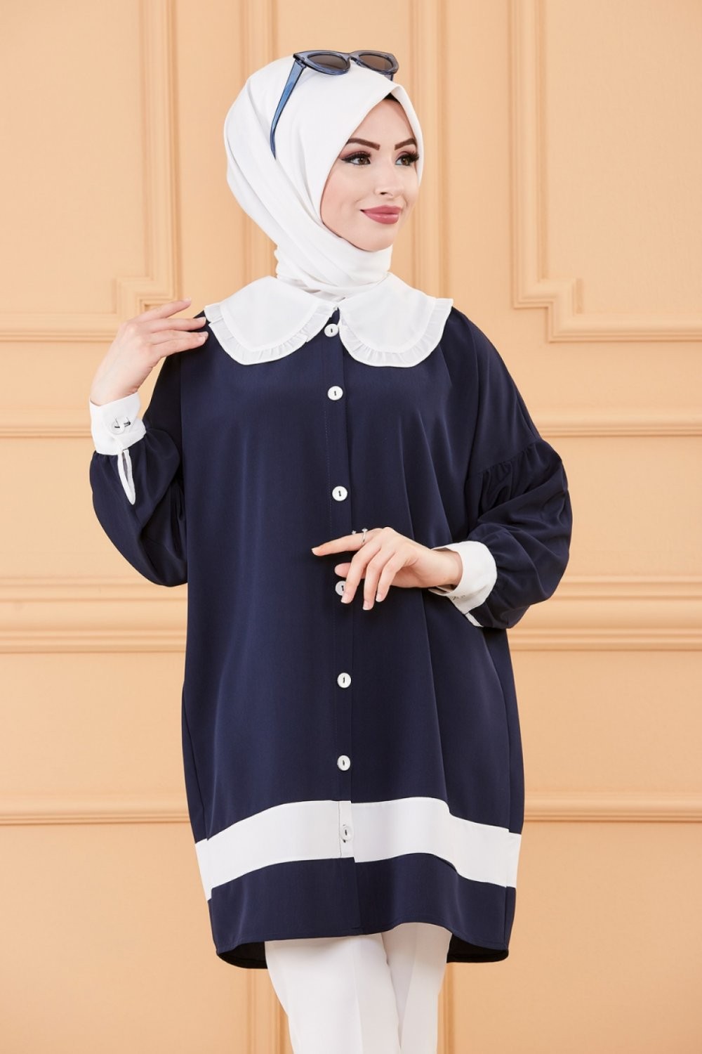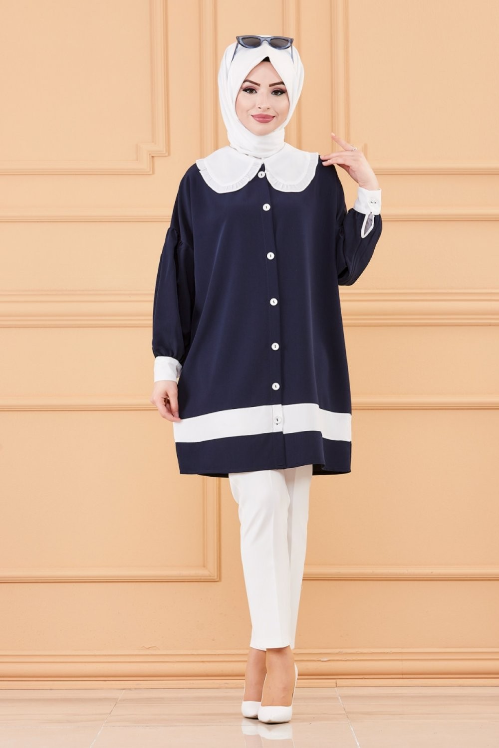 Tunique style habille pour femme (Vetement chic pour hijab) - Couleur bleu marine et blanc